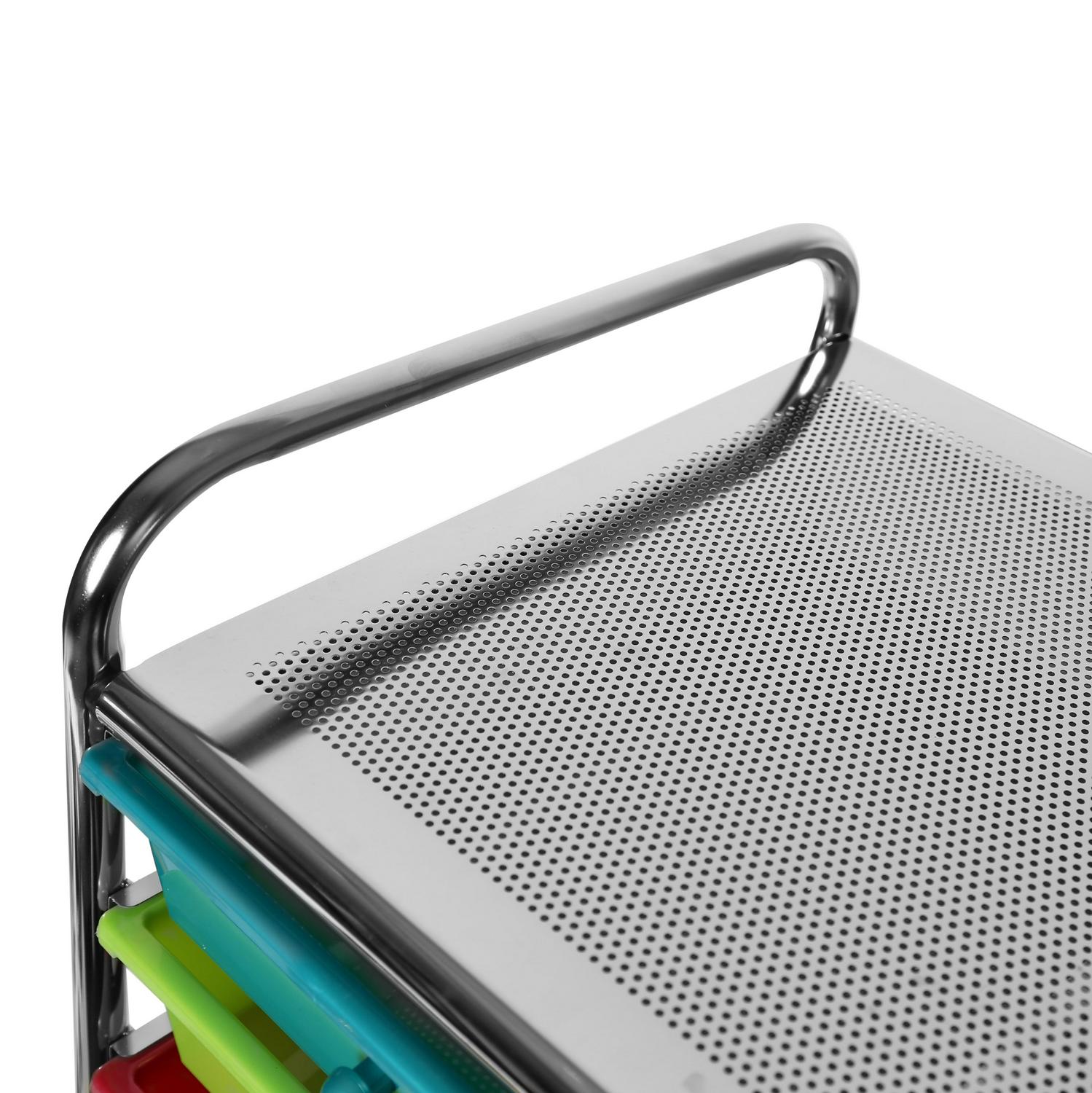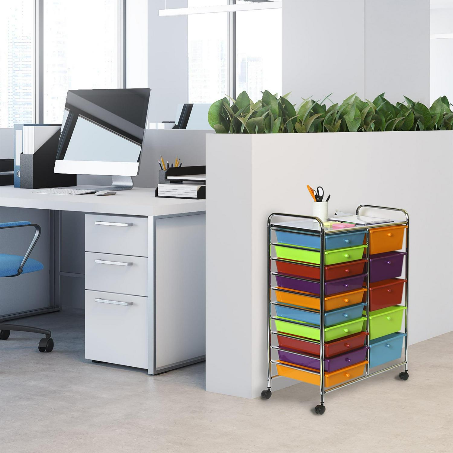 Save space with Seville Classics 15-Drawer Organizer Cart. Constructed with industrial-strength tubular steel finished in chrome, the cart features tall, easy-to-grab handles and a removable perforated steel top shelf. Cart includes 15 removable polypropylene drawers in pearlescent multi-color with chrome drawer pull knobs. Get organized with 10 smaller drawers and 5 large drawer bins, making it perfect for storing both lightweight and bulky supplies. The interior of each drawer measures 15.2 inches long and 11.25 inches wide–deep enough to hold a ream of printer paper with space to spare. Each drawer can hold up to 3.3 lbs. while the top shelf can withstand up to 16.5 lbs. Remove drawers and re-order them as needed for an organization solution that works for you. Use it as a makeup organizer or as arts and crafts storage. Fill it with notepads, binders, staples, and other supplies next to your desk as an office storage cart. The cart includes four 1.5-inch casters with two that lock, so the cart goes where you need and stays where you put it. This convenient organizer is ideal for use in the dorm room, classroom, office, bedroom, bathroom, kitchen, garage or workspace.