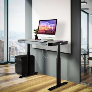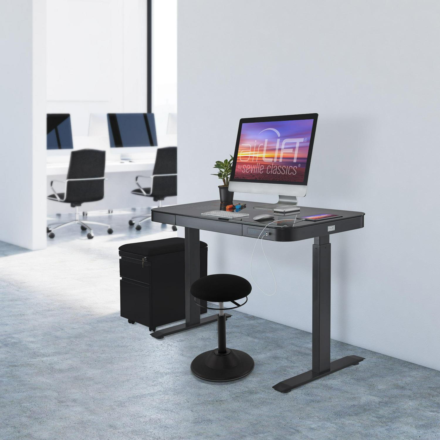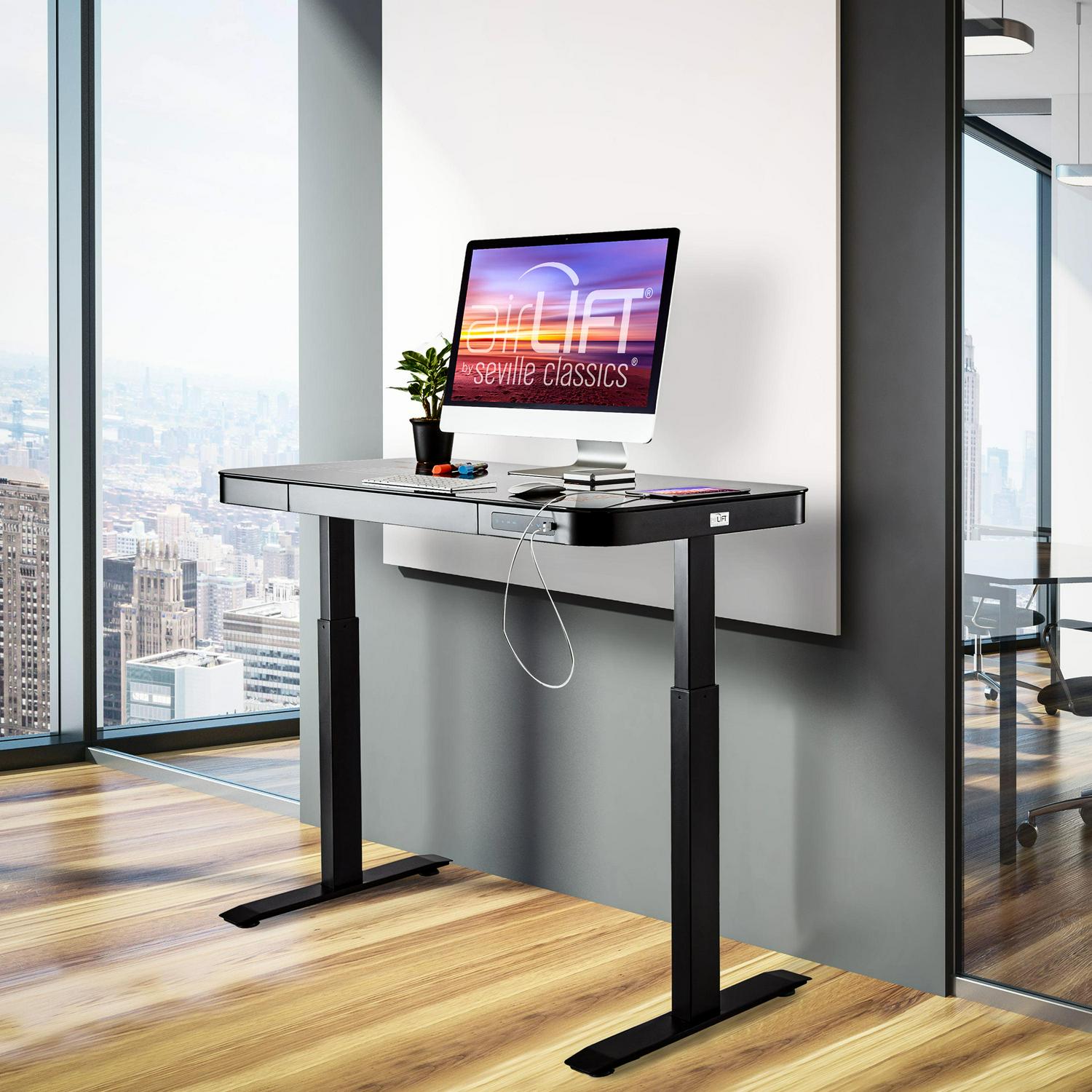 Upgrade your workspace with Seville Classics AIRLIFT Electric Standing Desk with Dual USB chargers. Lift the desk from 29 inches to 47 inches high with a press of the AIRLIFT touch controller. Store up to three height setting for easy, reliable. Keep your phones and tablets charged up with powered dual USB ports. Each port supplies power at 2.4 amps, so you can 2 high-powered devices (like the iPad or iPhone) simultaneously. Organize your things in the pull-out storage drawer. A single divider lets you separate accessories pens and markers from larger items like iPads and stationary. Patents: US Pat. D880,200 and other US and International Patents Pending.