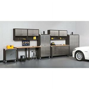 The Seville Classics UltraHD 2-door Rolling Cabinet is an ultra-heavy-duty, steel cabinet with an interior shelf, two locking doors, grab handles and bottom corner bumpers. This roller door cabinet has ample storage space for all your tools, supplies and other belongings. The two locking casters can be adjusted to make the cabinet moveable or stationery. You can roll up the cabinet doors to access the tools and use the solid hardwood top for effective layout of all supplies. Unit measures 28″ W x 18″ D x 34.5″ H.