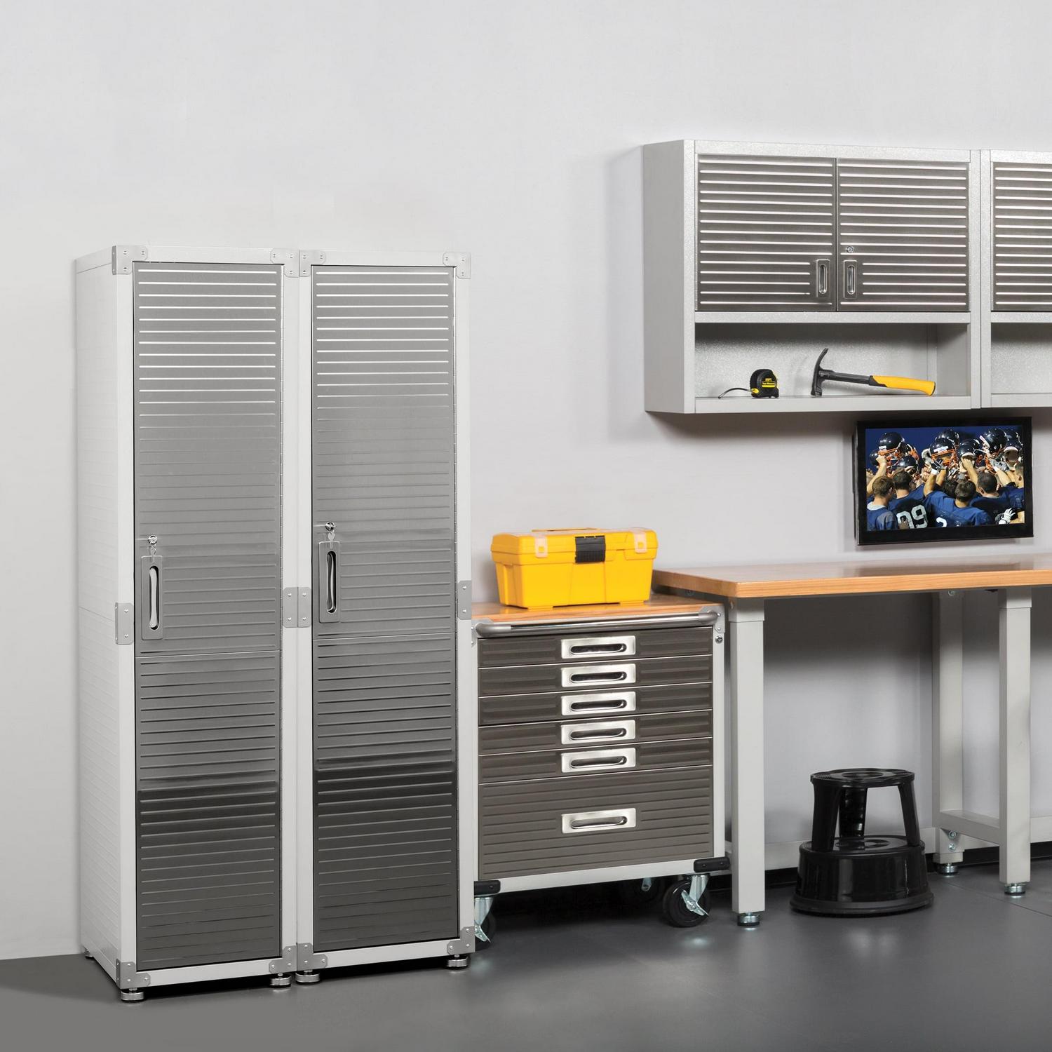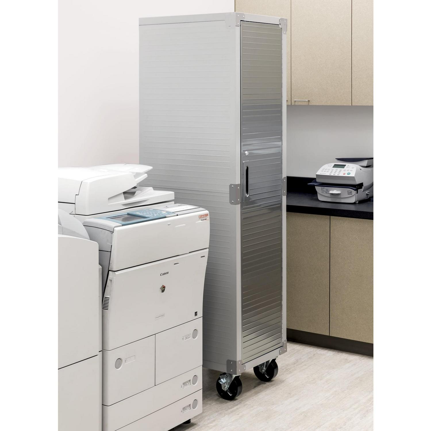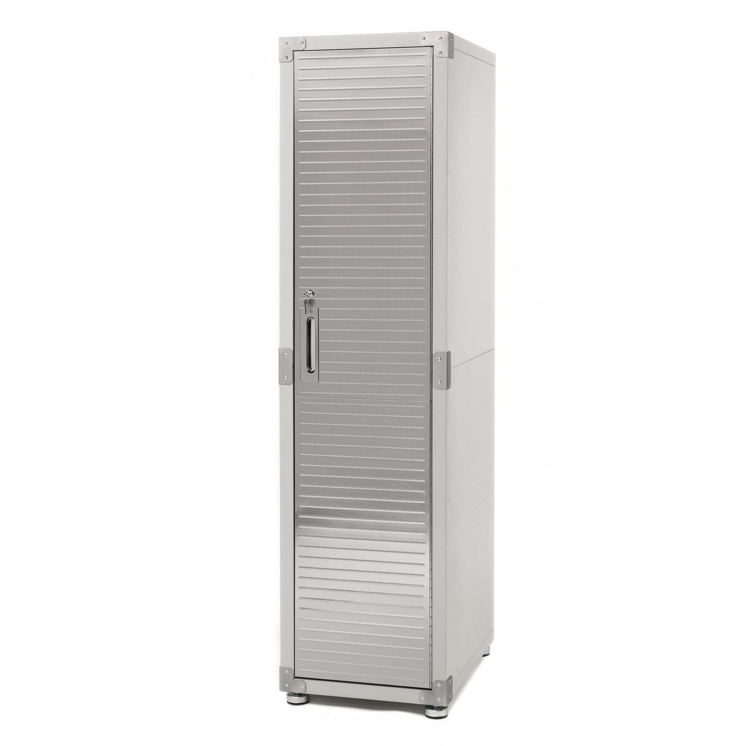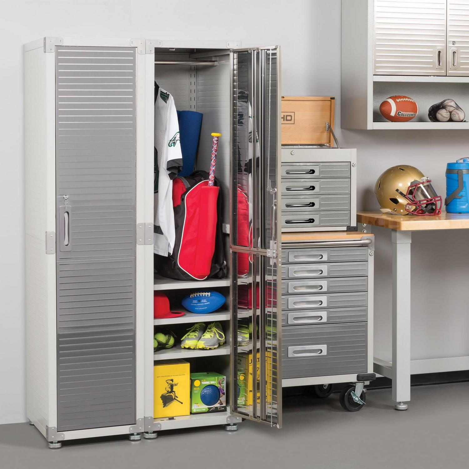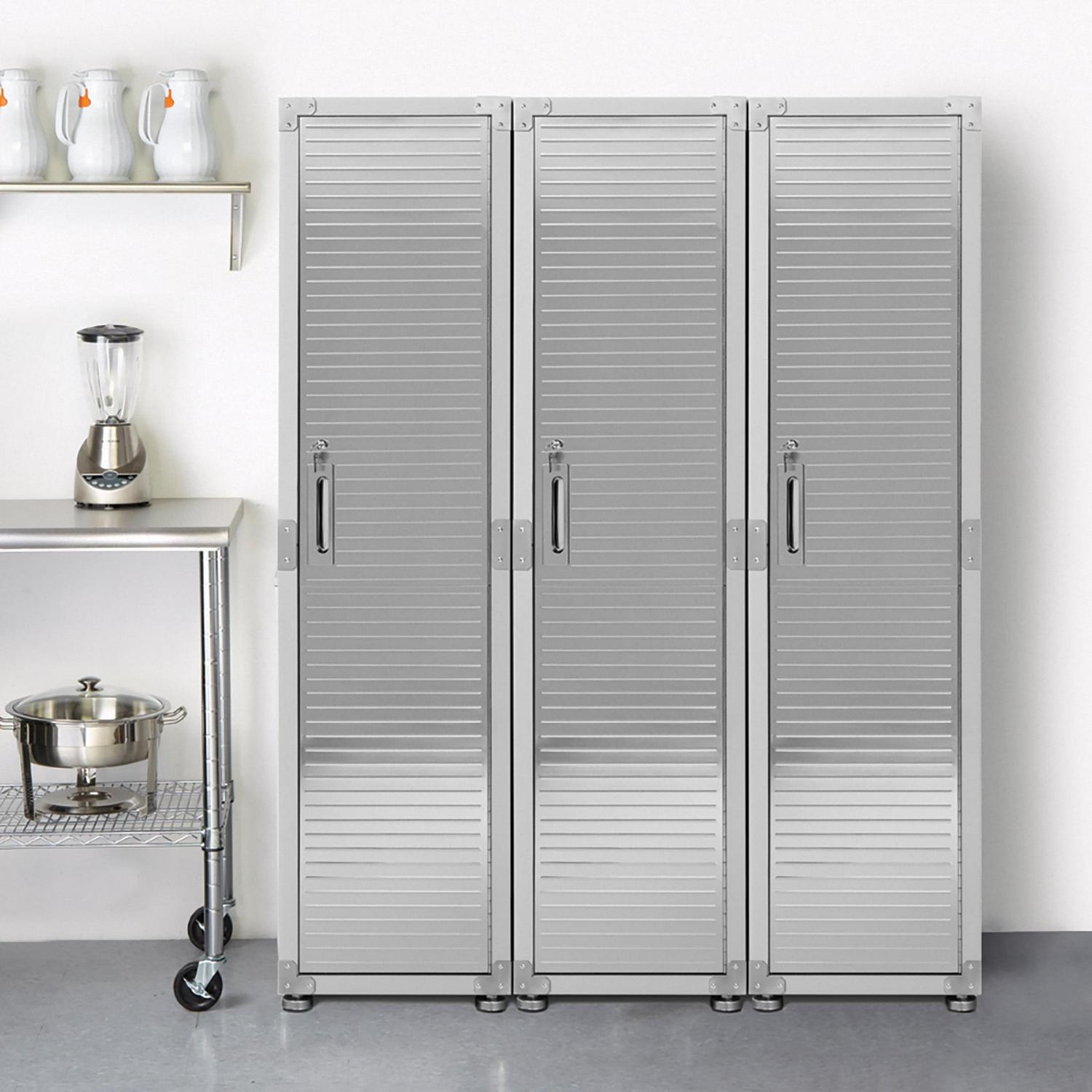 Seville Classics new UltraHD Commercial Locker Gear Cabinet is constructed with commercial-grade steel with ventialted body panels and a hanger bar for uniforms, work equipment, costumes, gym clothes and more. Store up to 100 lbs. per shelf (400 lbs. total) evenly distributed across four shelves (3 height-adjustable at 1-inch increments). A lockable stainless-steel door with keys and magnetic door latch that is finished in UltraGuard fingerprint-resistant coating.