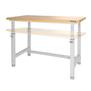 – ADJUSTABLE HEIGHT TOP WORK TABLE – Get to work on a 1.5″ thick solid wood surface that can be adjusted between 37.5″ and 42″ high at 1.5″ increments. Designed for heavy-duty to accommodate power tools, mounts and clamps safely.