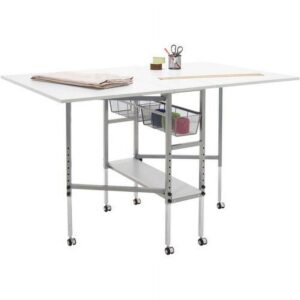 The Sew Ready Hobby and Cutting Table folds easily and has casters for quick storage when not in use. When fully extended this table offers a large work surface that is 60 inches wide and 36 inches deep making it ideal for spreading-out, cutting or adjusting fabrics and patterns. Wire mesh drawers and a bottom shelf offer storage for sewing or craft supplies. The height can be adjusted from 30.25 inches to 39.25 inches to provide back relief while standing during long projects. The versatility of this table makes it perfect for: cutting fabric, craft or hobby projects or as a general extra workspace.