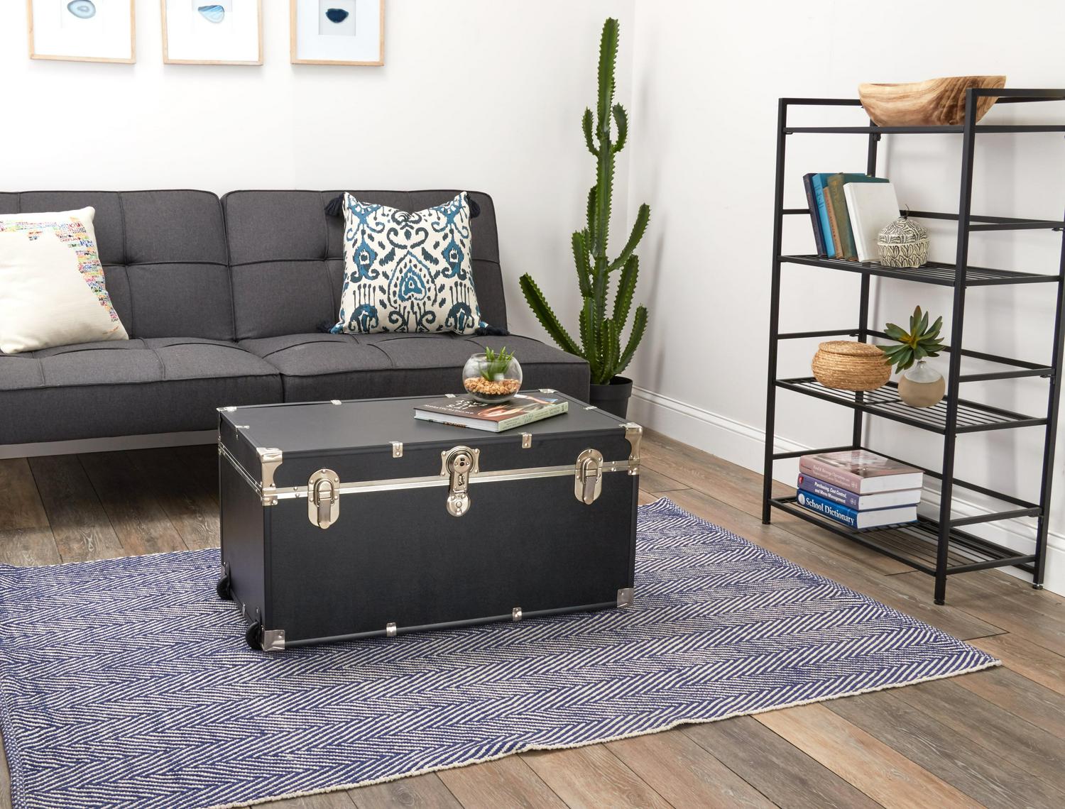The Seward Traveler 31″ Trunk adds classic style and discreet storage to any room in your home. The traditional storage trunk design allows you to store bulky linens, seasonal clothing and decor and more, out of sight. In addition to classic nickel hardware and black binding, the Traveler 31″ Trunk features durable wheels and a side handle for easy maneuverability, dual lock-down latches to help keep moisture out and a center push-button latch with a locking feature (includes keys). You can also add a padlock for additional security (not included).