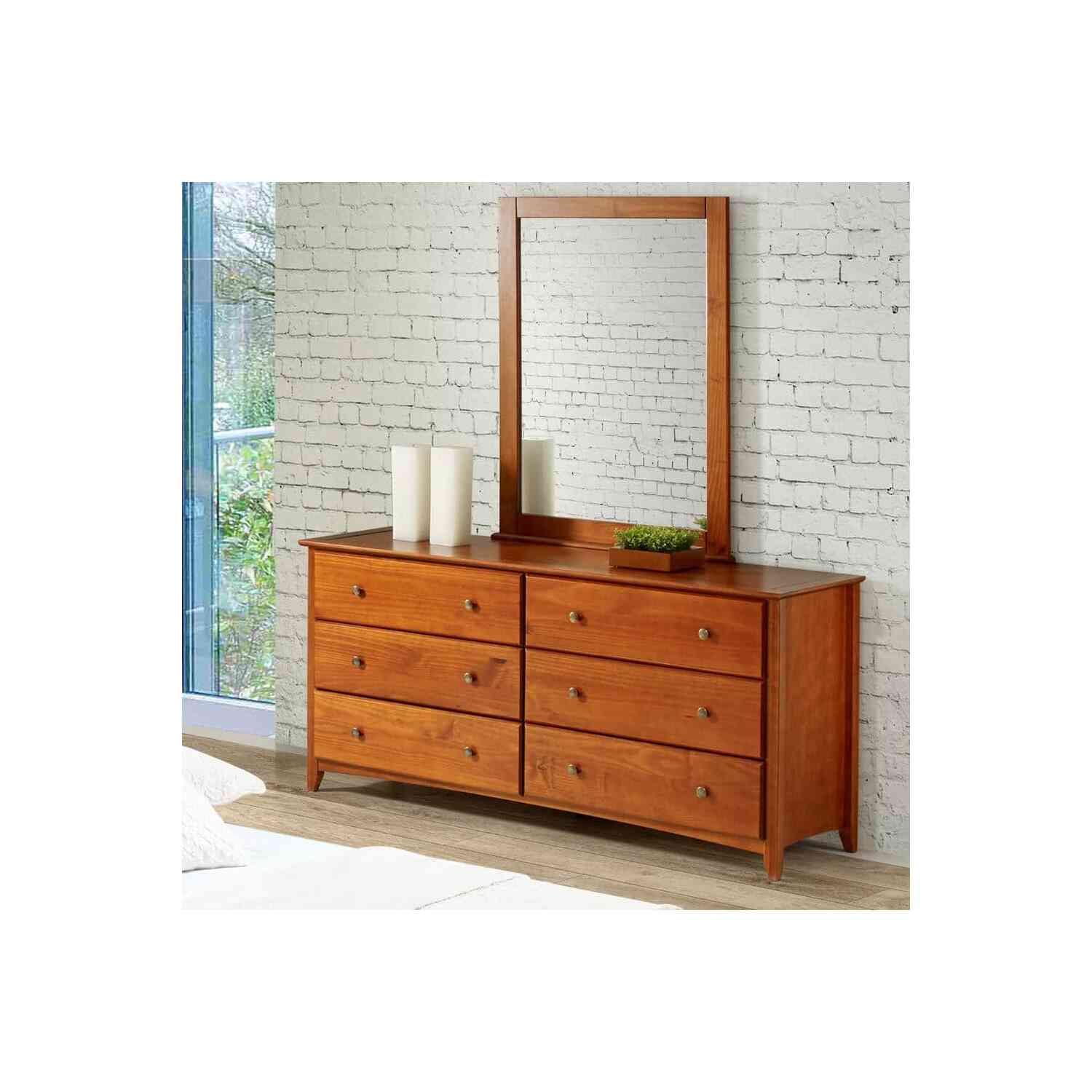 Camaflexi’s Shaker Style Six Drawer Chest is perfectly designed to provide you with the storage that you need! Featuring six deep, extra generous size drawers and constructed of elegant pine wood with a rich protective cherry finish that enhances the natural beauty of the grains. The traditional Shaker style is beautiful and timeless, lending the perfect touch to your bedroom. Antique style metal drawer knobs further enhance its beauty. Add our matching Shaker Style Mirror (sold separately) to perfectly complement this dresser. Sturdy and durable, this piece is built to last the quality and workmanship you ve come to expect from Camaflexi. Concerned for the environment, all Camaflexi furniture is eco-friendly and crafted of Solid Pine Wood sourced from renewable pine plantations.