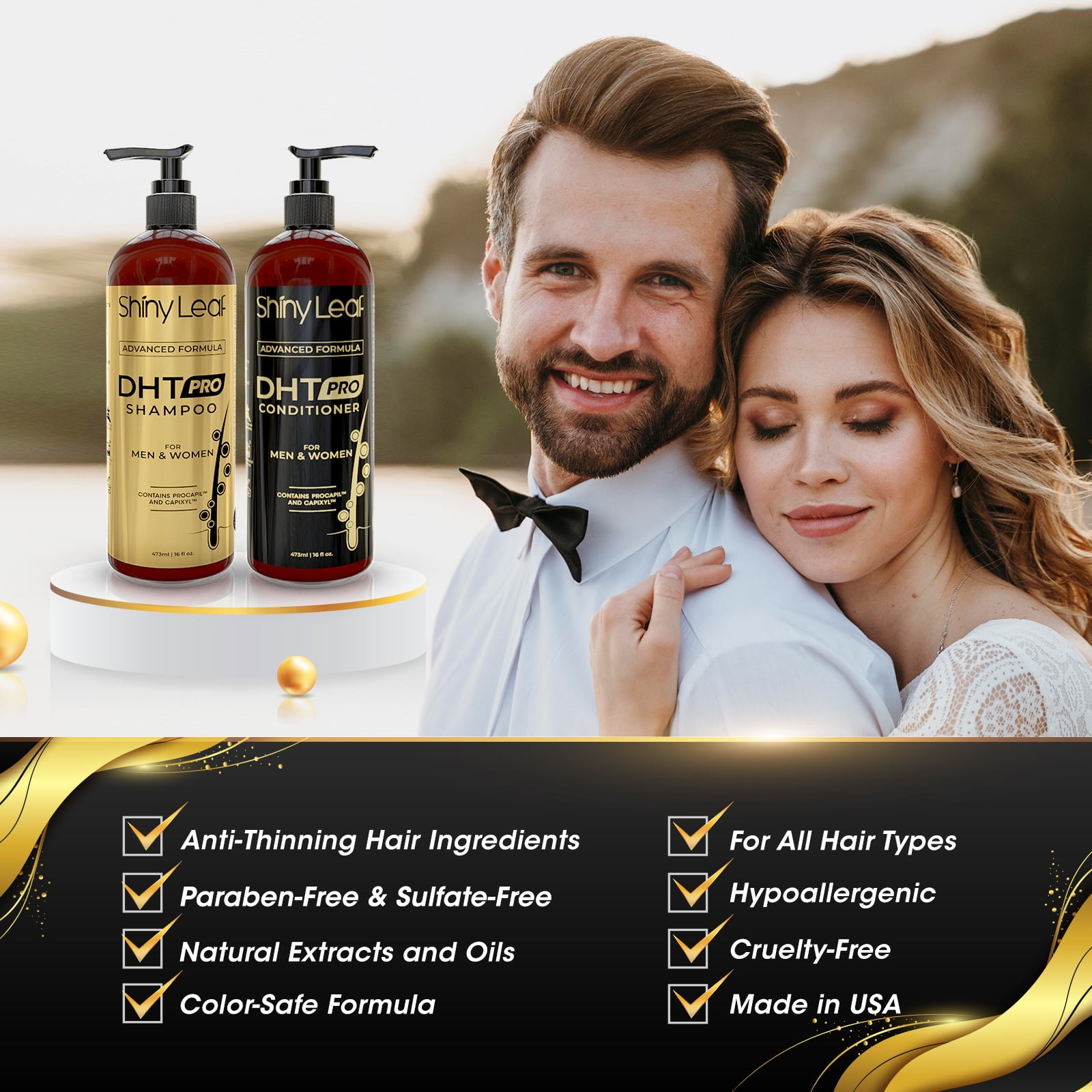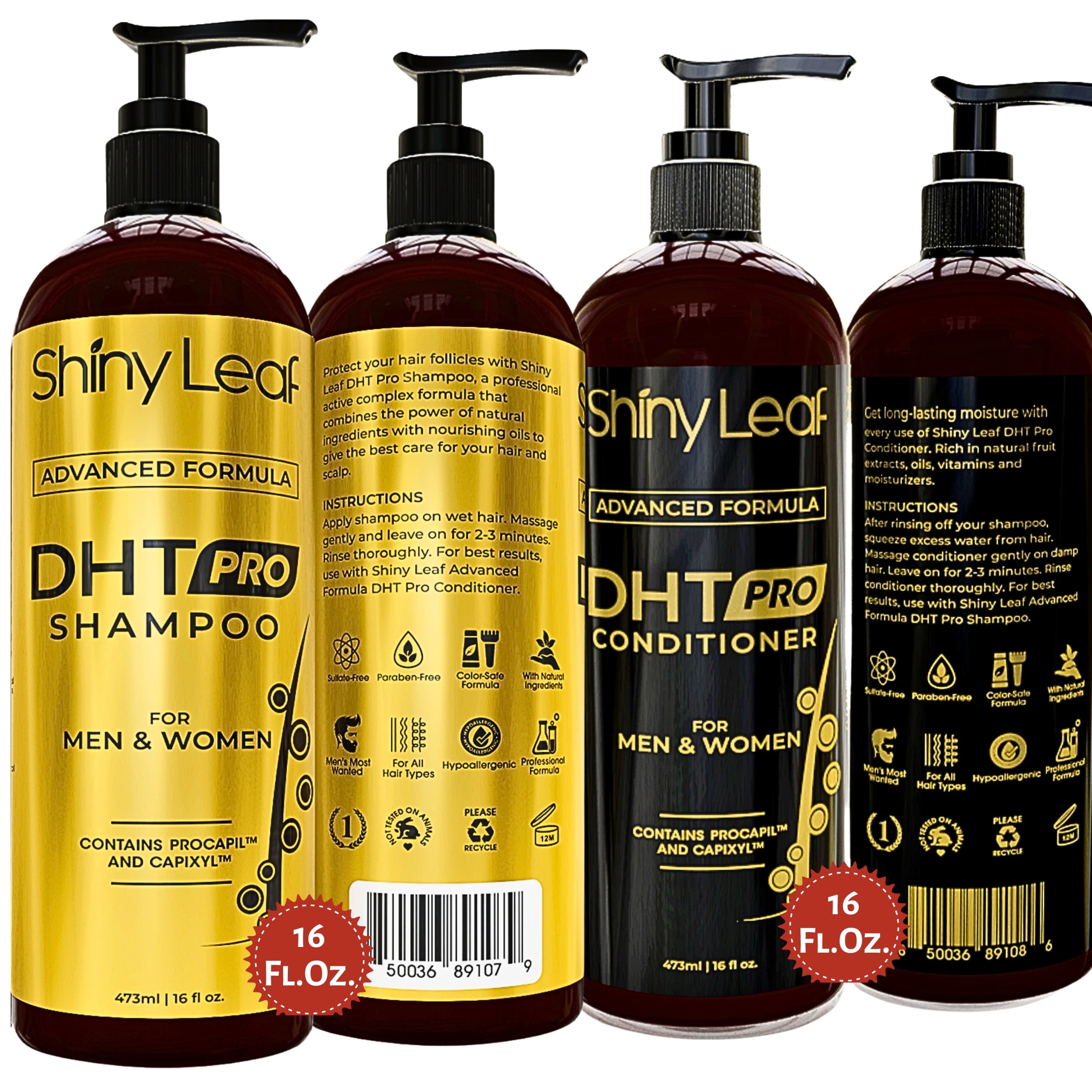 POWERFUL ANTI-HAIR LOSS FORMULA – We have created the most advanced formula for fighting hair loss and promoting hair growth by combining a mixture of ingredients that are backed by science. This pair of haircare products are professionally crafted using Procapil and Capixyl formulas. They are made with a combination of natural ingredients scientifically known to be effective in fighting hair loss. ENRICHED WITH NATURAL DHT BLOCKERS – For a deeply nourishing care, we added natural extracts from various plants. These extracts are known to stop hair loss by blocking DHT from the hair follicles. Enjoy the benefits of essential oils and botanical extracts with each use. GREAT FOR MEN AND WOMEN – Hair loss causing hormone DHT is present in and can affect both men and women. The Shiny Leaf DHT Pro Shampoo and Conditioner set is great for men and women who might be experiencing signs of hair loss such as thinning hair, hair fall, and weak strands. MOISTURIZING SHAMPOO AND CONDITIONER – This shampoo and conditioner has a moisturizing formula that makes your hair soft and smooth after each use. It is packed full of natural hydrating ingredients that provide each strand long-lasting softness and shine for healthy-looking hair. PARABEN AND SULFATE FREE! MADE IN THE USA!