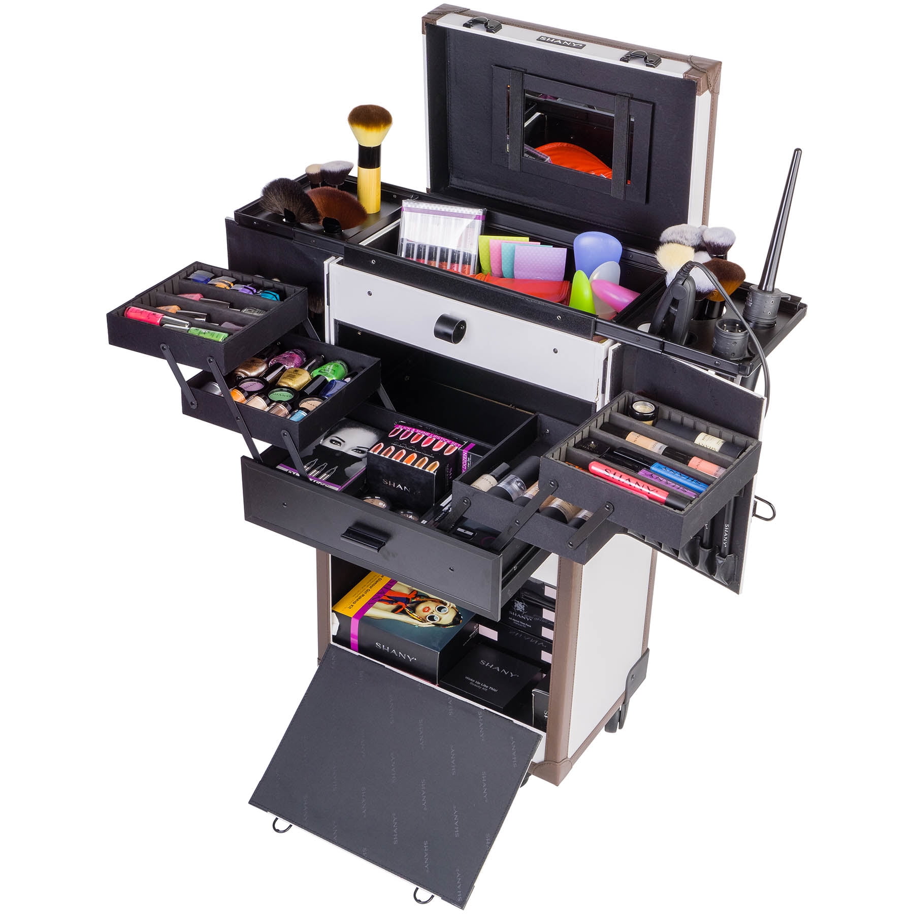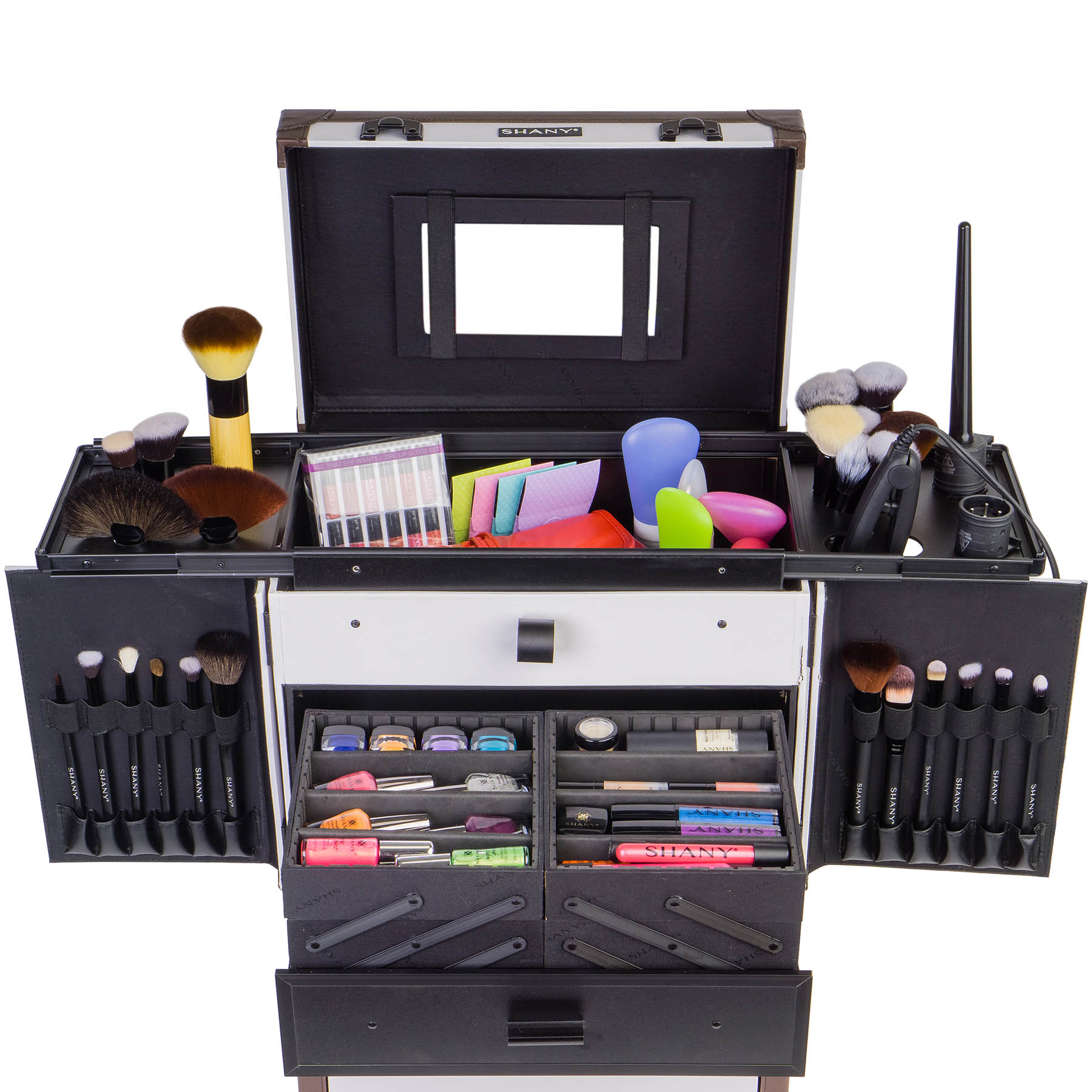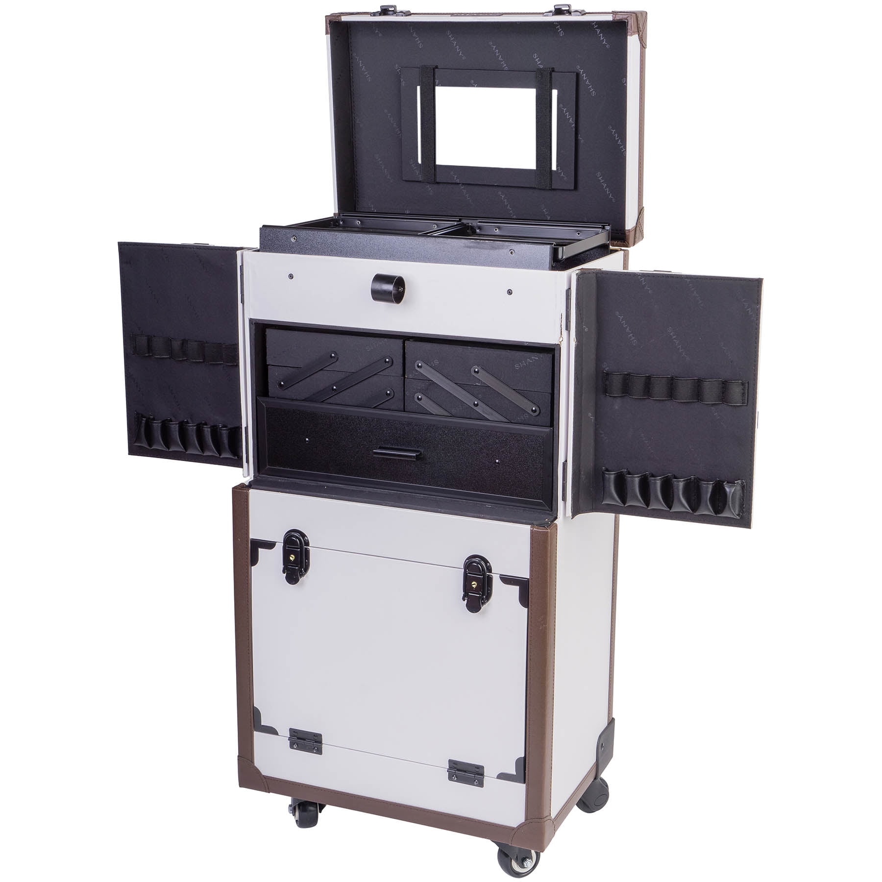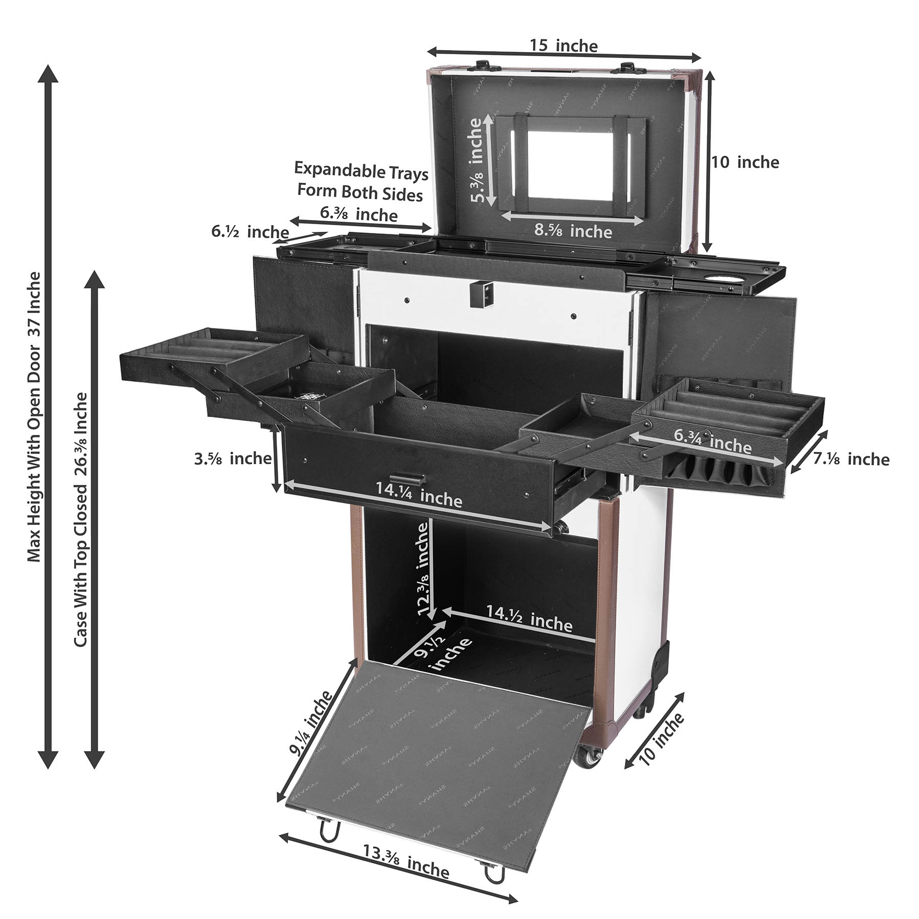 SHANY REBEL ALPHA Series Trolley Makeup Case – White Lockable compartments, mirror & retractable handle. Expandable trays and removable drawers for organizing Lightweight nature and great for travel. Includes a free set of cosmetics organizing mesh bags. Trays: 7.5L X 7W, Front Drawer: 14W X 4L X 7.5H Holds hair electronics, makeup & accessories Ideal for competitions, recitals, and other performances