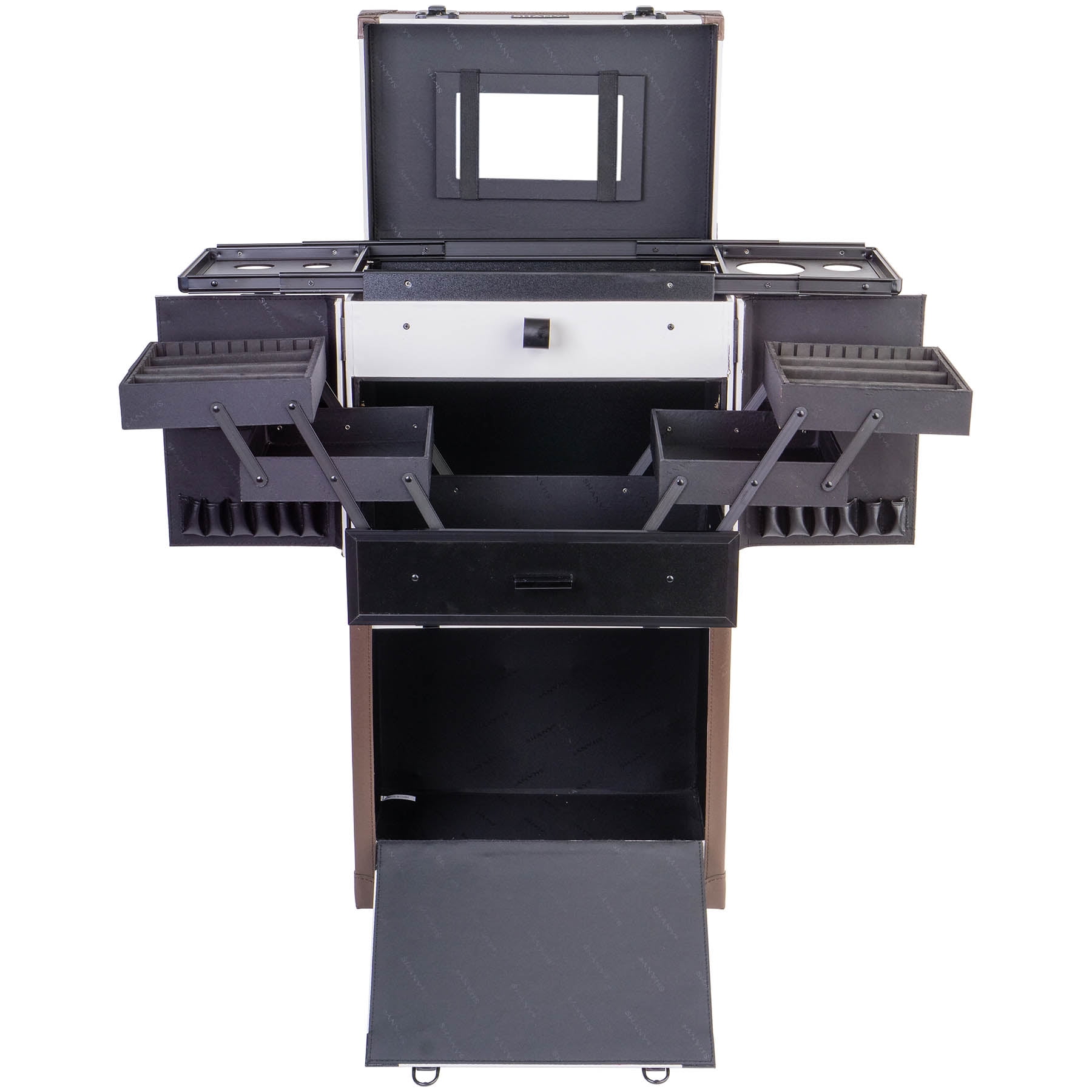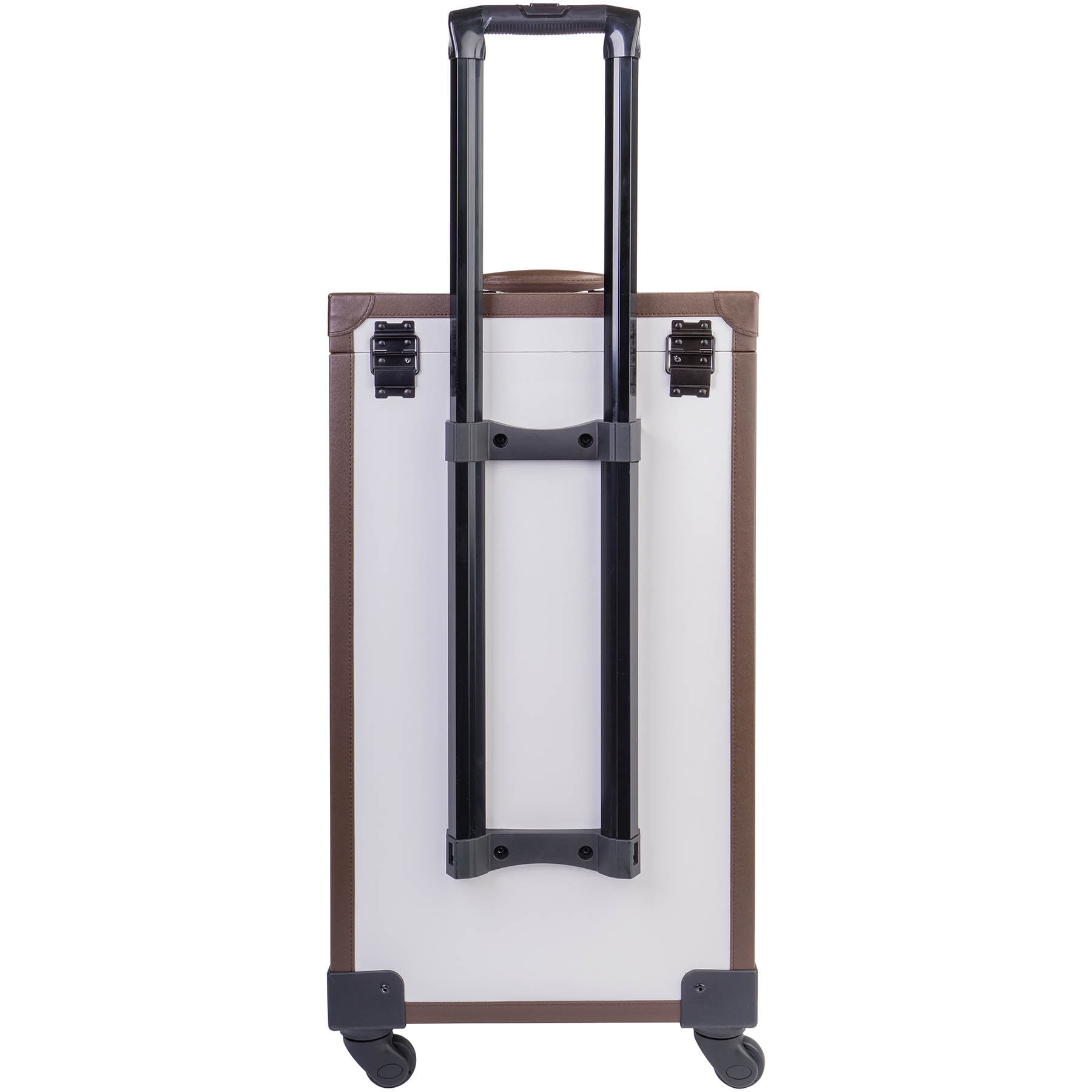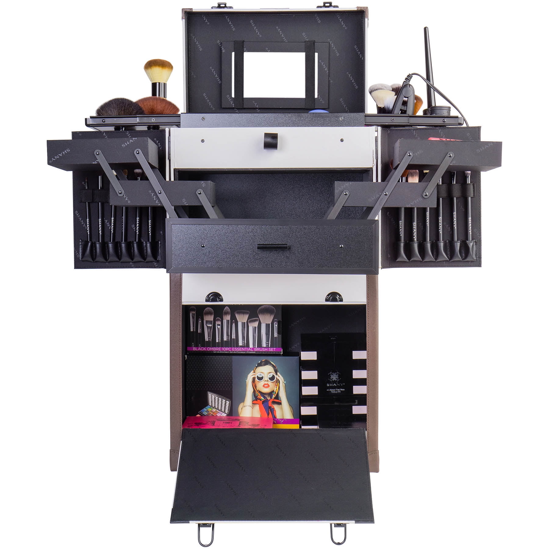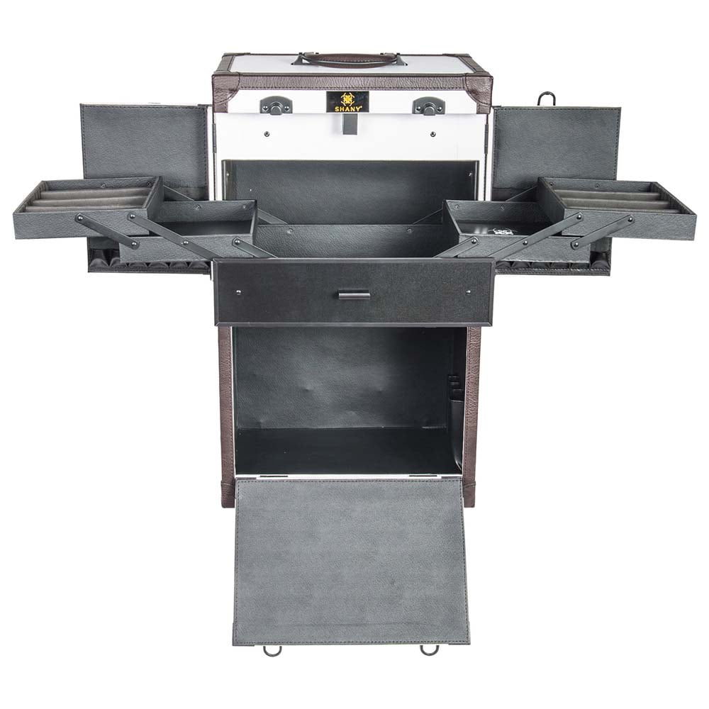 SHANY REBEL ALPHA Series Trolley Makeup Case – White Lockable compartments, mirror & retractable handle. Expandable trays and removable drawers for organizing Lightweight nature and great for travel. Includes a free set of cosmetics organizing mesh bags. Trays: 7.5L X 7W, Front Drawer: 14W X 4L X 7.5H Holds hair electronics, makeup & accessories Ideal for competitions, recitals, and other performances