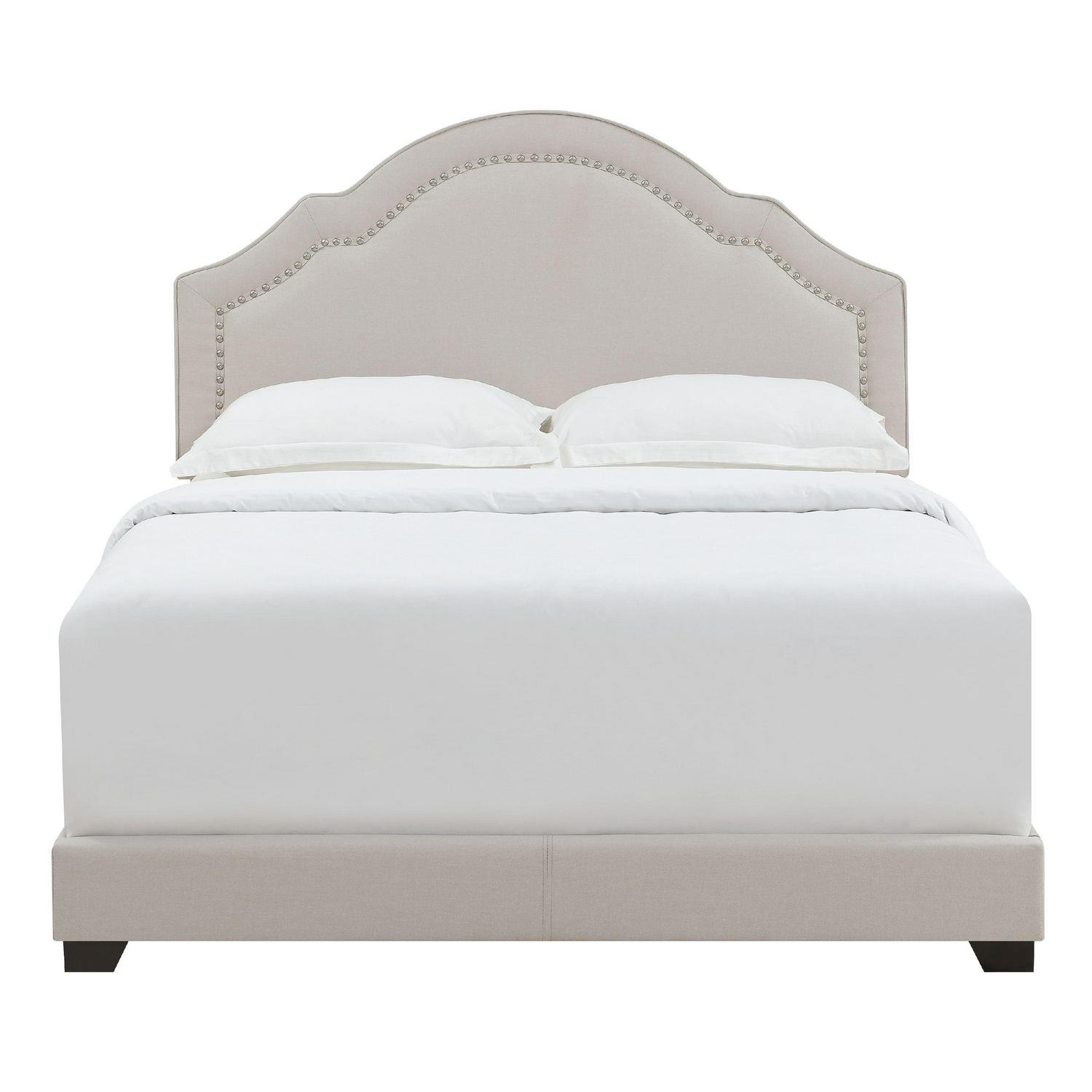Scalloped details meet a classic camelback arch in this beautiful all-in-one upholstered bed. Inset with brushed nickel nailhead trim, the upholstered headboard offers a grand feel to your bedroom, punctuated by the matching side rails and on-trend low-profile footboard. Supportive footed slats are included to support a box spring and mattress – both required and not included – for a superior sleeping experience. This plush, graceful take on a classic bed shape fits into your life as easily as your decor: Innovative hinged side rails make setup and moving even easier.