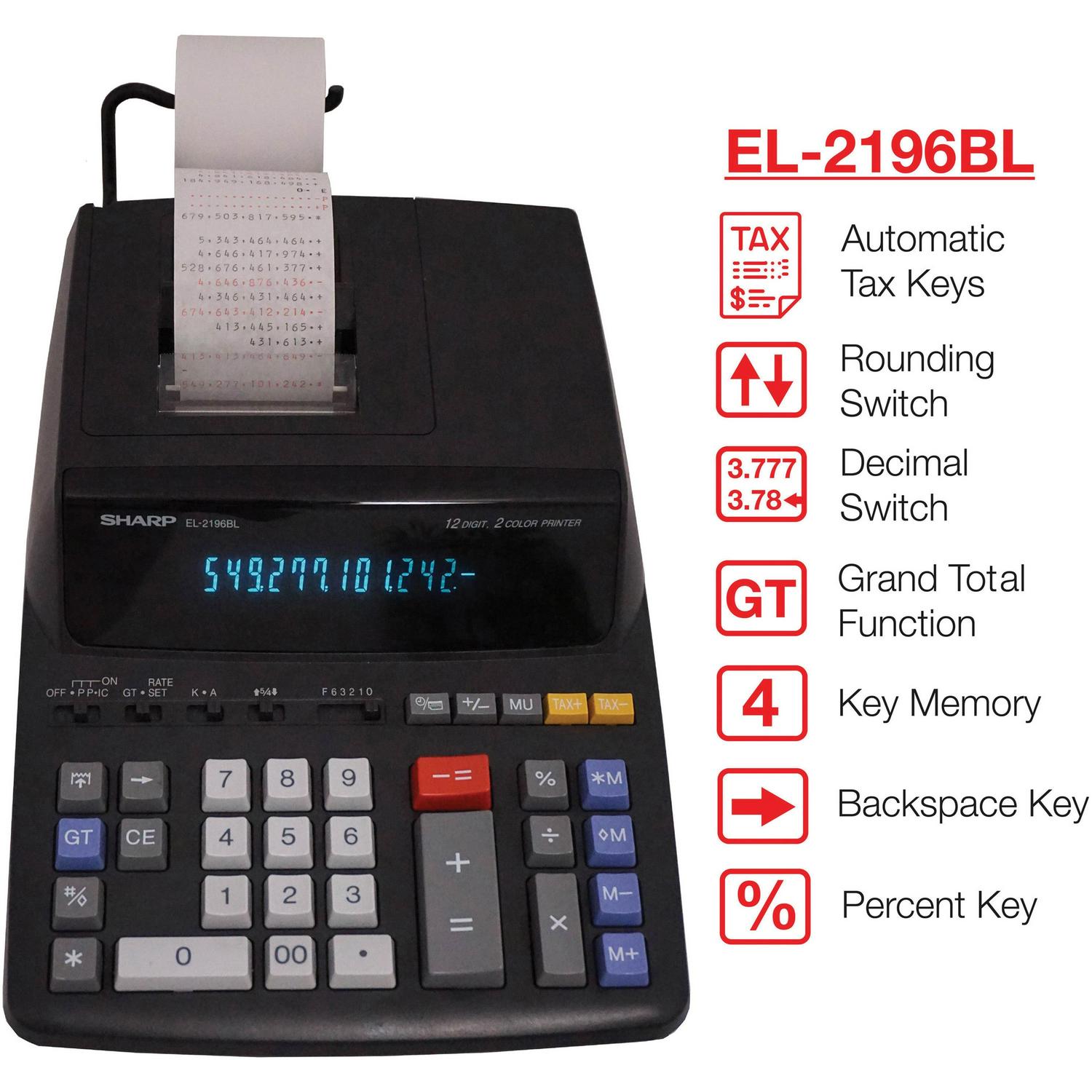 Sharp EL-2196BL 12 Digit Printing Calculator 3.7 LPS – 4-Key Memory, Heavy Duty, Item Count – AC Supply Powered – 5 x 10.3 x 12.9 x 17 – Black – 1 Each