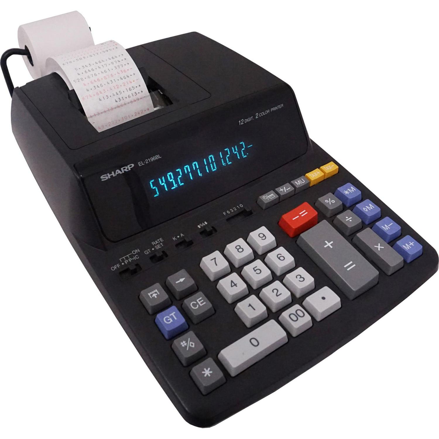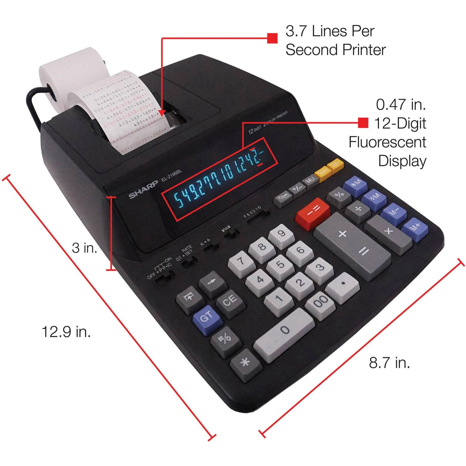 12-digit calculator features a large, fluorescent display that clearly displays each digit to help prevent reading errors. Two-color, 3.7 line-per-second ribbon printer is fast and reliable for excellent legibility. Professional keyboard layout with a left-side total key helps you quickly and accurately input data for fast calculations with minimal errors. Contemporary black styling complements any modern desktop decor. Printing calculator is perfect for the everyday or moderate user, especially in a busy office setting. Calculator also includes four-key independent memory, change sign key, average key, double-zero key and more. More from the Manufacturer
