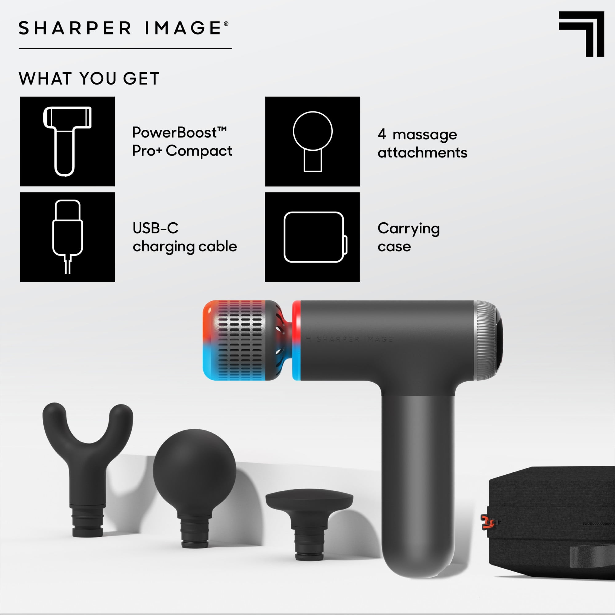 Experience unparalleled deep tissue massage with Sharper Image® Powerboost® Pro+ Compact Instantly switch between heat (115°F) and cold (38°F) with the advanced dual-temperature attachment Enjoy a peaceful massage anywhere with the ultra-quiet brushless motor Customize your massage with 4 distinct attachments and an intuitive dial control Compact and long-lasting design ensures on-the-go relief with a 2-hour runtime per charge