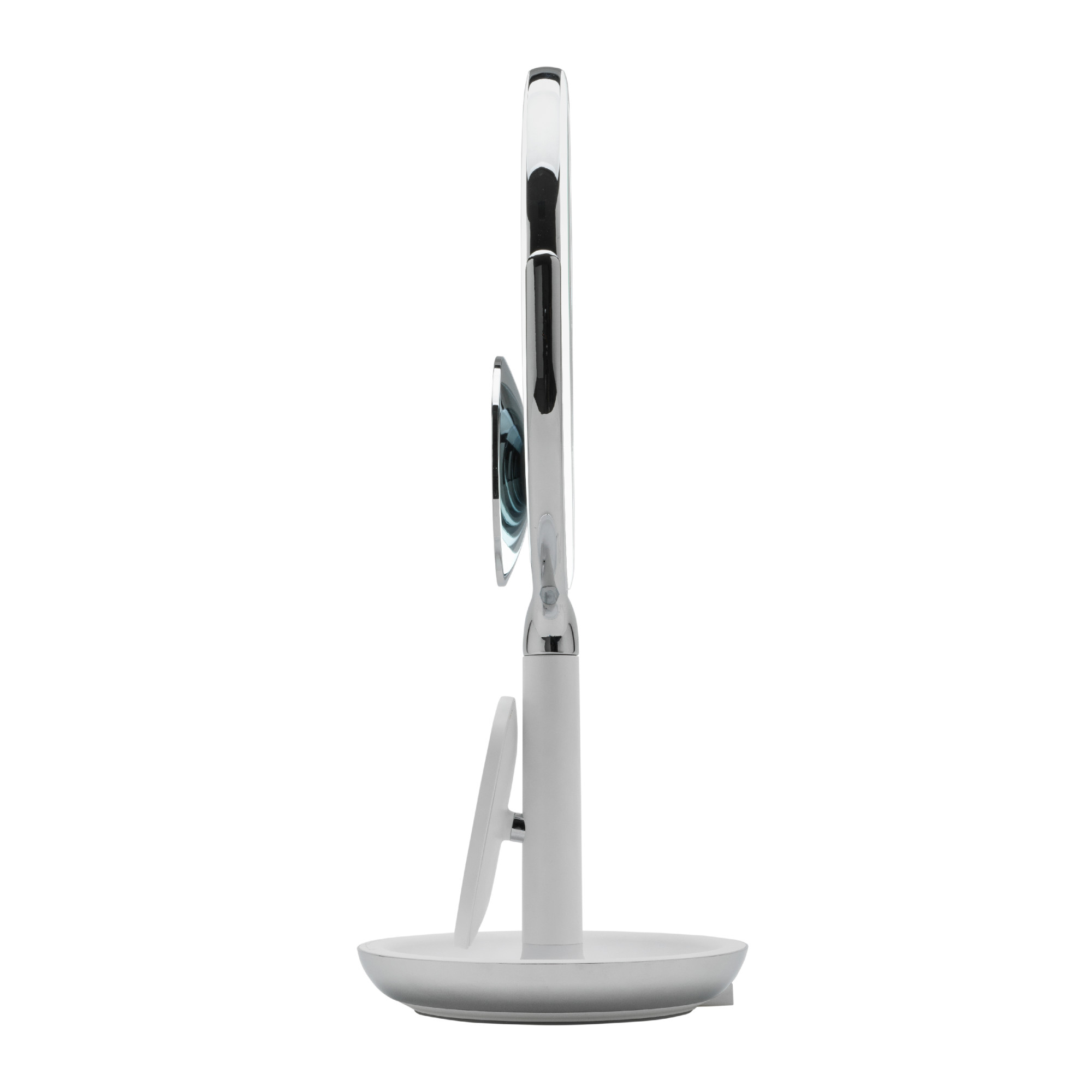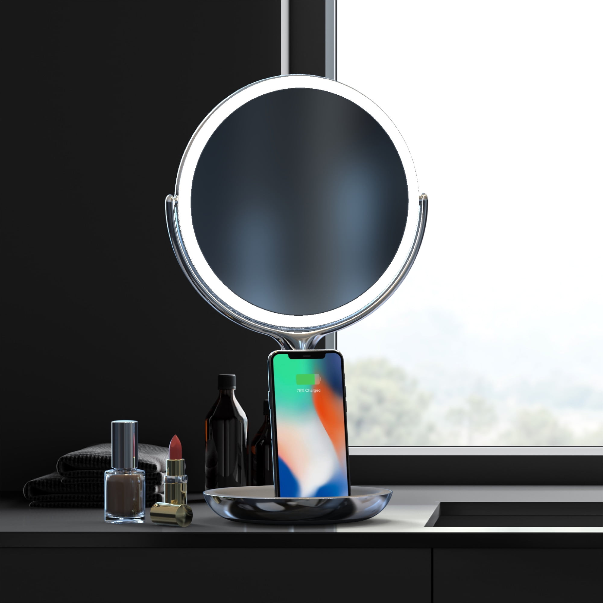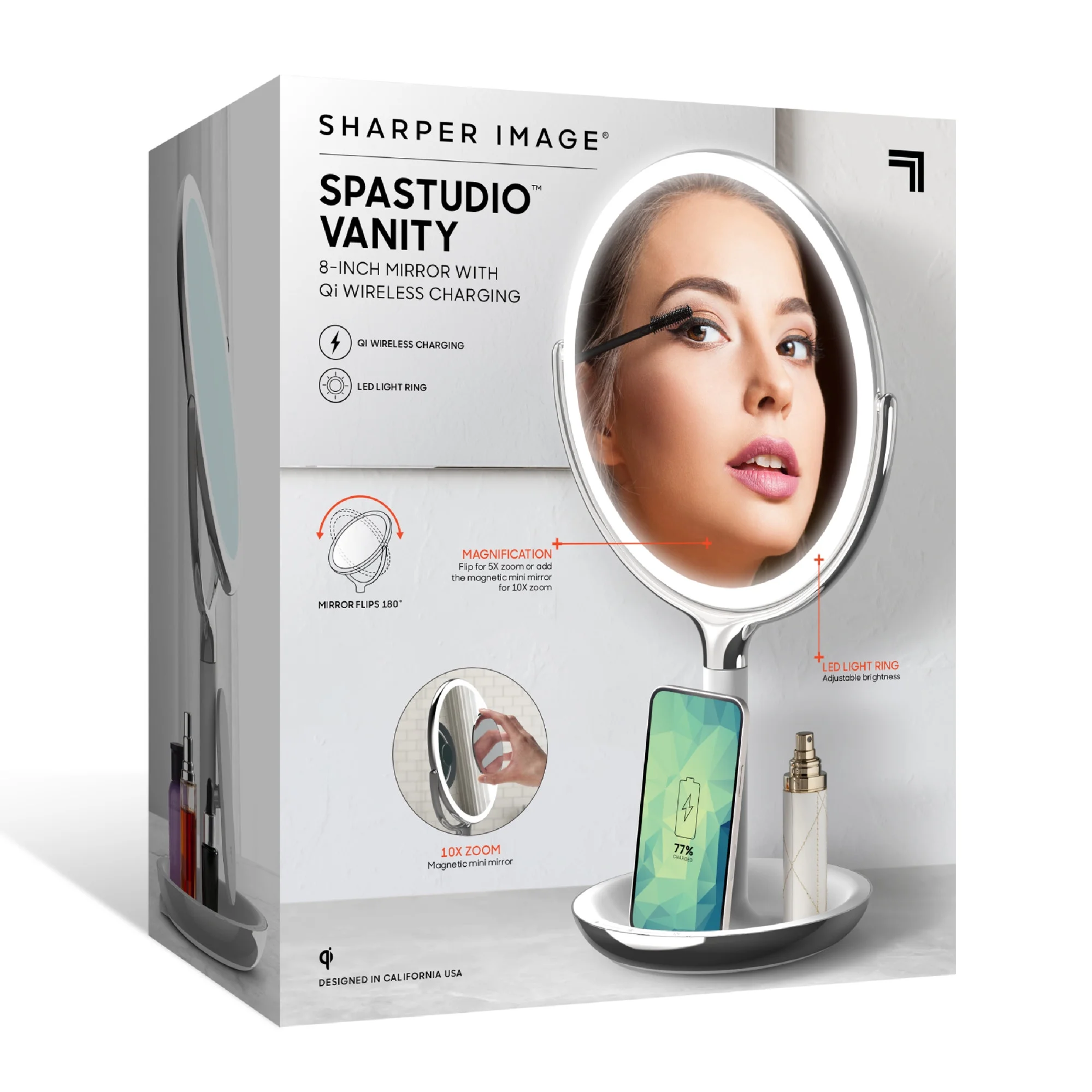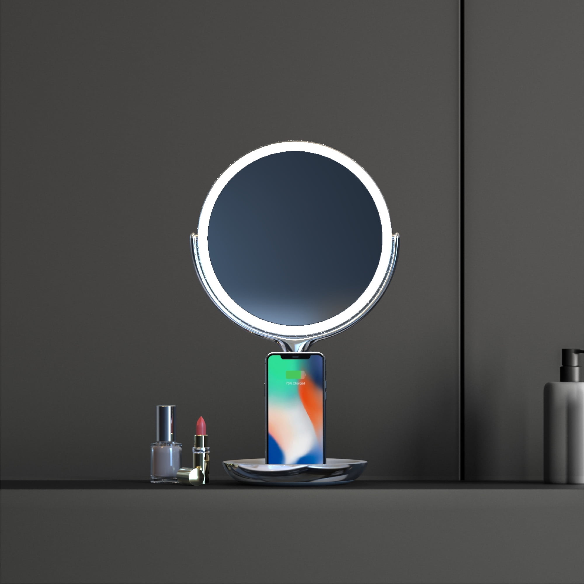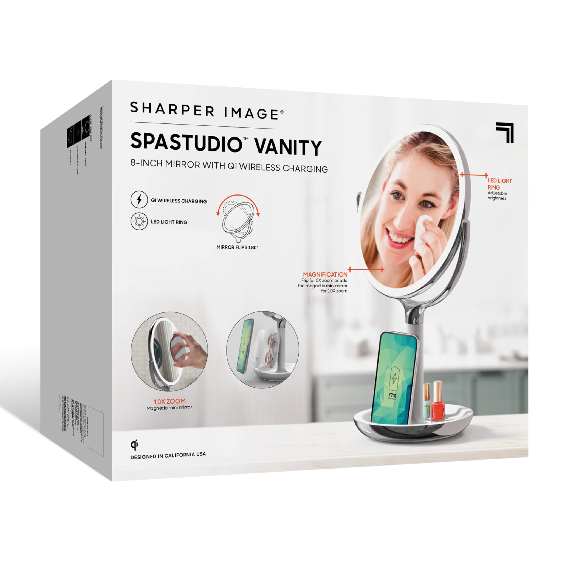 Charge Your Devices While You Get Ready with Sharper Image® SpaStudio™ Vanity Mirror. It has built-in wireless charging for all Qi enabled devices. The stand props your devices up under the mirror so you can easily access music, apps, and messages. The distortion-free mirror tilts securely into place and has a 5X zoom on the backside to ensure you always get the best view of yourself.