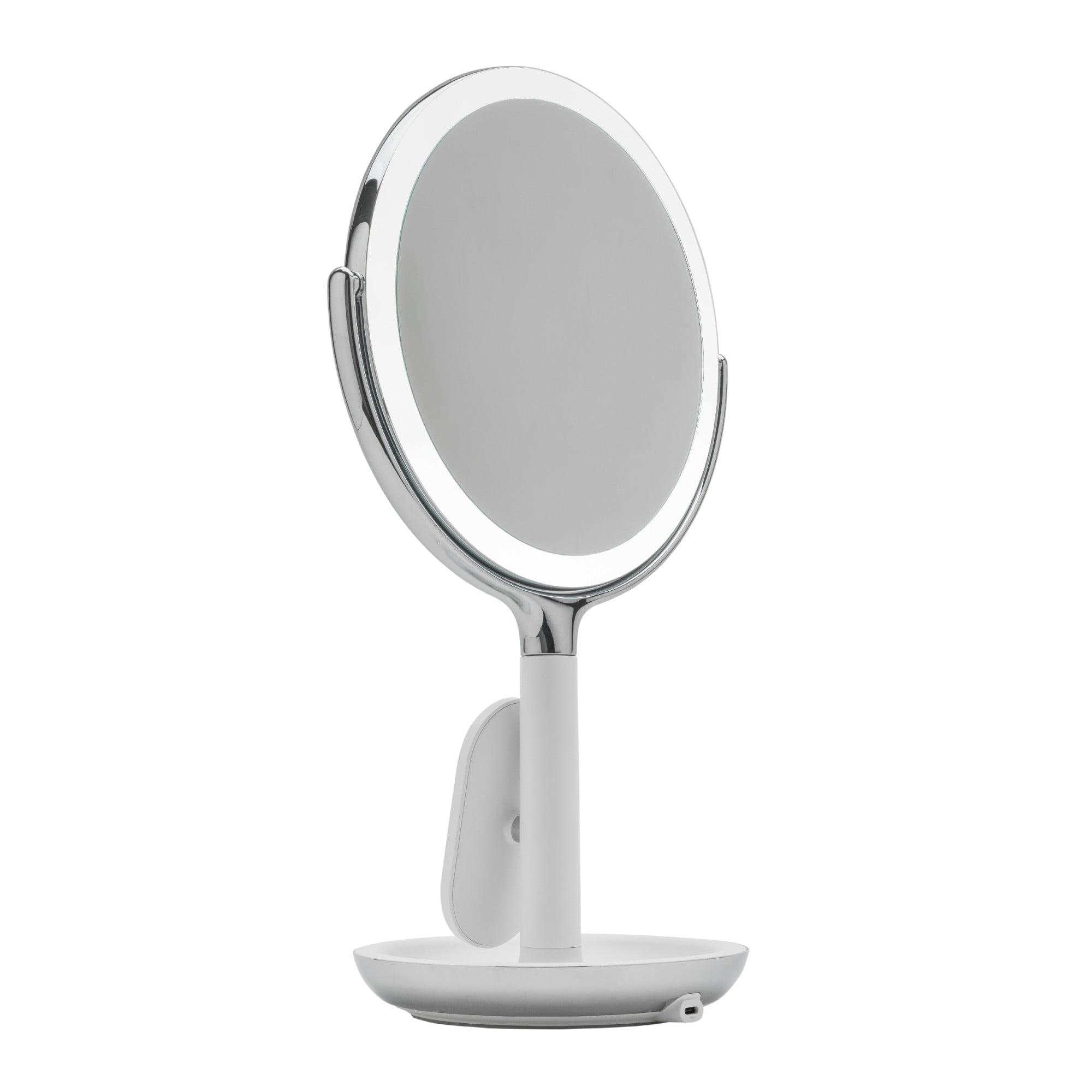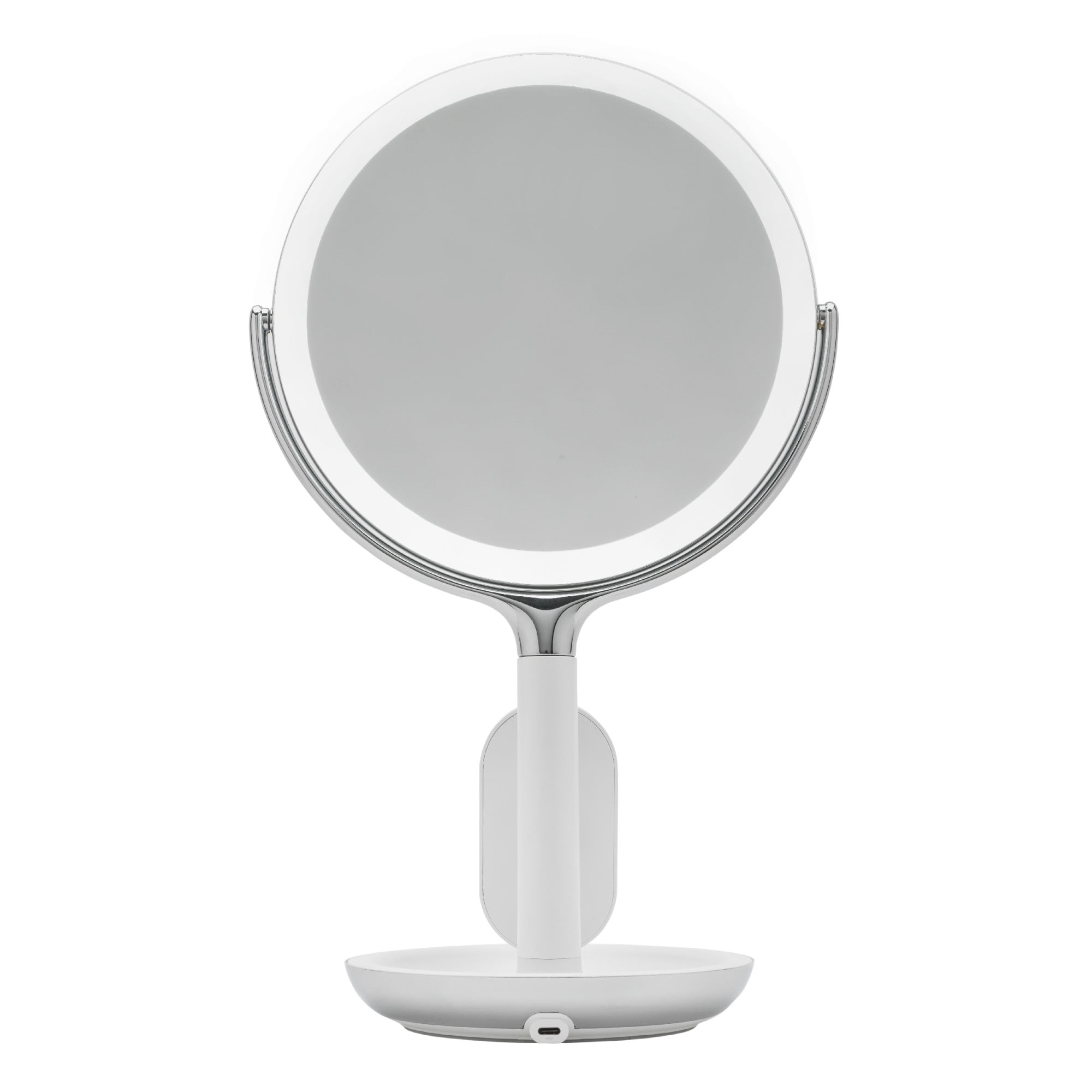 Power adapter cord included Adjust brightness of LED lights halo Includes 5X and 10X magnification Organize with the catchall storage base Mirror tilts and swivels Contemporary design Model: 1015505