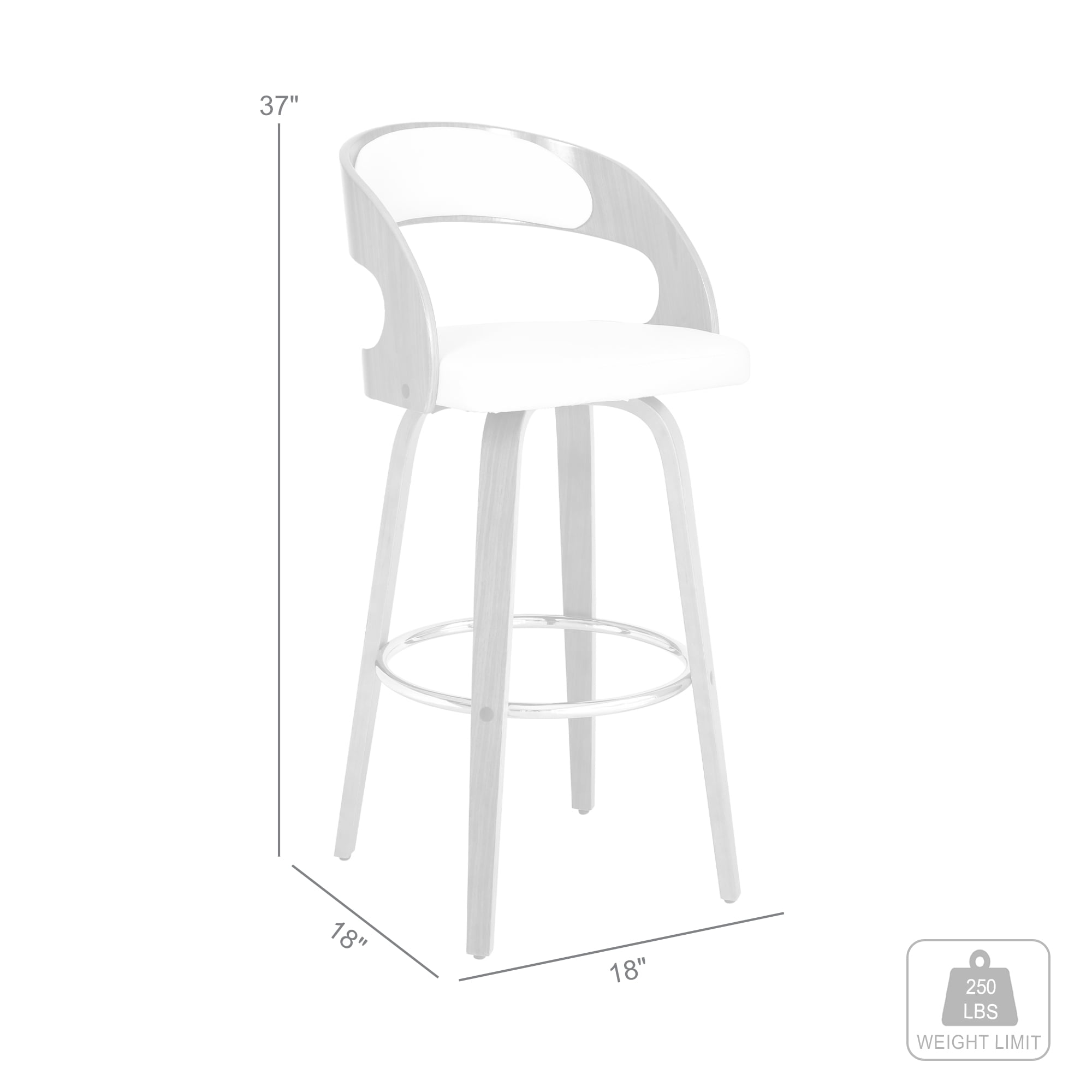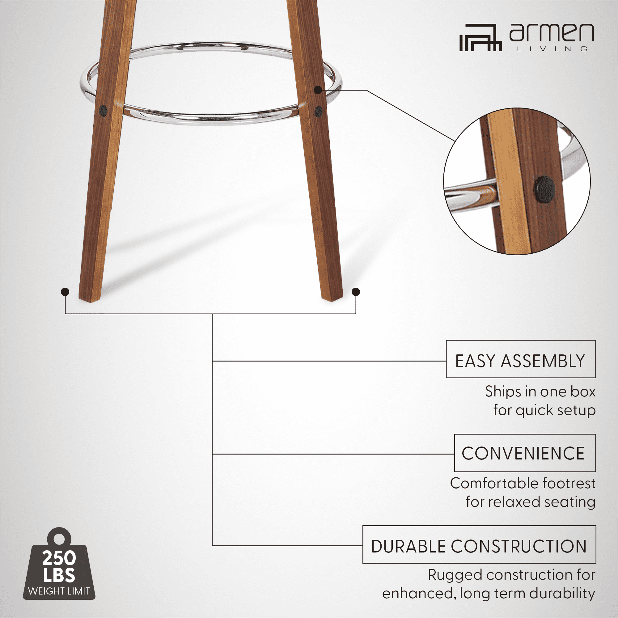 Add a touch of mid-century modern glamour to your home with the Shelly 26″ Counter Height Swivel Cream Faux Leather and Walnut Wood Bar Stool from Armen Living. The retro silhouette exudes timeless appeal that would easily fit into any home regardless of the existing design theme. The Shelly kitchen stool features a beautiful wood frame and seat back that wrap around a luxurious high-density foam cushioned back and seat. Upholstered in soft faux leather upholstery, the Shelly provides a full mobility with a 360-degree swivel function that enables you to engage with your guests regardless of their place in the room at parties or gatherings, making this ideal for entertaining. The open seat back provides breathable seating and allows for easy movement around your home. Available in a 26” or 30” seat height, the Shelly stool can easily incorporate into your kitchen, office, home bar, or den. The Shelly Swivel Faux Leather and Wood Bar or Counter Stool is available in your choice of a walnut wood finish with brown or cream faux leather upholstery or a black wood finish with gray faux leather upholstery.