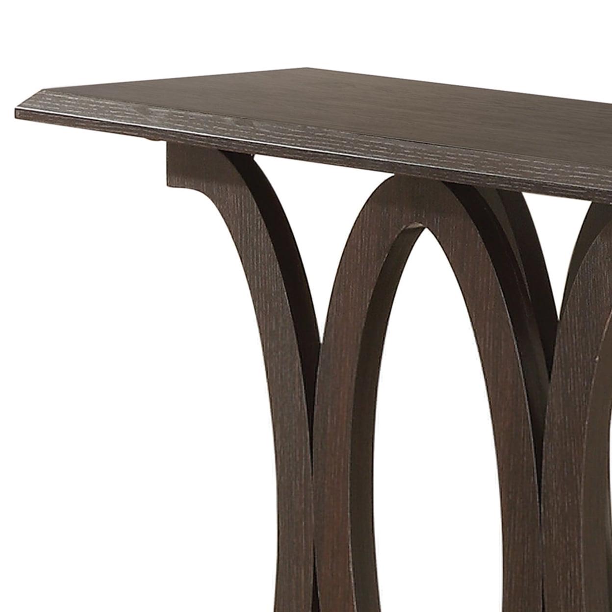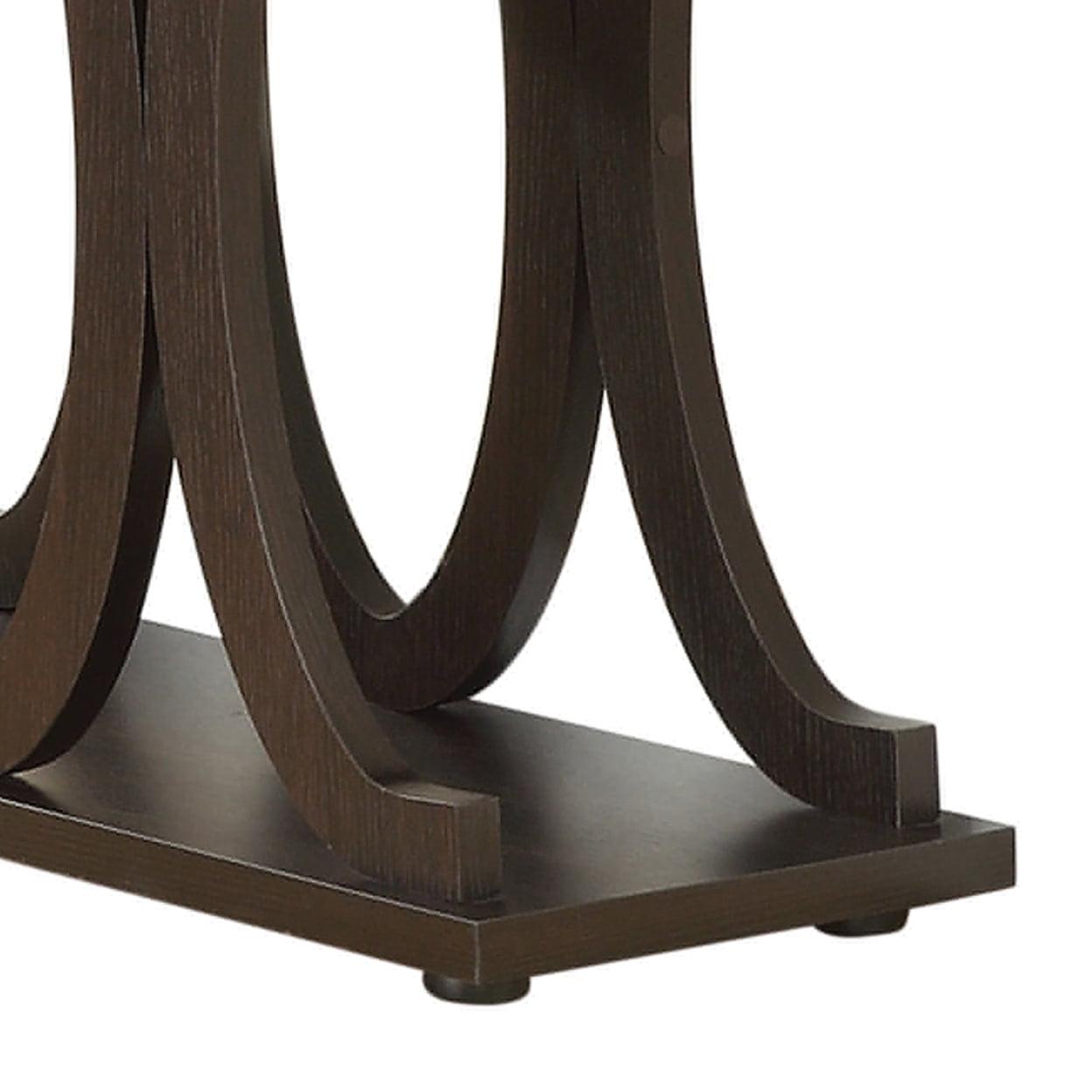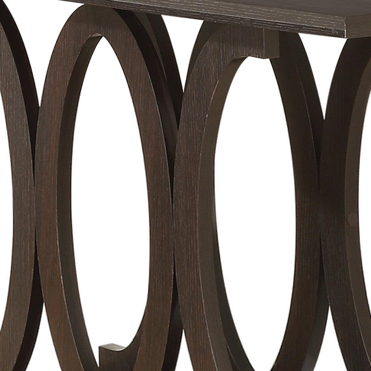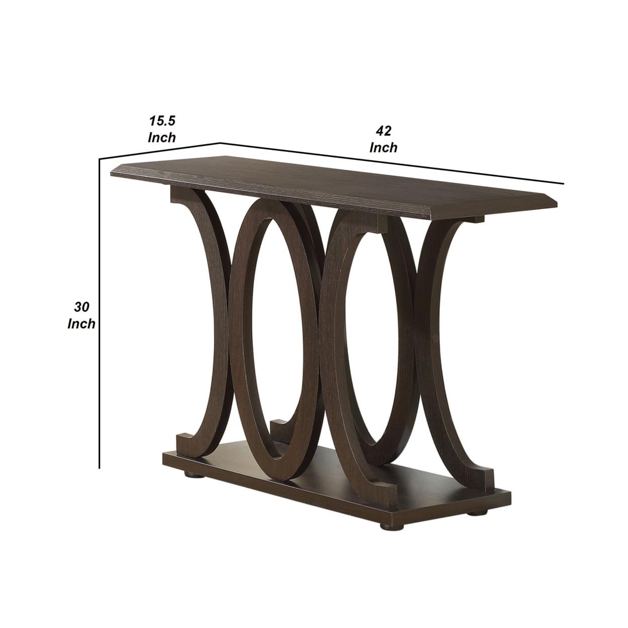 Contemporary Style C Shaped Sofa Table With Open Shelf, Espresso Brown- Saltoro Sherpi Noticeable design and innovative approach makes this solid wooden sofa table furniture piece special one. Its circular design within c-shaped pattern creates a unique accent piece for your living room. Its exceptional and attractive style is matched by a dark espresso brown finish. Perfect for display and decorative purpose the table is compact and stylish for contemporary home decor. It also features an additional open bottom shelf for display and storage of essentials.