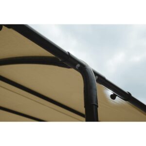 ShelterLogic Monarch Canopy line of all-purpose canopies features an arch shape, light colored polyethylene cover, and black frame. Appealing to a sophisticated consumer lifestyle, this unique canopy is both attractive and functional. Ideal for shade coverage and protection from inclement weather, this stylish canopy with clean lines and earth tones blends into any outdoor home decor. It is easy to assemble and conveniently sized to fill most backyard needs. Monarch Canopy 9 x 16 ft.