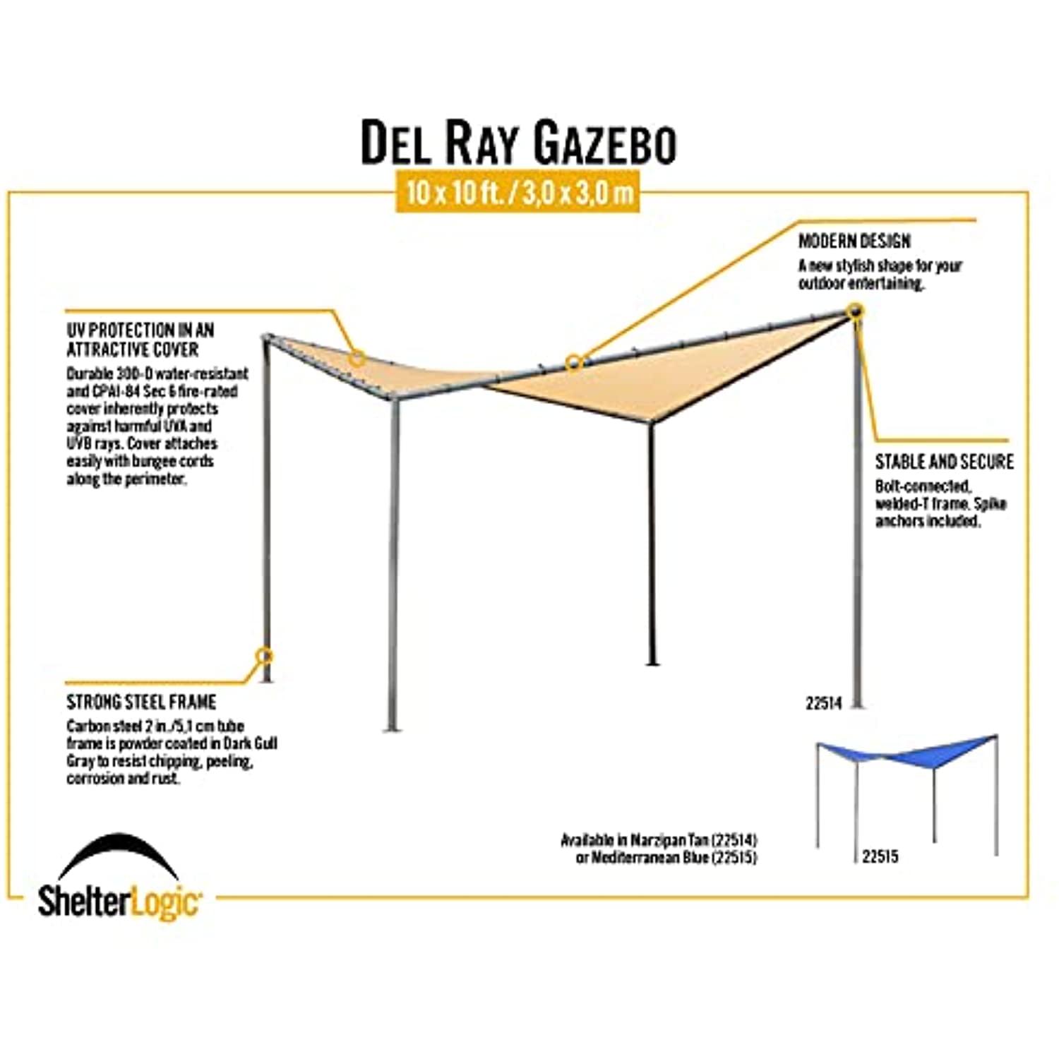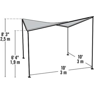 Enjoy the beauty of your own backyard and make sure to plan your outdoor gatherings with the newest canopy model from ShelterLogic, the Del Ray Canopy 10×10 with Charcoal Frame Tan Cover! This emits a stylish look that will surely be a head-turner in your neighborhood! This is an elegant choice and it adds a modern aesthetic to any backyard, deck, patio, garden and so much more. This is made of a carbon steel 2 in./5,1 cm tube frame and is powder-coated in Charcoal Gray to resist chipping, peeling, corrosion and rust. A sturdy, steel shade solution to last season after season! Its 300-D water-resistant and CPAI-84 Sec. 6 fire-rated cover inherently protects against harmful UVA and UVB rays and the tan cover attaches easily with bungee cords along the perimeter.