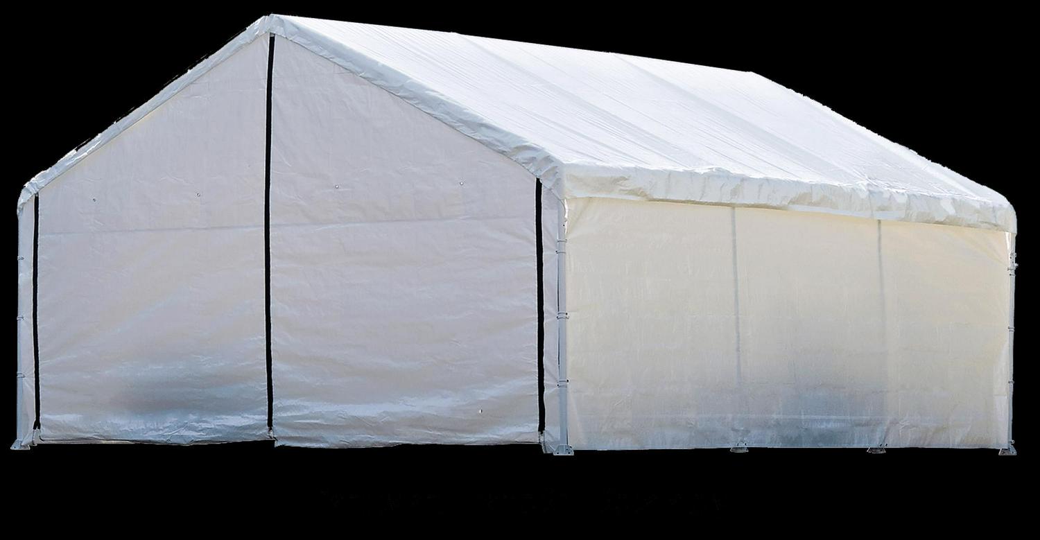 The ShelterLogic 18 x 20 ft. SuperMax Enclosure kit- seasonal Storage Solution made simple. Now you can quickly convert your 18 wide SuperMax Canopy to a functional, low cost enclosed shelter in minutes. Built to your canopies exact frame specs. The SuperMax enclosure kit easily attaches to your existing frame in minutes. Expand the use of your canopy, create more storage space. Ready to go out of the box. Enclosure kit only.ENCLOSURE KIT ONLY – CANOPY FRAME AND COVER SOLD SEPARATELY. Fits all 18 x 20 ft. SuperMax 2 in. diameter canopies.. Heat sealed seams not stitched for a stronger bond. 100% water resistant. Constructed of ripstop woven polyethylene fabric. 50+ UPF Sun Protection blocking 98% of harmful UV Rays. Added UV protection, fade blockers, anti- aging, anti-yellowing and anti-microbial agents. UV protection treated inside, outside and in between. Quick and easy set-up attached to canopy frame in minutes with bungee fasteners, reuse your existing bungees or reorder.