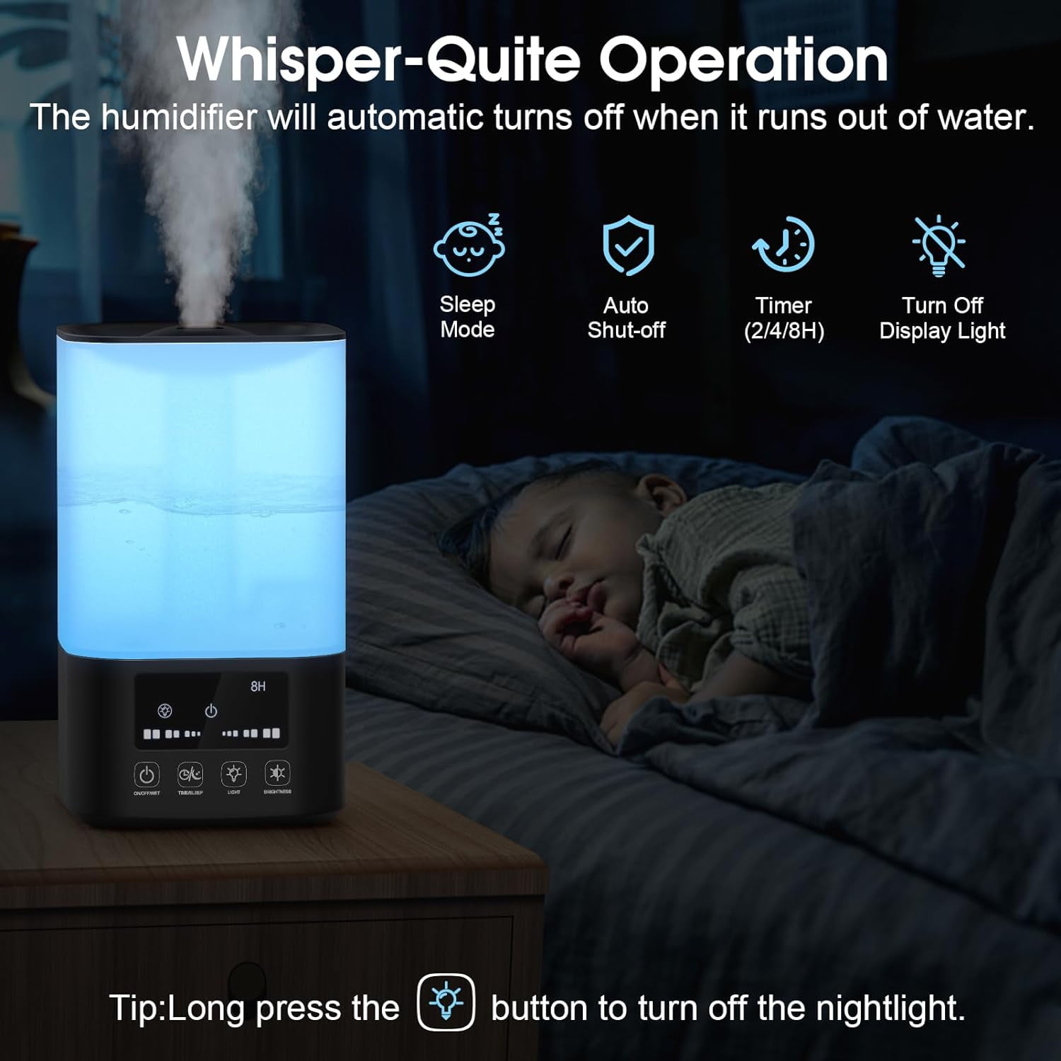 50-HOURS OF CONTINUOUS MIST: Enjoy extended relief with our cool mist humidifier for bedroom, providing up to 50 hours of continuous moisture for a healthier living environment. Complete range, based on mist level, is 22 to 50 hours. NOTE: Packaging may vary PERFECT FOR ANY ROOM UP TO 500 SQUARE FEET: Create an oasis of comfort in any space with our room humidifier, suitable for spaces up to 500 sq ft, ideal for large bedrooms, kid’s rooms, nurseries, and living areas ALLERGY, SINUS, CONGESTION, AND DRY SKIN RELIEF: Breathe easier with our bedroom humidifier, providing a soothing mist for allergy, sinus, congestion, and dry skin relief. The best humidifier for promoting better sleep and well being FILTERLESS, EASY FILL, EASY CLEAN HUMIDIFIER: Say goodbye to hassle and goodbye to costly filters. Our bedroom humidifier for adults and children is user friendly. Designed for effortless filling and easy to clean, saving you on your expenses, time, and effort ULTRASONIC, WHISPER QUIET MOTOR: Experience peaceful tranquility with our whisper quiet ultrasonic humidifiers for bedrooms, creating a serene atmosphere for restful sleep and relaxation. The best humidifiers for bedroom shouldn’t disturb your sleep 360 DEGREE MIST OUTPUT NOZZLE: Enjoy evenly distributed moisture throughout your bedroom with our room humidifier’s 360 degree mist output nozzle, delivering optimal humidification from all angles CONTROL WITH 1 SIMPLE KNOB: Adjust humidity levels effortlessly with the single knob control of our cool mist humidifier for bedrooms, allowing you to customize comfort with ease