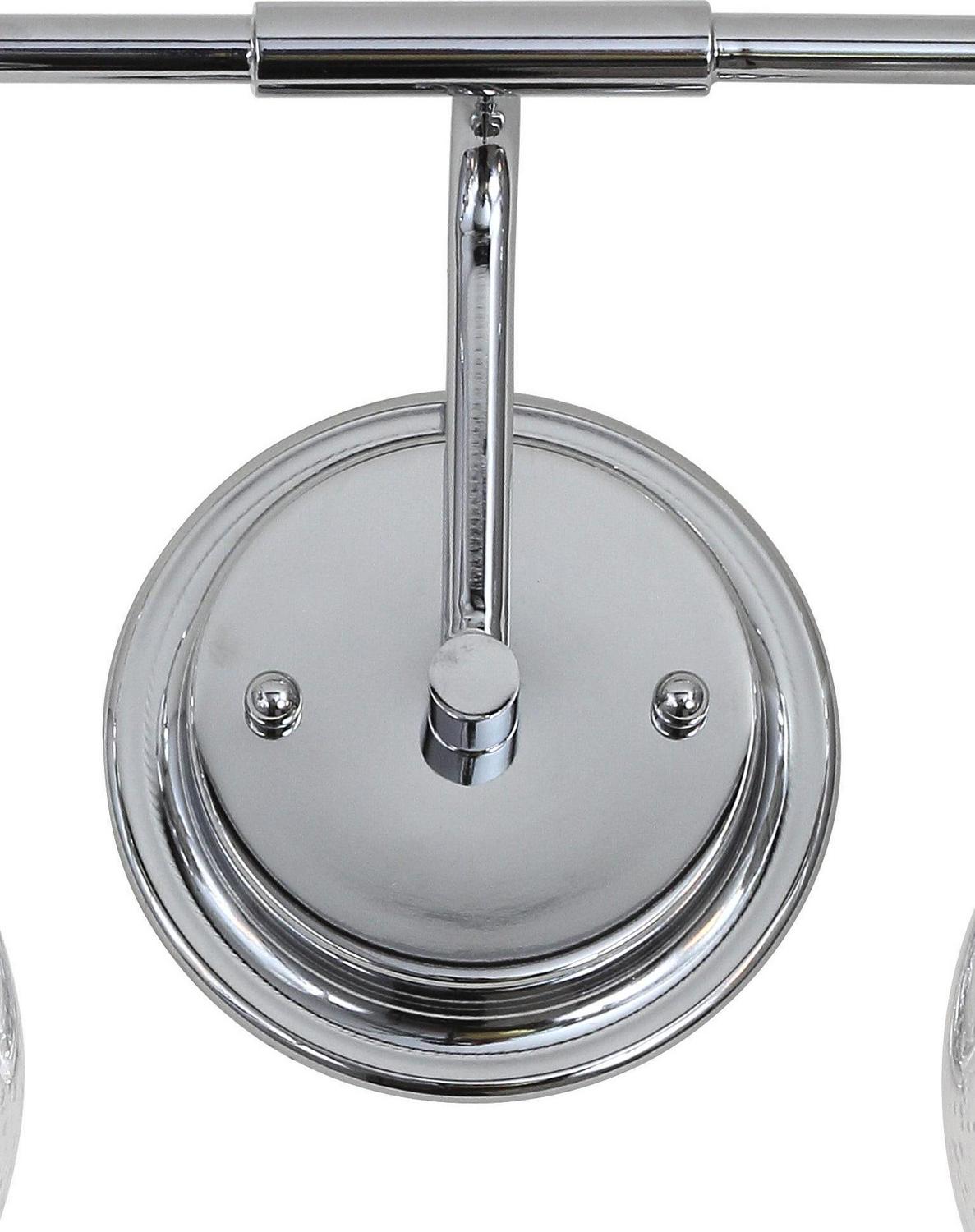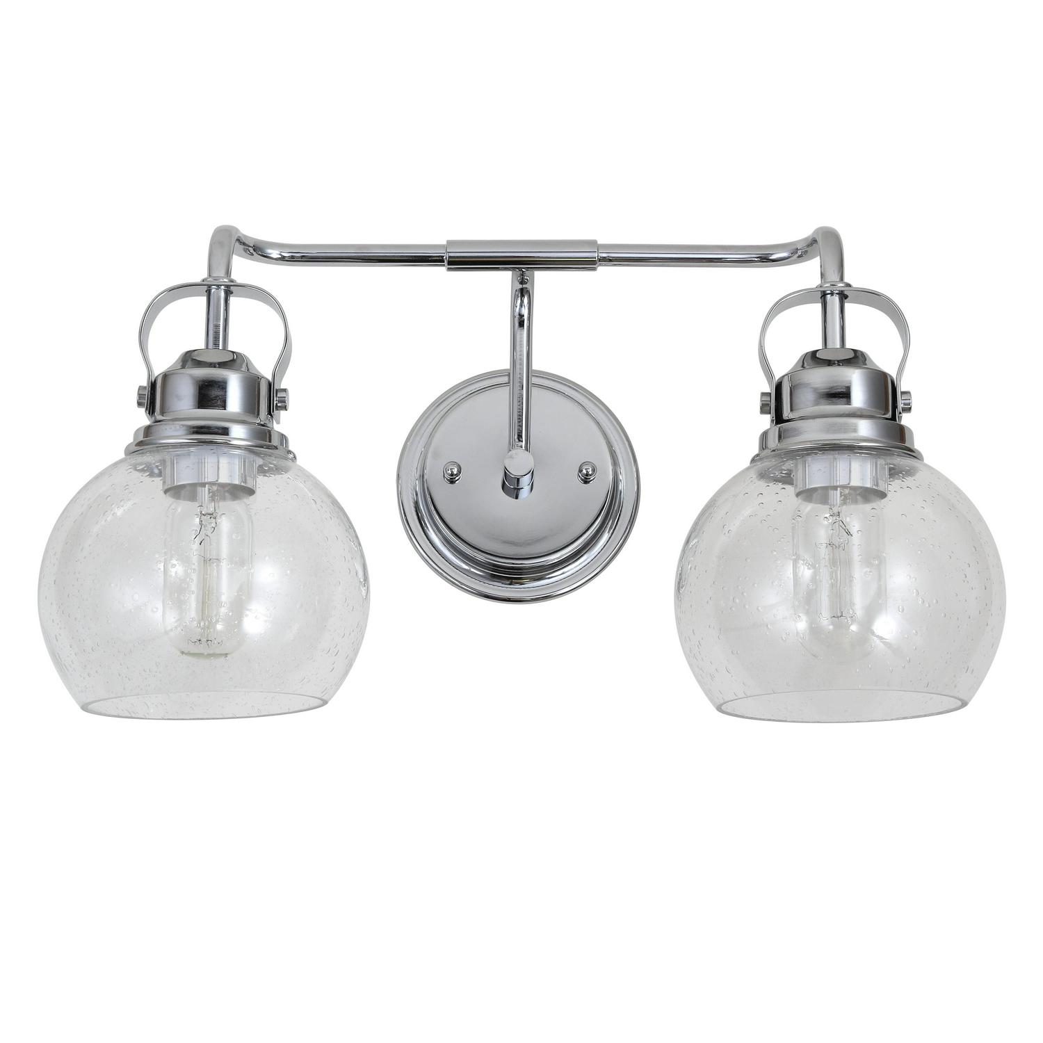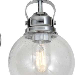 - Chrome-finished metal construction with seeded glass globes