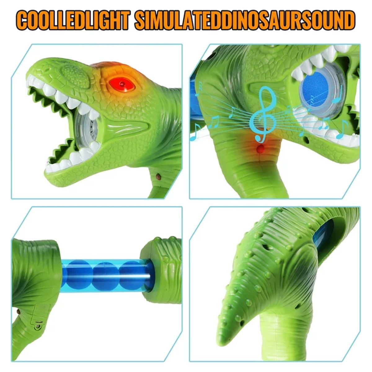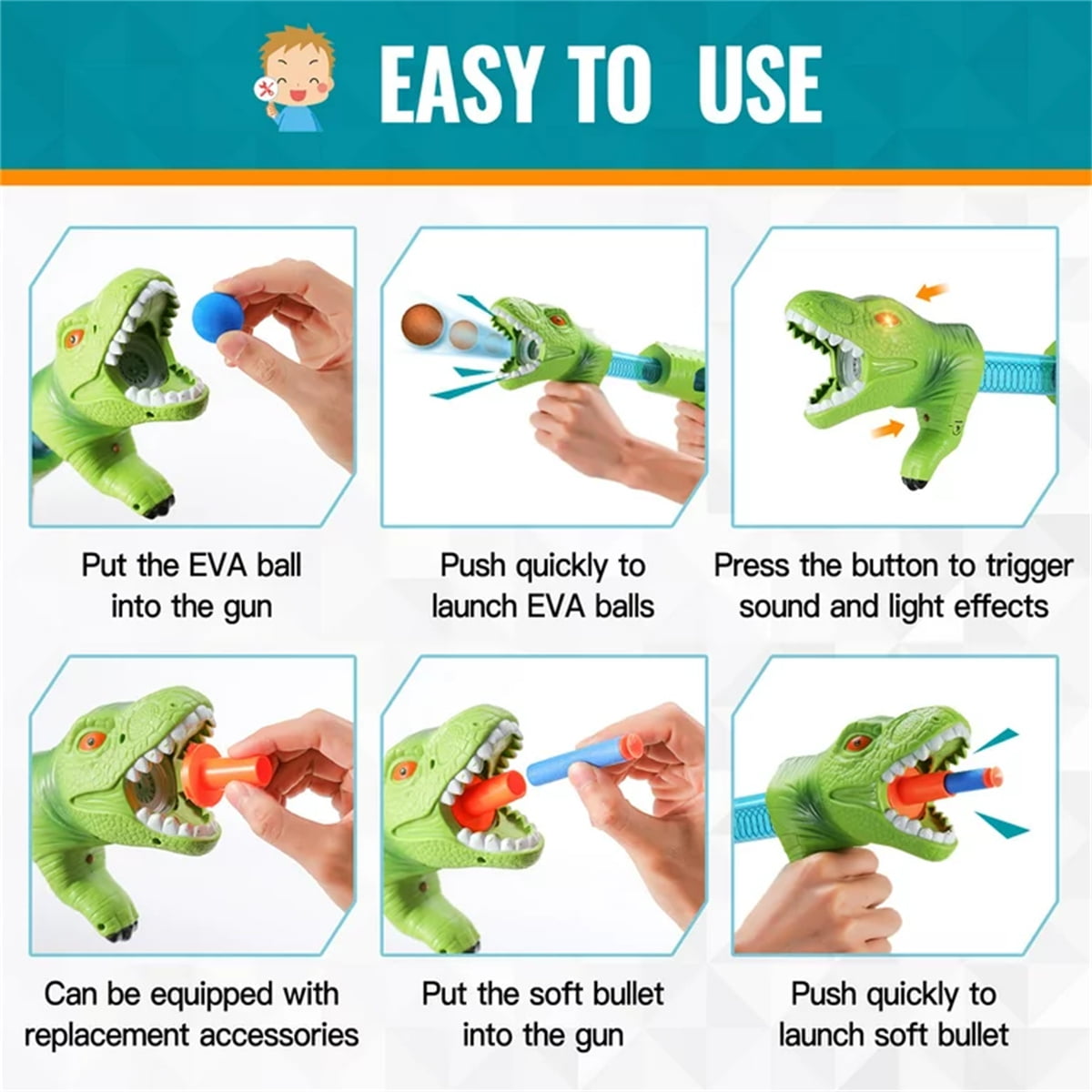 【Shooting Game Outdoor Toys】The kit includes 2 pack dinosaur air blasters, 30 soft foam balls, 20 official darts, 2 bullet adapters and 1 dinosaur-themed standing shooting target. Whether play independently or as a team against each other, it’s flexible enough to meet all your needs. Good choice for indoor & outdoor activities 【Dinosaur Design Kids Toys】Vivid T-Rex dinosaur shaped gun and dinosaur-themed standing target will bring kids into a fantastic Jurassic World. Press the button on the head of dinosaur to light up the eyes and press the trigger to make a realistic dinosaur roaring sound. All those dinosaur related elements give your children endless fun 【Easy to Operate Educational Toys】Each air-powered gun blaster can hold 9 foam balls, fire them into different scoring pockets to get as many points as possible. Kids can change launch head and shoot with soft darts. The shooting target is easy for kids to put together. This dinosaur game help improve hands-on and spatial perception 【High-Quality & Safe Crafts】Made of high-quality, non-toxic and recyclable ABS plastic. Firm structure ensures that the gun can withstand the air impulse without falling apart. The very light-weighted sponge balls do no damage to their targets — household items, and people, even the kids can battle each other with the foam balls 【Ideal Kids Birthday Gifts】The dinosaur shooting game play set is incredibly fun and well-packaged, so it’s perfect to be served as a boy or girl birthday and holiday gift for Easter, Thanksgiving, Christmas, New Year Eve and so on. We highly recommend this dino toy gift for kids age 4-5 & age 6-8 and let them stay away from electronics