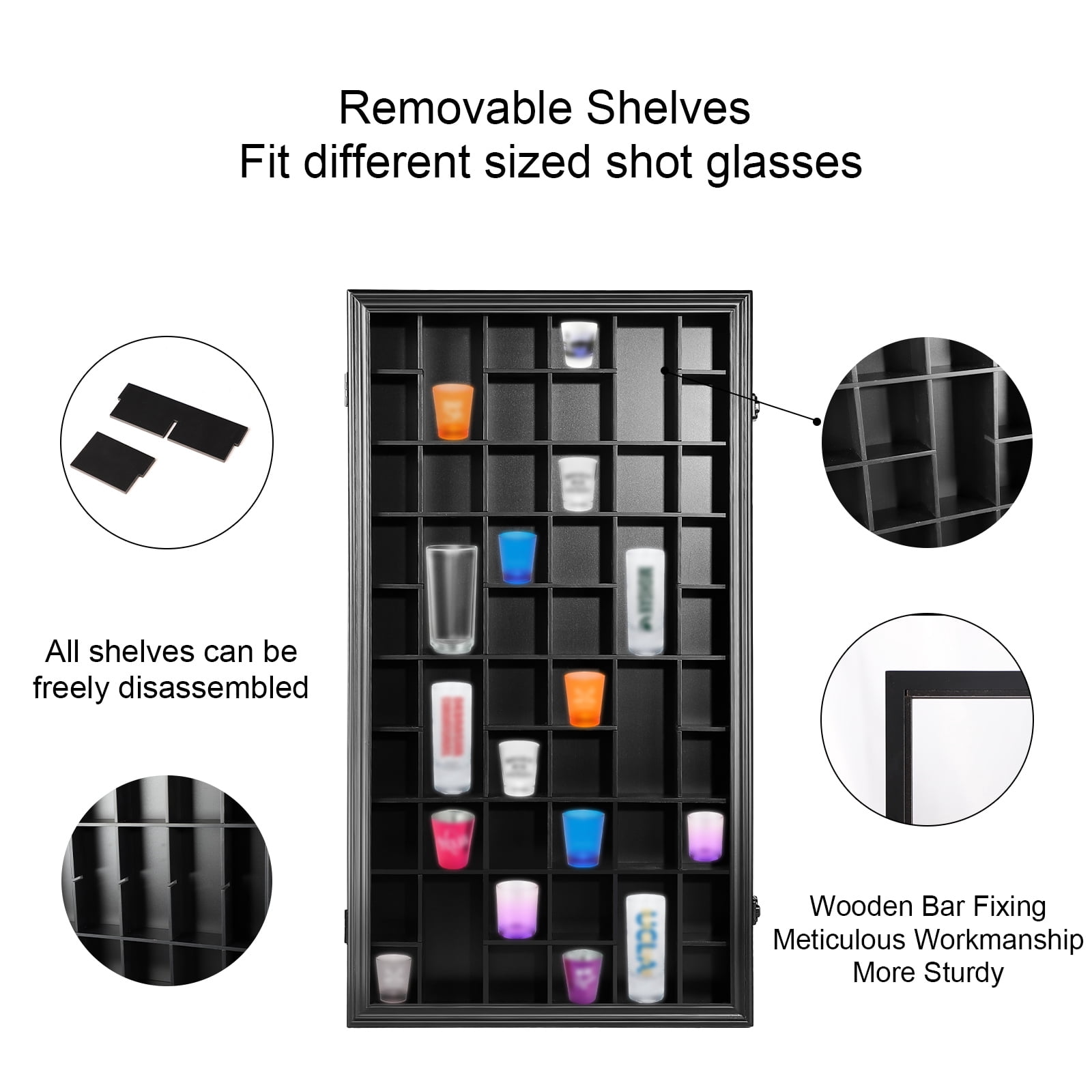 EXTERIOR DESIGN: Matte black wood finish for durability and longevity. The black anti-theft locks and hinges and 92% clarity acrylic panels not only maintain the overall consistency of the frame, but also provide excellent protection for your cherished glass collection. SIZE: The outside dimensions of this shot glass display case are 32.5 ” x 17.9 ” x 2.9 ”. Inside, each small compartment measures 2.95 x 2.6 x 1.96 inches; the large compartment measures 6.1 x 2.6 x 1.96 inches. All compartments hold a total of 52 wine glasses. PROTECT & DISPLAY COLLECTIONS: Highly transparency acrylic panels not only display your treasures visually and clearly, but also provide 98% UV protection to keep your treasured glasses from yellowing and fading under direct sunlight. Tooth hooks on the back panel and matching hanging accessories help you to better display your precious shot glasses. Removable shelves accommodate different glass sizes. (Note: Shot glasses are not included) SPECIAL GIFT – The Shot Glass Display Case is perfect as a thoughtful gift for family, friends and that special someone who enjoys collecting glasses during various holidays or birthdays. The classic and durable design is practical and functional, able to protect glasses while displaying treasured glasses and serving as a unique piece of home décor. PACKAGING PROTECTION – The shot glass display box is surrounded by foam and protected. The acrylic panels are protected by thick stickers on both sides to prevent as many scratches as possible to the acrylic panels in transit.