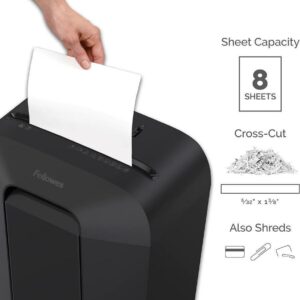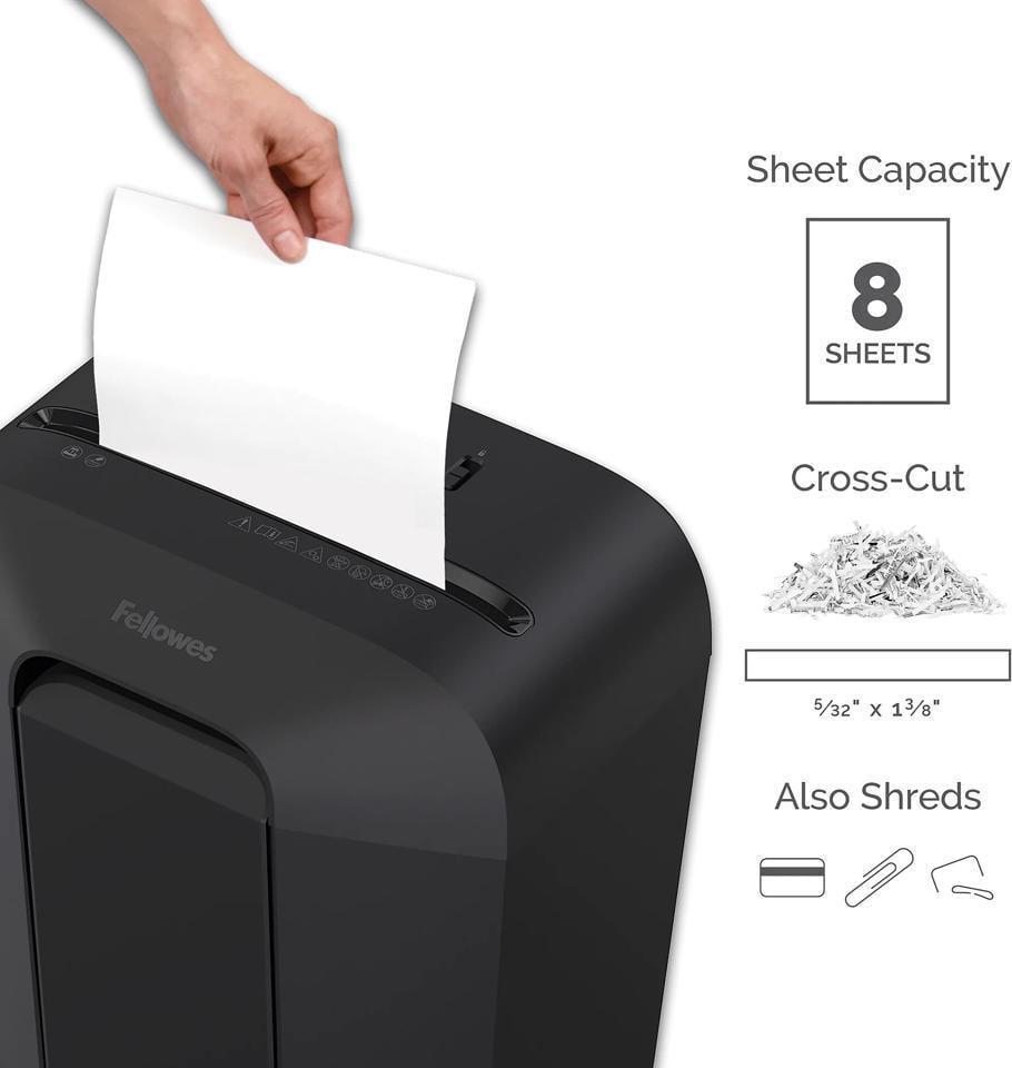 - Shreds 8 sheets per pass into 5 /32″ x 1-15/32″ cross-cut particles (security level P-4)
