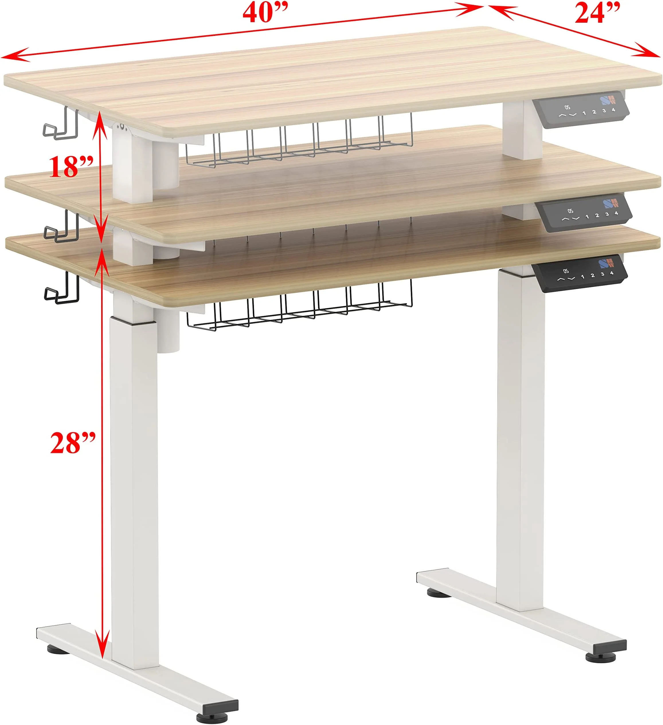 Digital Display Handset – 4 memory preset options for easy adjustment. Electric Lift System – Fully motorized lift from 28 to 45 Inches height Telescopic Height Adjustment – The strong legs use telescopic adjustment transitioning from sitting to standing from 28″ to 45″ High-grade industrial steel. Measures – 40″ L x 24″ W x 28-45″ H