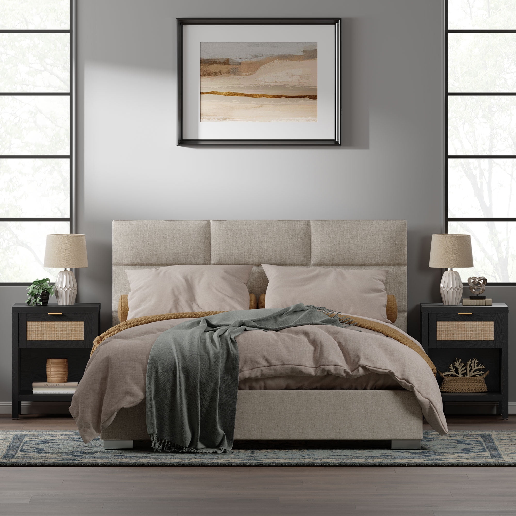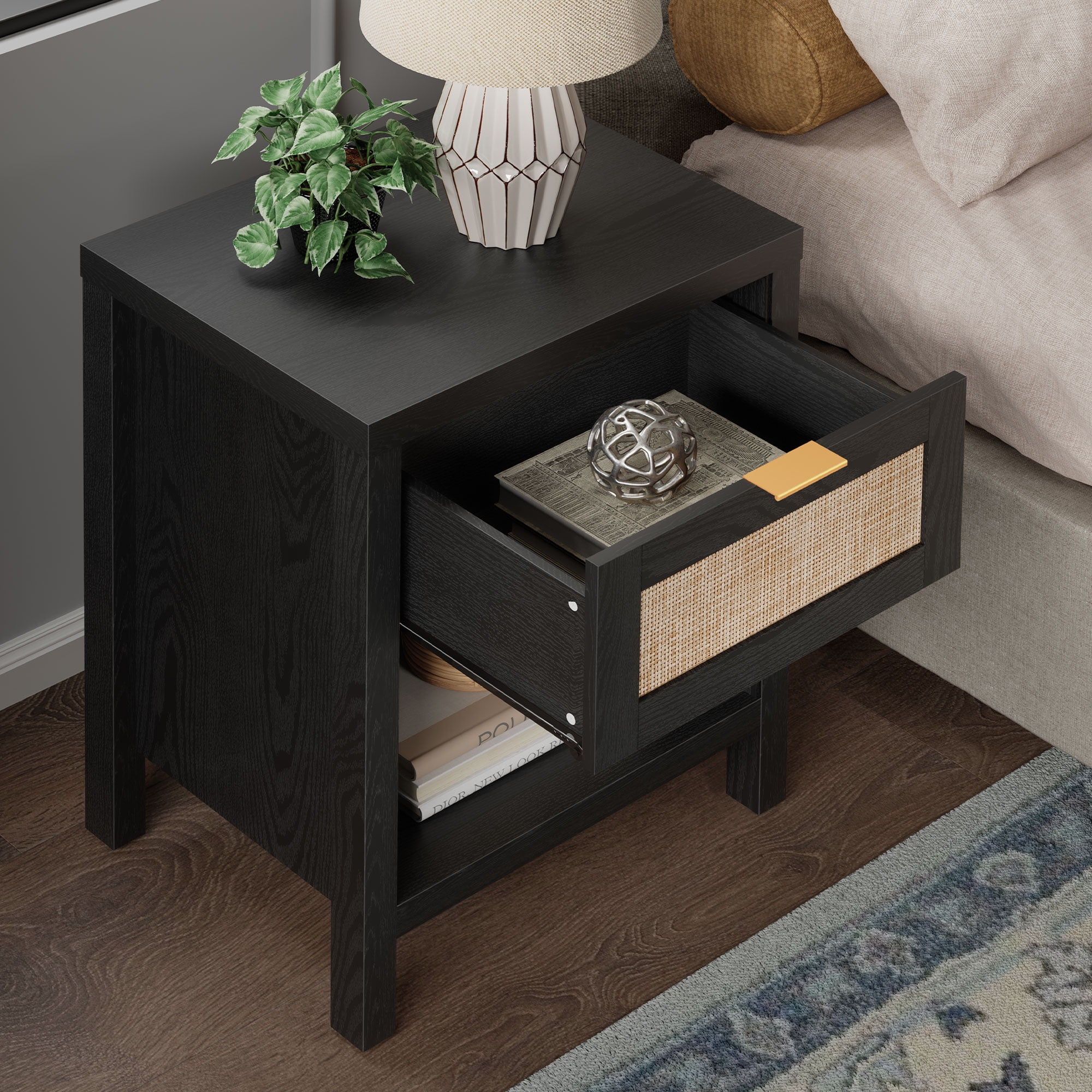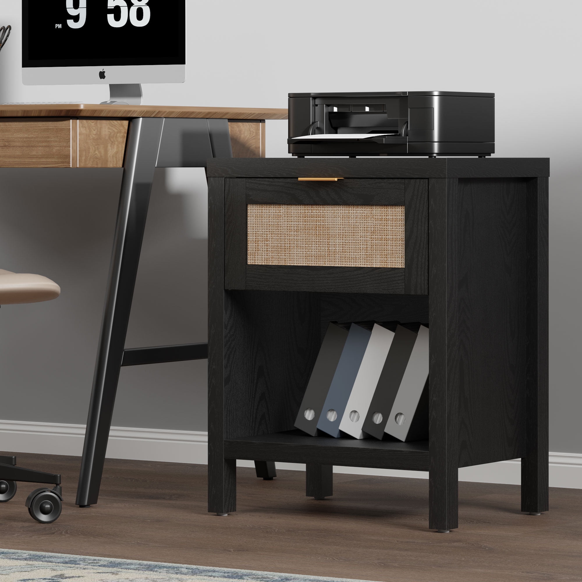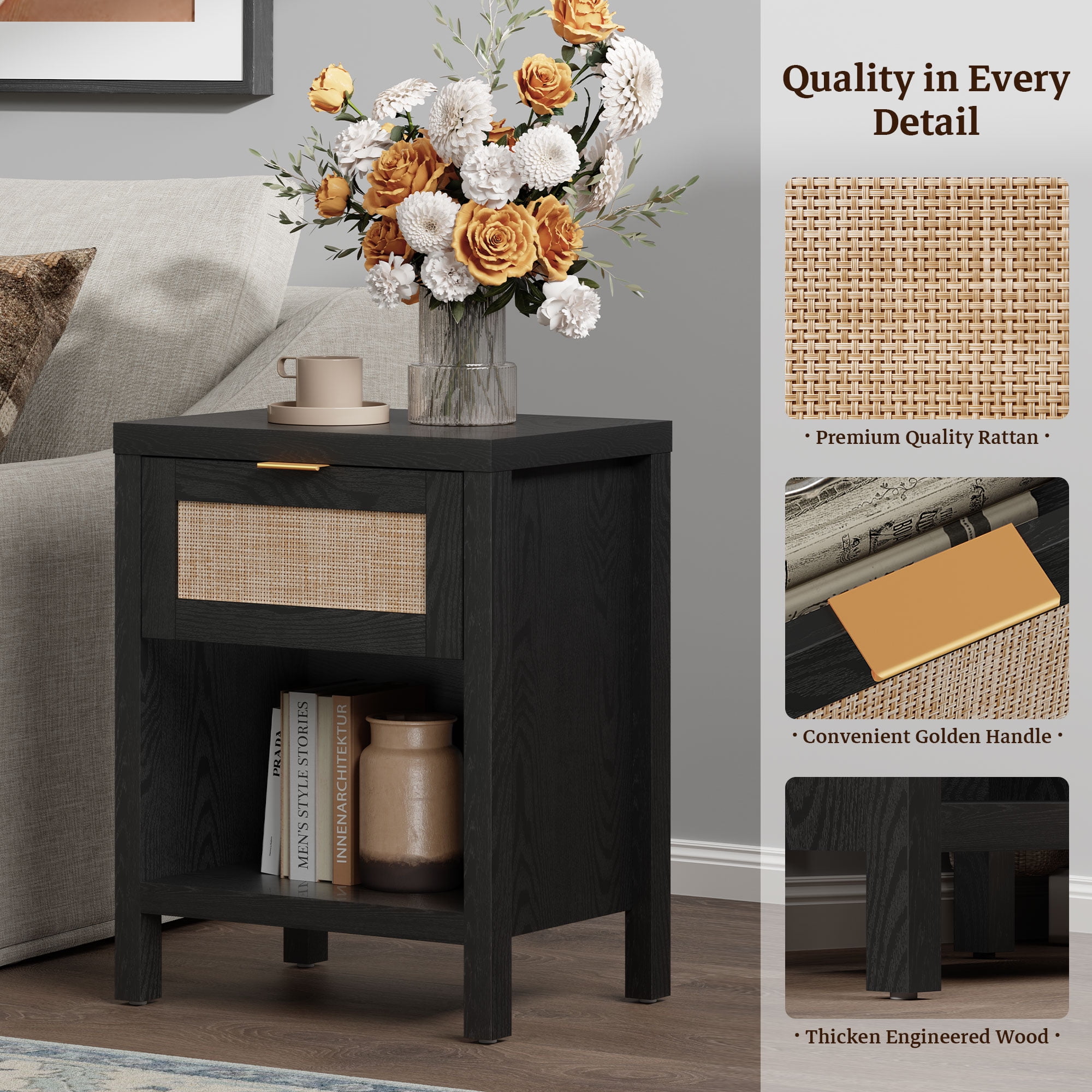 Rattan Nightstand Farmhouse Night Stand with Drawer and Storage Shelf Boho Bedside Table End Table Side Table Accent Table for Bedroom Living Room Features: Farmhouse Nightstand for Modern Homes, great for making a Boho rustic home styles, or just adding air to your Modern home. Rattan nightstand designed with one drawer and open shelf, making storage more convenient and safe, easy to put items in and take items out, at the same time keep small items from kids and pets. The whole table is made from thicker oak board, on one hand, it looks more modern, one the other hand, it is more stable and heavyduty. Rattan patterns cultivated from plastic, not real rattan, so there is no worry about insects and molds. The small accent table is not only perfect for bed side table in bedrooms, but ideal for end table in living room. Specifications: Materials: Oak Wood Board, Plastic, Metal; Color: Black; Dimension: 19.7 x 15 x 25.2in / 50 x 38 x 64cm (LxWxH) Package includes: 2 x Nightstands