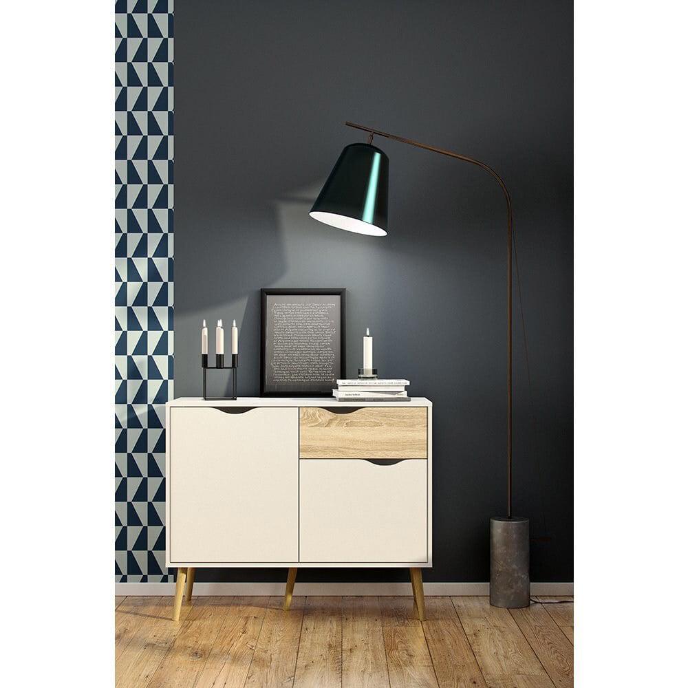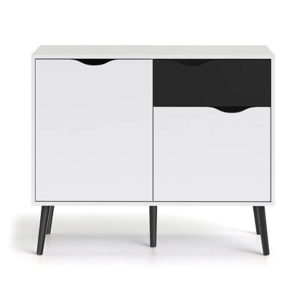 Alluding a retro modern charm, this sideboard table from the Diana Collection features one drawer and two doors with grooved cut out handles. Ideal for any living space that needs storage, the sideboard has ample room without being short on style. The light and airy color combination of a crisp White top with solid oak tapered, round legs perfects this fresh interpretation of mid century design.