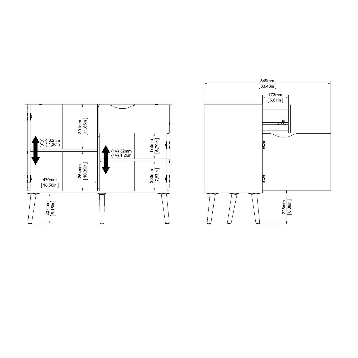 Round, flared legs made with solid wood Two tone finish combination Cut out drawer pulls in place of handles Drawers with metal runners One drawer, two doors with two adjustable shelves Made from engineered wood Made in Denmark Scandinavian look and design Includes assembly manual and all necessary hardware and fasteners. Components are pre drilled and pre cut ready for easy assembly!