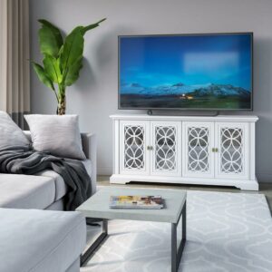 Enjoy your favorite meals in style with this traditional sideboard. Designed to accommodate appetizers and meals, this classic sideboard is perfect for cozy family dinners or larger gatherings with friends. There’s plenty of storage for all your plates and placemats with adjustable shelves behind the double doors. Tempered-glass panels and screen-printed mullions complement any area. Keep all your wires and cables neatly organized, thanks to back panel cut-outs. This multifunctional piece even works in the living room as a beautiful TV stand for all your entertainment needs.