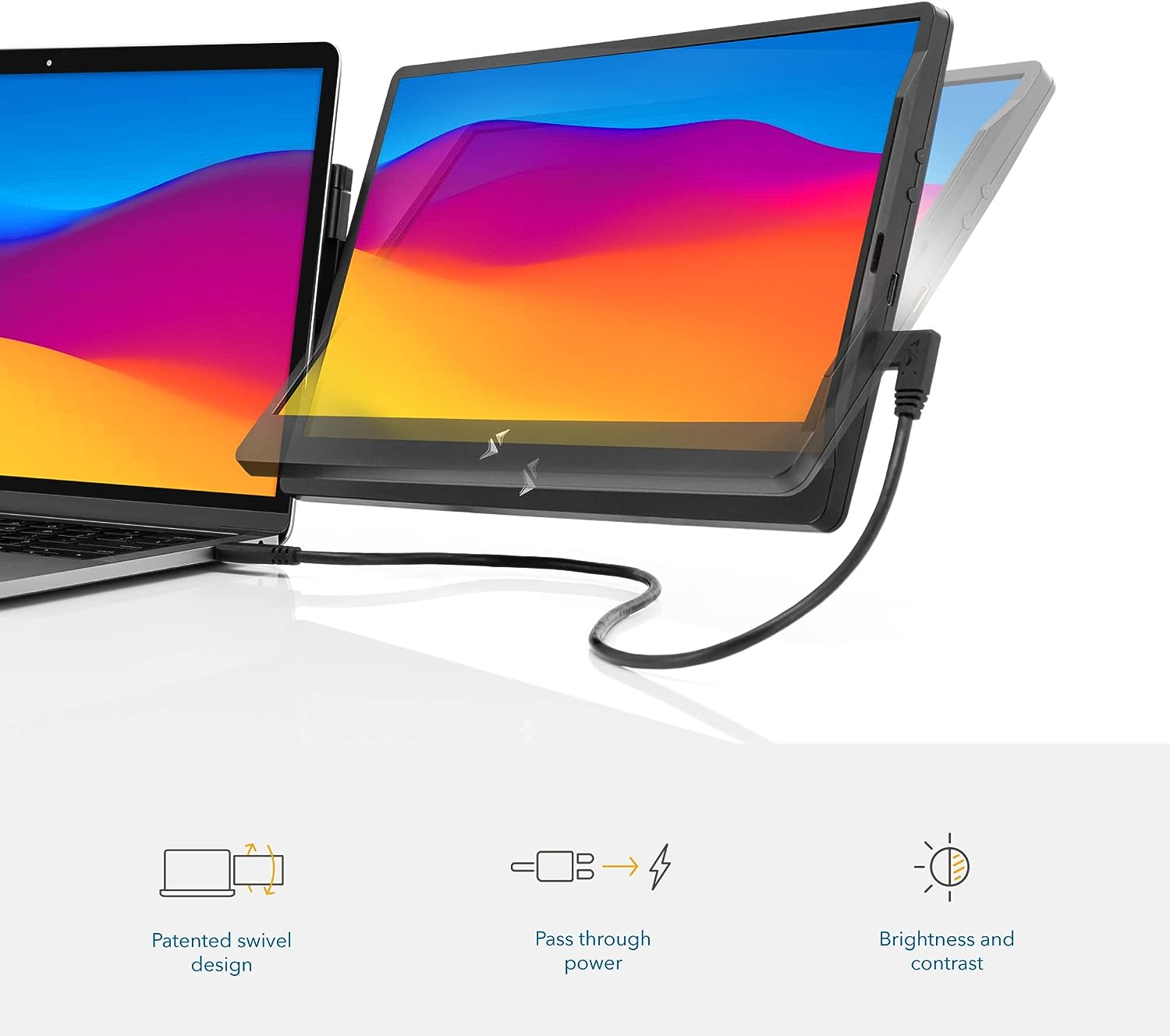 Instantly triple your laptop screen workspace with this game-changing attachable portable monitor technology! SideTrak Swivel Triple includes two FHD IPS monitors that magnetically attach to the back of your laptop with metal plates so you can effortlessly work anywhere with three screens. SideTrak Swivel is the most portable monitor on the market and the perfect laptop companion whether you are working from home, in the office, or on-the go! UNSTOPPABLE PRODUCTIVITY Whether you are on a zoom call or working on an important project, three screens allow you to easily reference documents and take notes with more screen real estate. PRODUCTIVITY THAT MOVES WITH YOU SideTrak Swivel Triple’s lightweight, durable, and slim design is built for your life on-the-go! It weighs only 3lbs and fits in most work bags so that you can carry it between your home and office. TRANSFORM THE WAY YOU COLLABORATE Conveniently share your amazing ideas with coworkers and clients! These portable monitors are designed to mirror, rotate 270°, swivel 360° and autorotate ENJOY LIFE BEYOND WORK Relax after work by switching your new portable monitors to freestanding mode and connecting to a PlayStation, Xbox, or Switch. COMPATIBLE WITH YOUR DEVICE These portable monitors do not require a download and is compatible with most devices and operating systems including Mac, PC, Chrome, PS4, Xbox, & Switch. Its compact, innovative attachment is designed to fit any laptop size and its mounting frame allows it to transition to a freestanding monitor. This setup is not compatible with any MacBook with an M1 chip without a docking station. Check the ports on your laptop prior to purchasing this bundle, each monitor requires 1 USB-C port with power or both a USB-C/A and HDMI port.