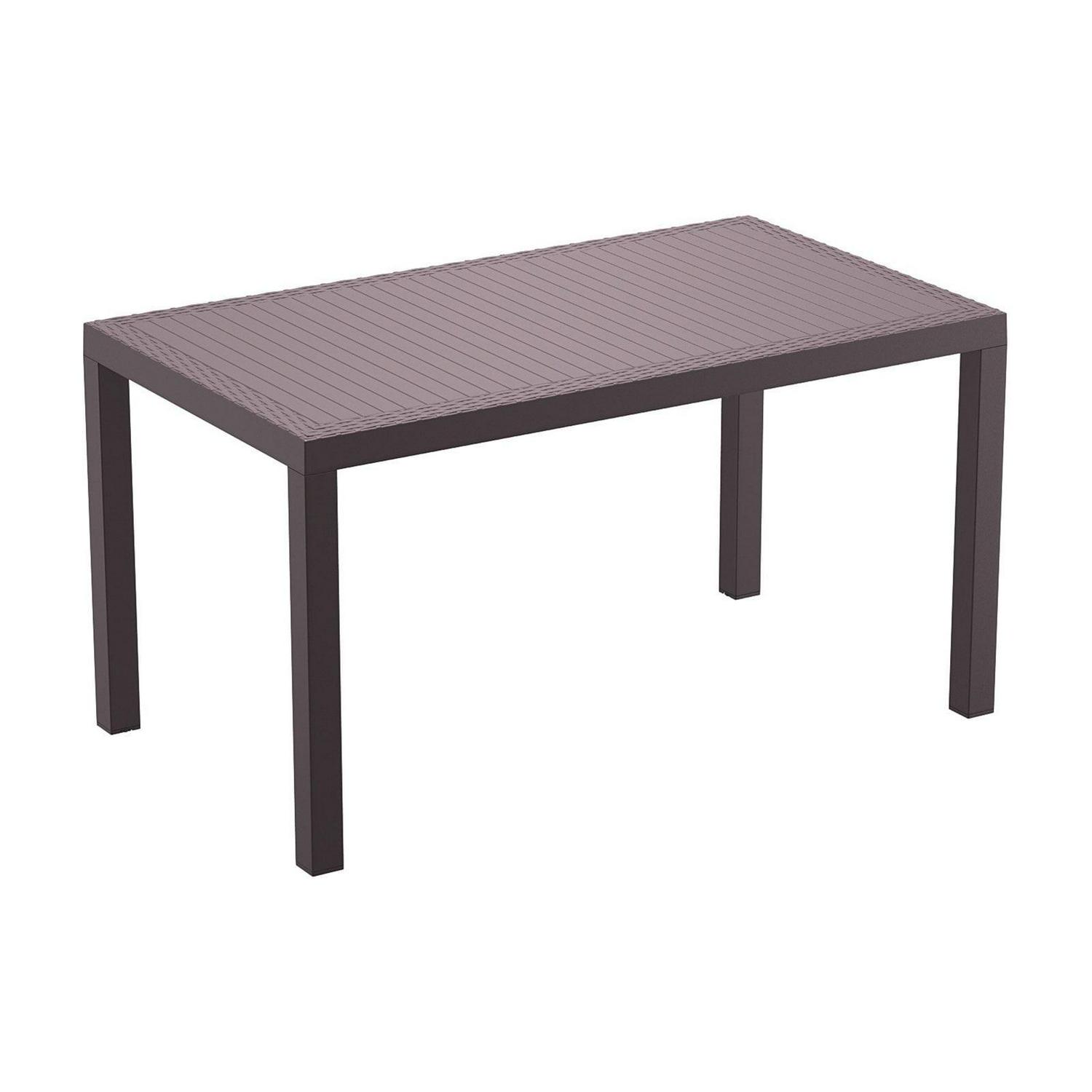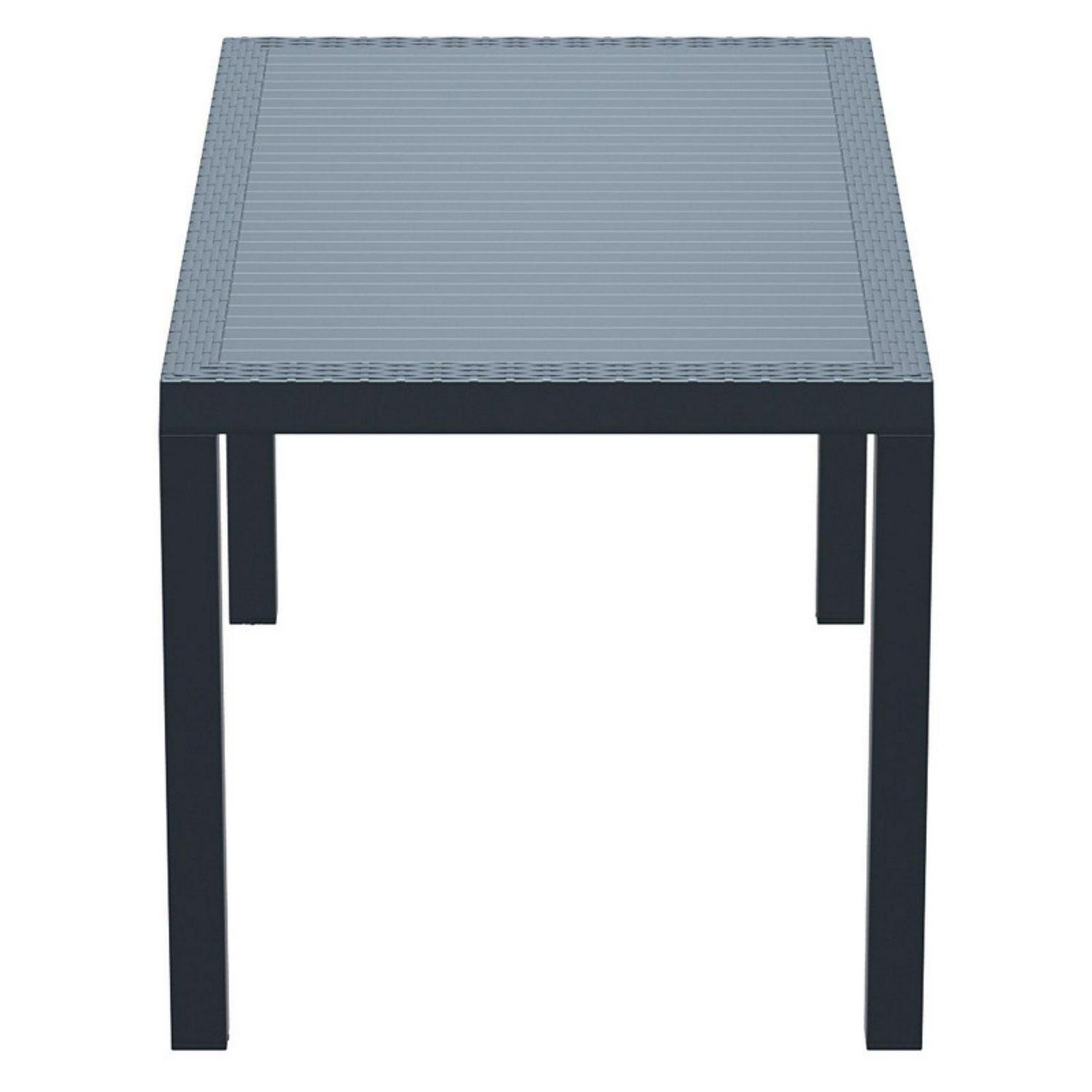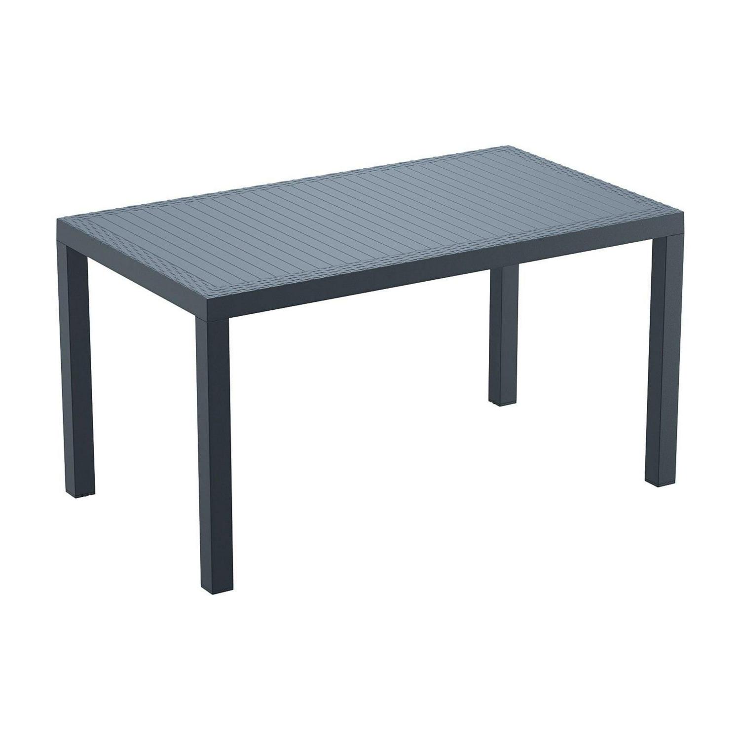 Dining outdoors is fun when you have this rectangular resin dining table. Rust-free and designed with non-breakable moving parts, this table defines commercial durability. You can use it on the patio, poolside, or even in heavy-use areas. Product Features: Dark gray rectangular outdoor dining table. Wickerlook resin with weave design. No metal parts to rust. No moving parts that can break. Levelers for uneven surfaces. Extremely durable for outdoor temperatures. Preferred for heavy use areas, pool sides, patios, beach and balcony use. Resistant to UV, salt, weather, and sun tanning oils. Easy to clean. Assembly required. Recommended for both indoor and outdoor use. Dimensions: 29″H x 31.5″W x 55″D. Material(s): polypropylene/resin. Note: no hole for umbrella