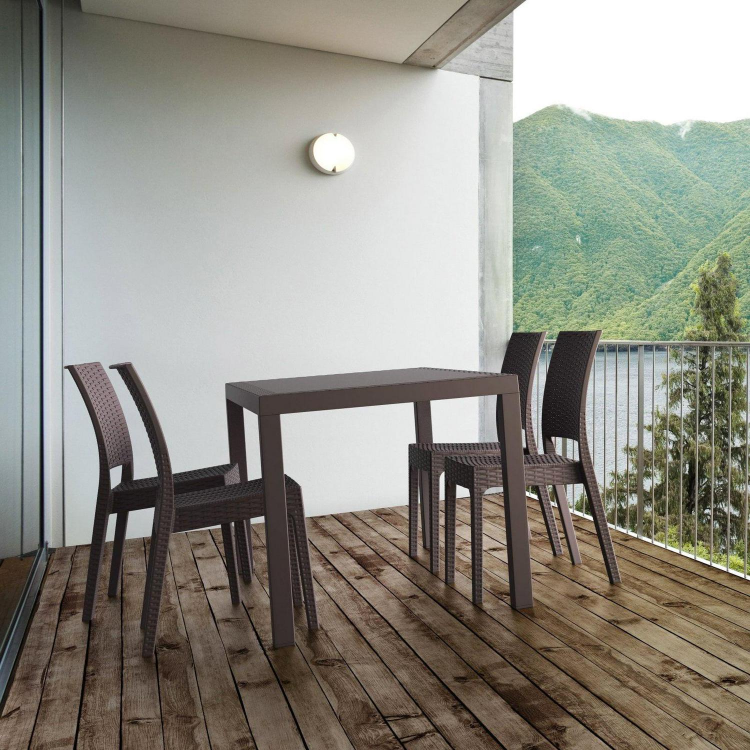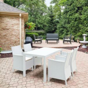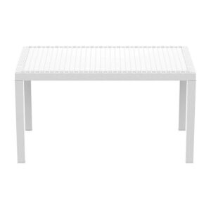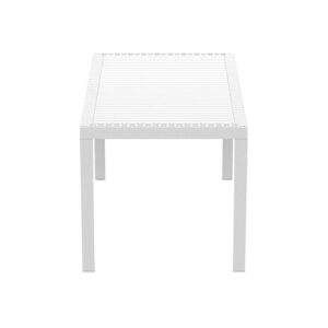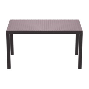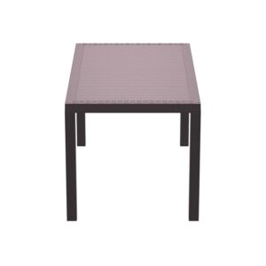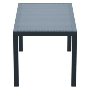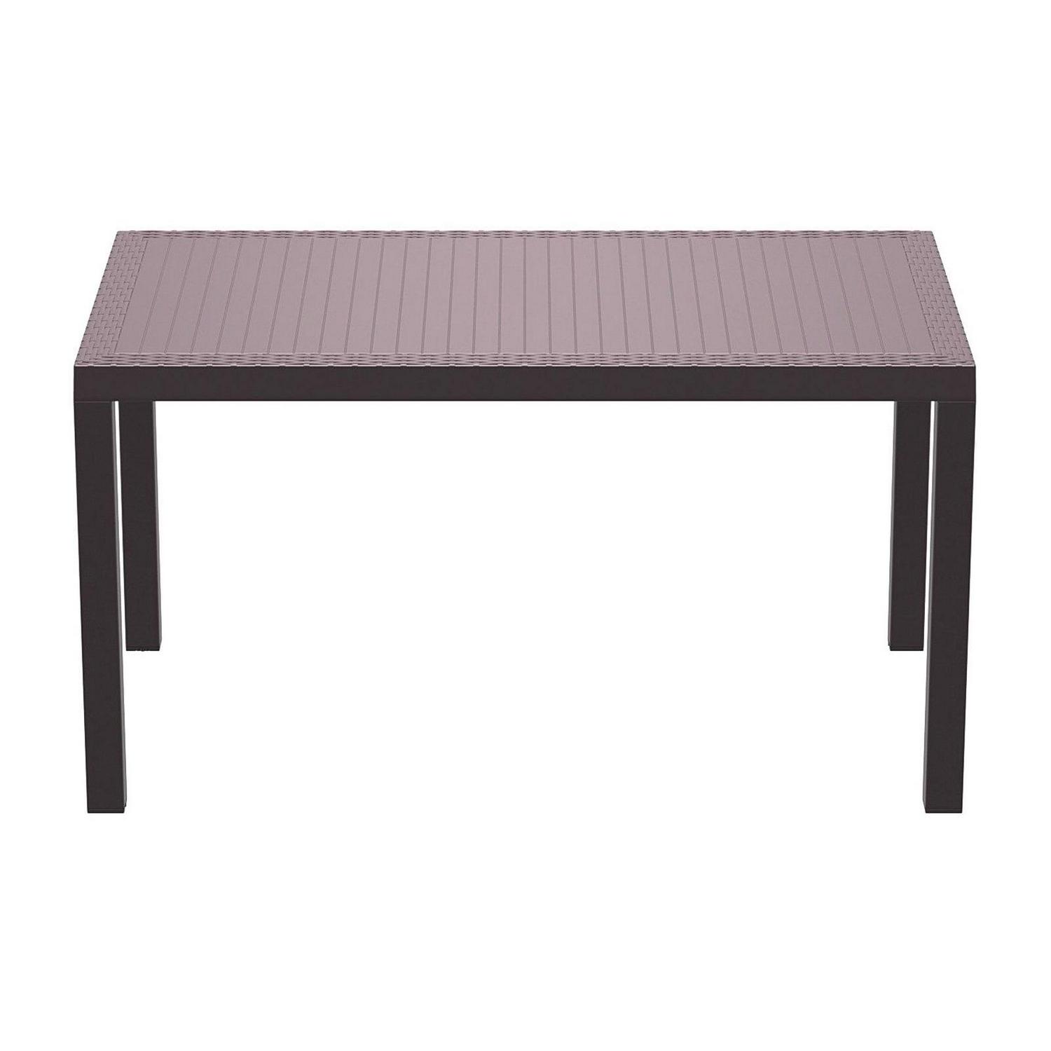 Dining outdoors is fun when you have this rectangular resin dining table. Rust-free and designed with non-breakable moving parts, this table defines commercial durability. You can use it on the patio, poolside, or even in heavy-use areas. Product Features: Dark gray rectangular outdoor dining table. Wickerlook resin with weave design. No metal parts to rust. No moving parts that can break. Levelers for uneven surfaces. Extremely durable for outdoor temperatures. Preferred for heavy use areas, pool sides, patios, beach and balcony use. Resistant to UV, salt, weather, and sun tanning oils. Easy to clean. Assembly required. Recommended for both indoor and outdoor use. Dimensions: 29″H x 31.5″W x 55″D. Material(s): polypropylene/resin. Note: no hole for umbrella