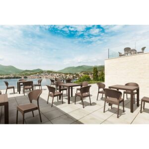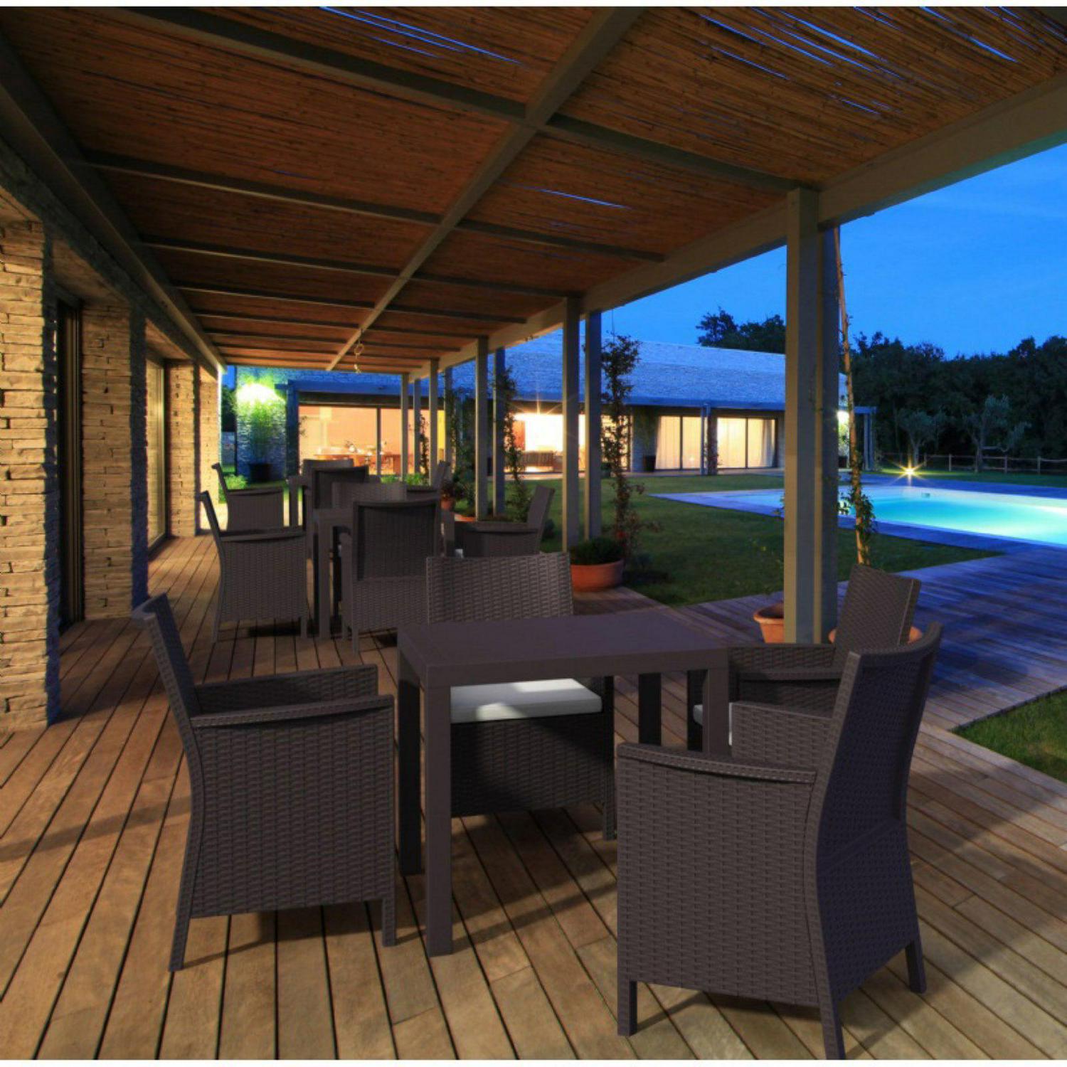 What do you get when you blend the charm of wicker with the indestructibility of Van Damme The Compamia Orlando Resin Wicker Square Patio Dining Table is a close approximation. Its appearance does not change over time, as it’s treated for UV-resistance and made to withstand corrosive influences like salt water, chlorine, and suntan oils. Commercial grade construction makes it a nice choice for heavy use areas, poolside, and for hotels and restaurants, indoors or out. You’ll get the natural looking textural appeal of woven wicker and a smooth top, without the hazard and noise of glass. Non-woven Wickerlook technology affords an open weave design that resembles traditional woven wicker furniture and allows drainage. It’s durable through heat, cold, and rain. Wickerlook never unravels, while any woven furniture piece will, given enough time. And speaking of endgames, it’s 100% recyclable. Simply hose down to clean.