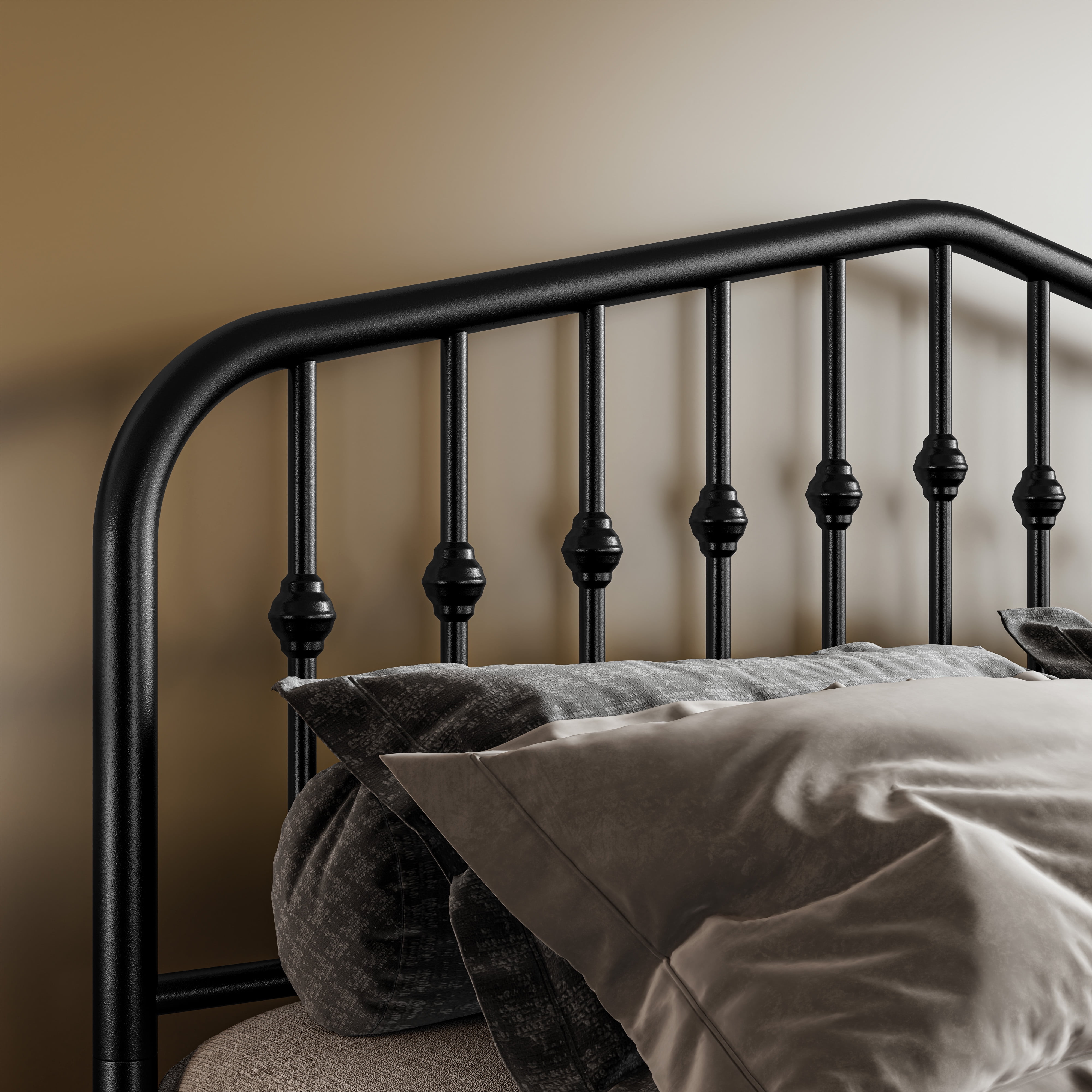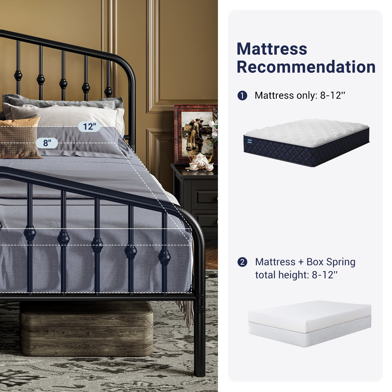 Features: Chic and Classic: The metal bed is designed in a simple but chic style, easy to fit all kinds of room styles. Victorian Headboard and Footboard: Giant metal headboard and footboard with all-around edges, offering considerate protection to you without the mattress moving. Sturdy and Sturdy: Thick metal tube is used in all our beds. Multiple support legs and 12 metal slats add strong support to the bed frame, making it stable and durable. No box spring is needed. Plentiful Storage Space: Plentiful storage space is offered to make your room fully used. Keep your room clean and tidy. Easy to Assemble: Our metal bed frame is made of a simple but strong structure. Insert design of metal slats shorten assemble time. In less than 40 minutes, you can finish the assembly. Specifications: Size: Full / Queen / King Box Spring Needed: No Style: Victorian Vintage Color: Black Material: Metal Package Included: Bed frame, slats, headboard, hardware, instruction, footboard (Mattress not included) Assembly Required: Yes Maximum Weight Recommendation: 800 Pounds Dimension: Full: 78.4″ * 54.7″ *44.7″ Queen: 82.9″ * 61″ *44.7″ King: 83.1″ * 77.2″ *44.7″