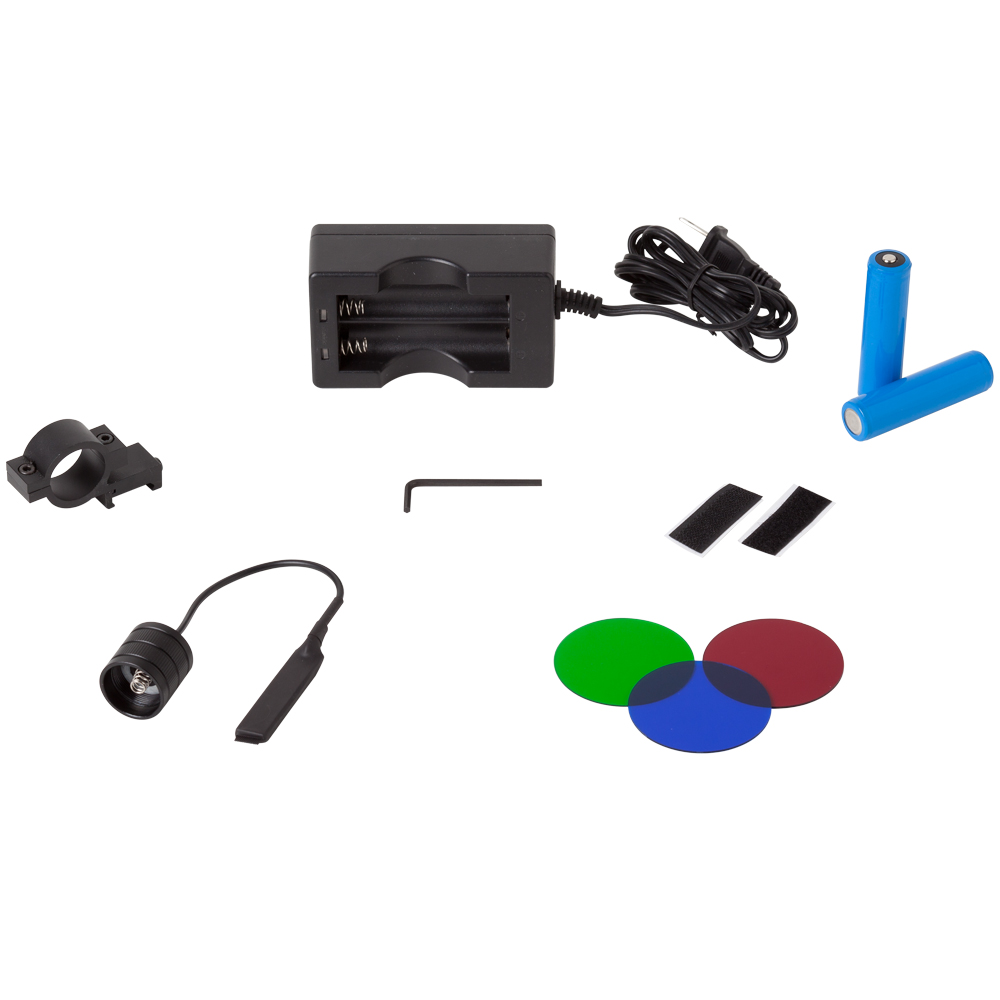 Features Cree LEDs to provide 2000 lumens of light Constructed with Type II mil-spec anodizing aircraft-grade aluminum 3 Settings: 2000 lumen, 280 lumens, and Strobe Equipped with 2 rechargeable batteries, battery recharger, a weapon mount, on/off push button, and pressure switch Includes 3 Filters: Green, Red, and Blue Recoil resistant and waterproof Model# SM73008K