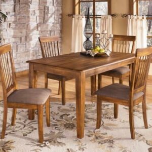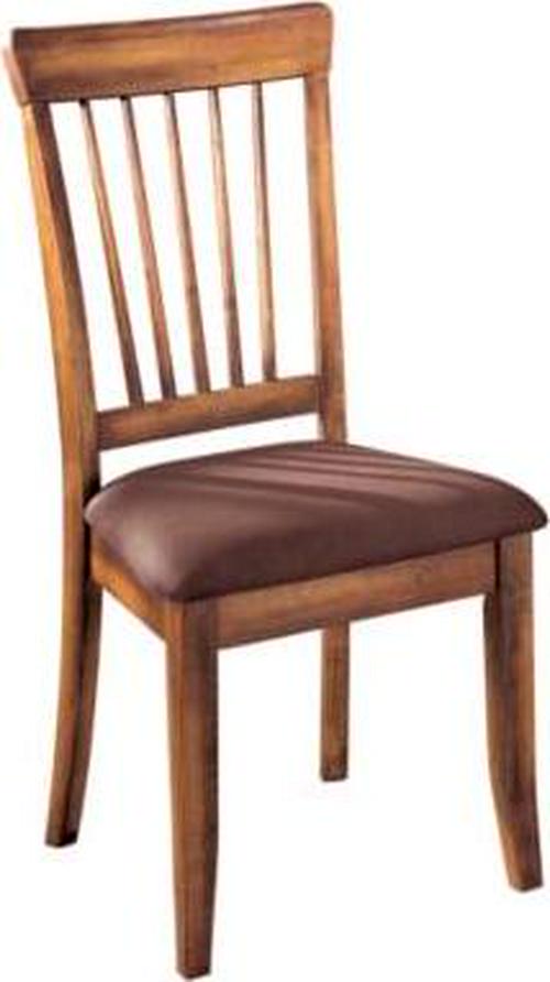 Berringer serves up elegance family style. The rich, rustic finish and simple profile are always in vogue, whether your aesthetic is vintage, country or traditional. Upholstered side chair has a classic spindle back and seat covered in easy-to-maintain microfiber.
