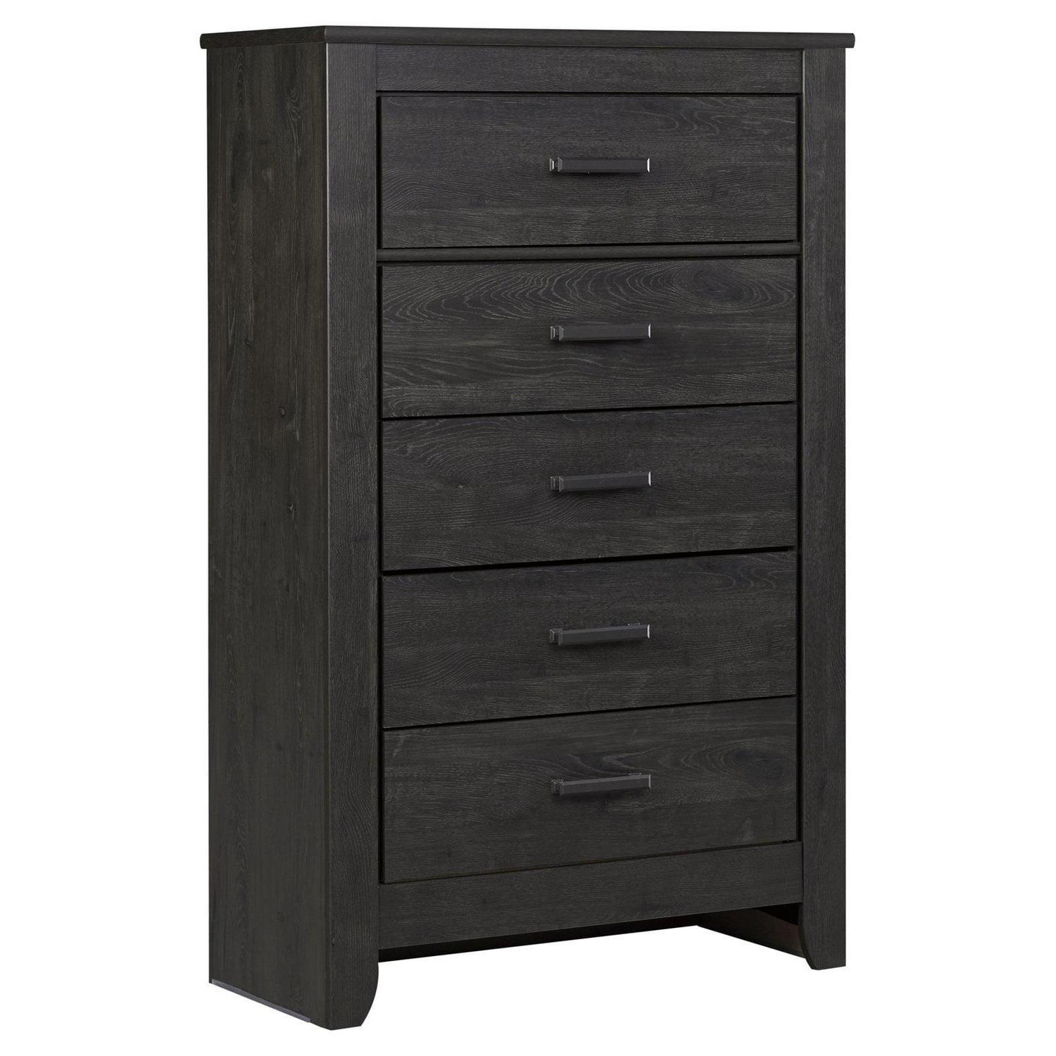 For modern style with rustic charm, the Signature Design by Ashley Brinxton 5 Drawer Chest features a charcoal gray finish over a replicated oak grain. For abundant storage, this dresser includes five smooth-glide drawers. Linear pulls in a dark pewter tone complete the look. Assembly required.