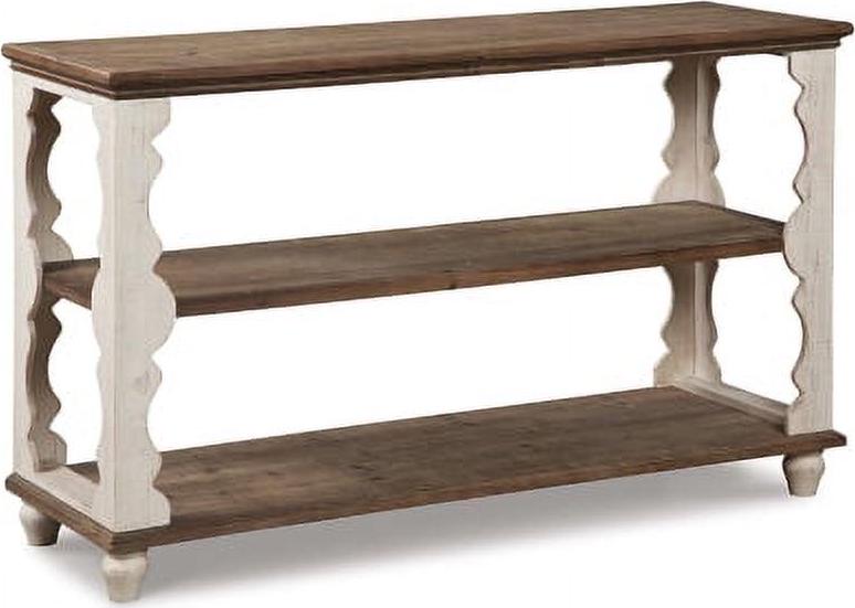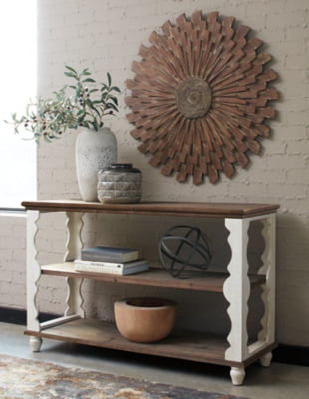 Simply put, the Alwyndale console sofa table is minimalism with maximum charm. Naturally finished knotty wood combined with antiqued white is an artful combination. But what really makes this console sofa table so spectacular: scalloped woodwork you just don t see every day.