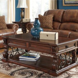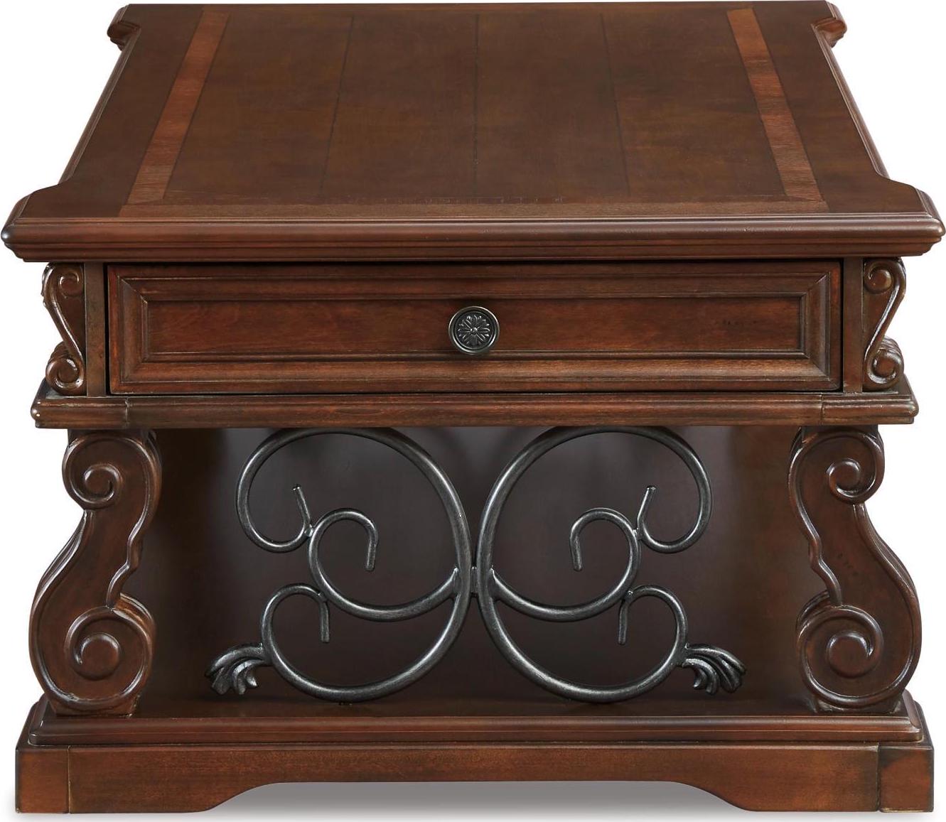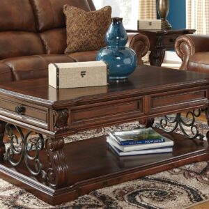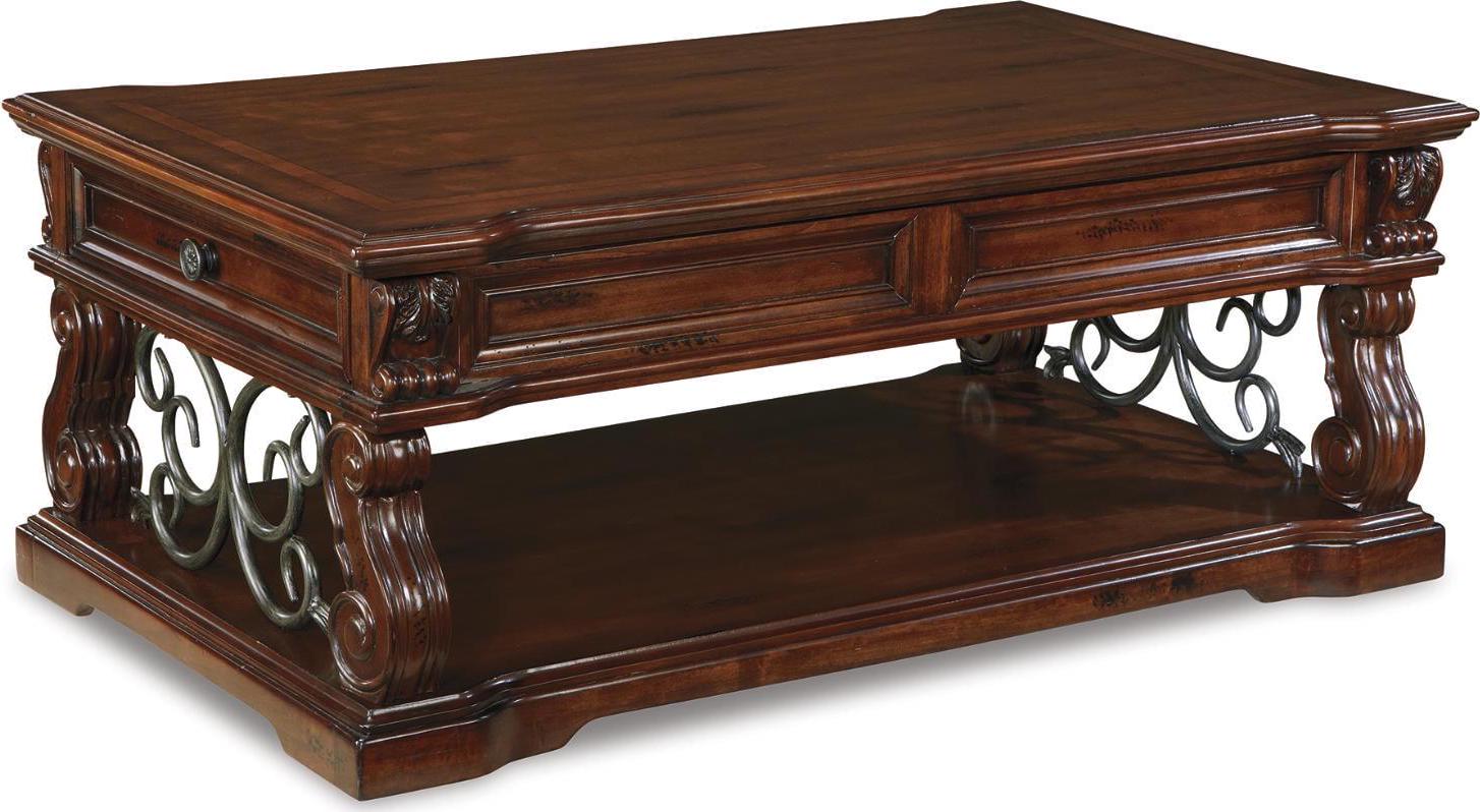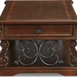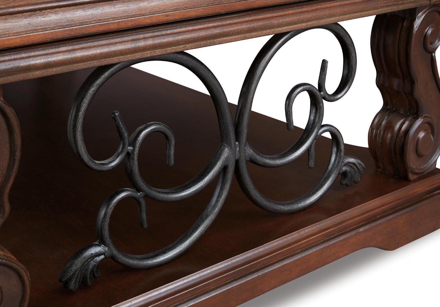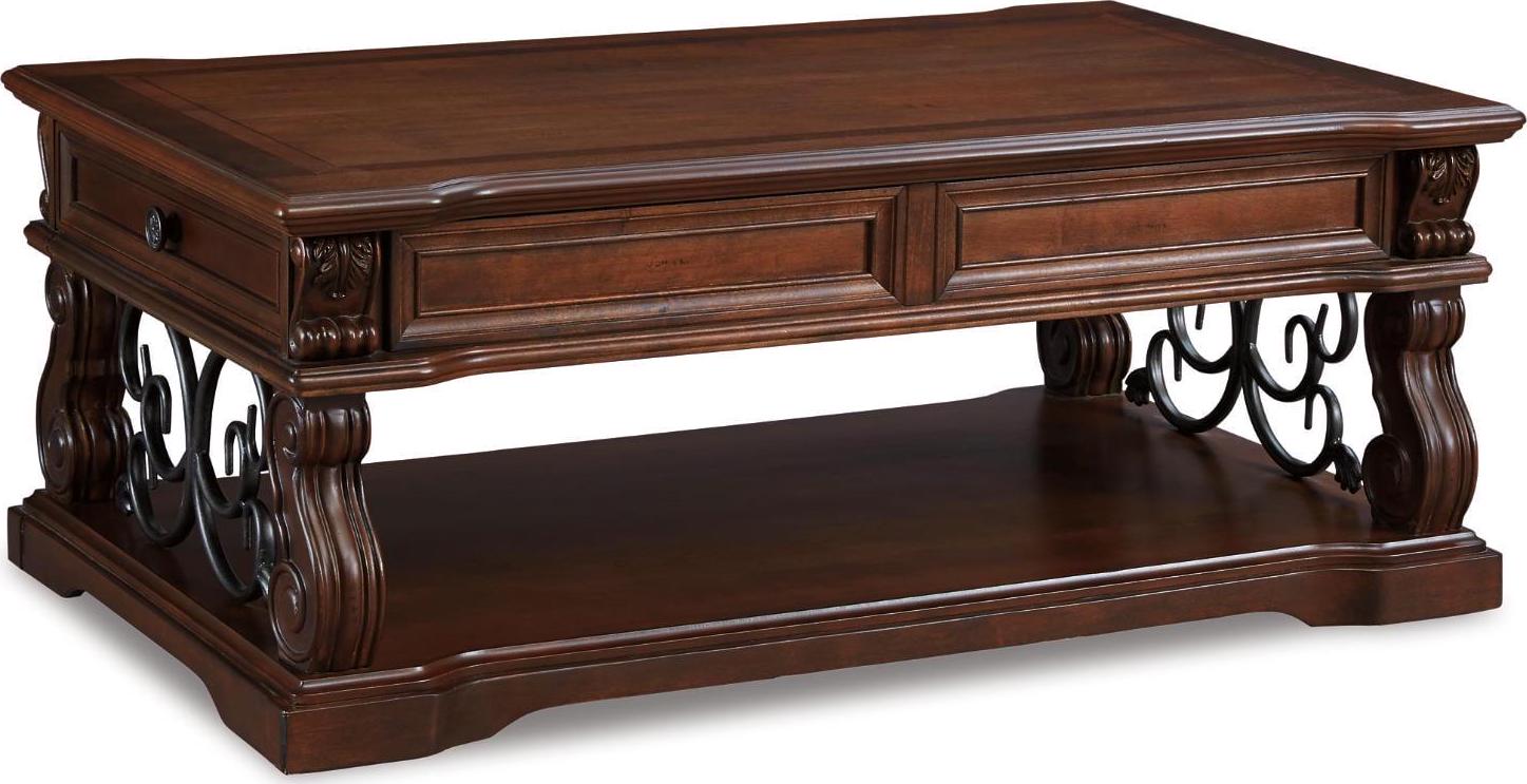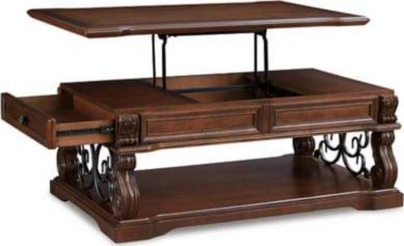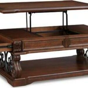 Rich wood and rustic metal work so well together in the Alymere lift top coffee table. We love how the curvaceous shape of the table s serpentine legs is echoed in the scrolled metal accents for a modern-classic style that s substantial without being heavy. This lift top table is ideal for informal dinners in front of the television, adding function to great form. A fixed shelf provides display space for your favorite whatnots while drawers keep essentials out of sight.