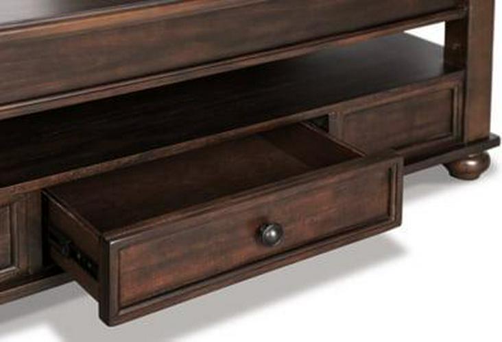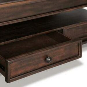 Made of veneer, wood and engineered wood,Rich dark brown finish,Bronze-tone hardware,1 lift top revealing hidden storage,Open middle shelf