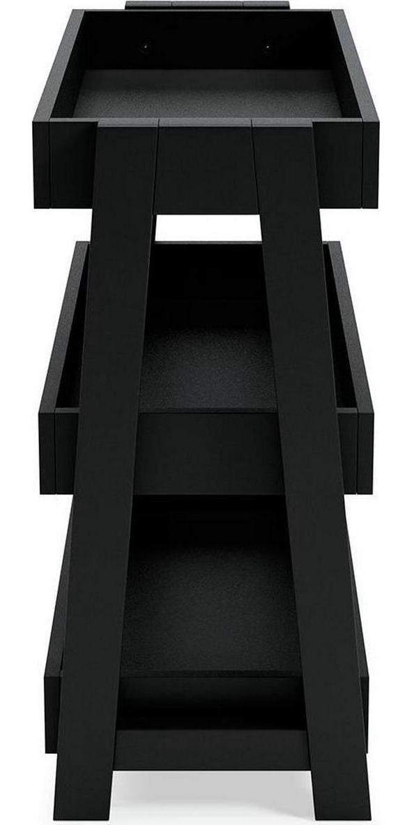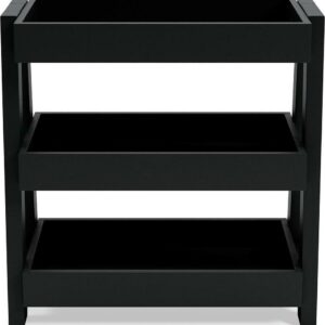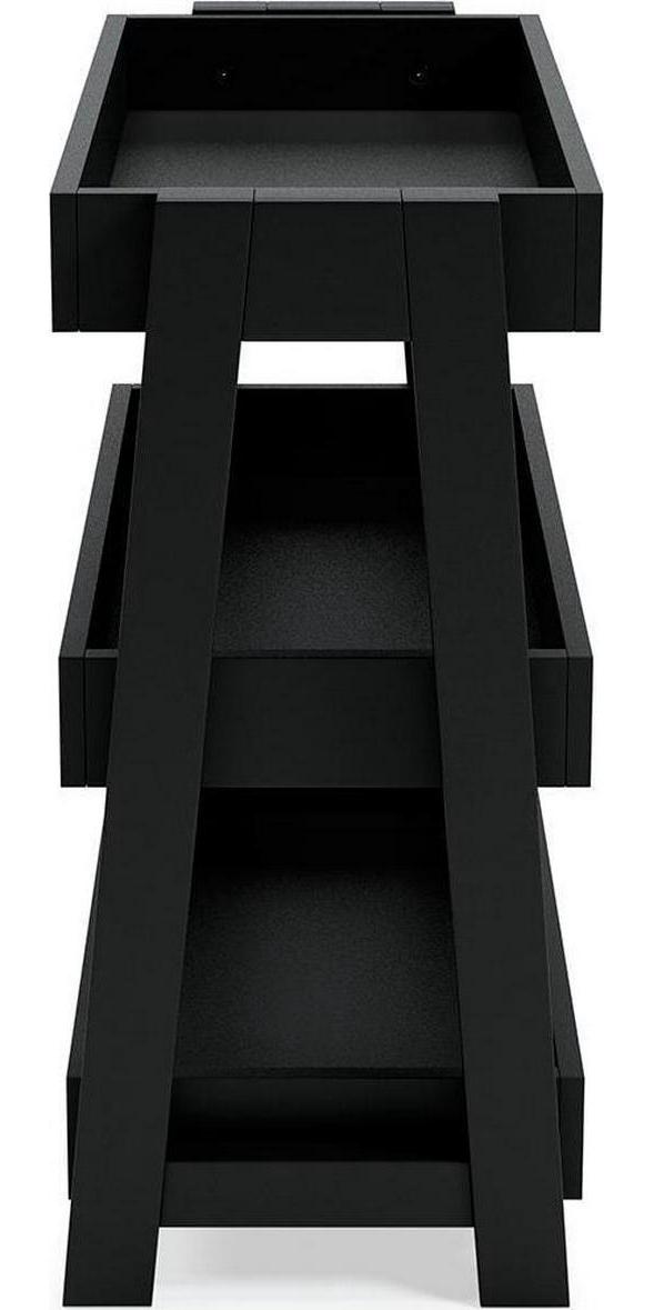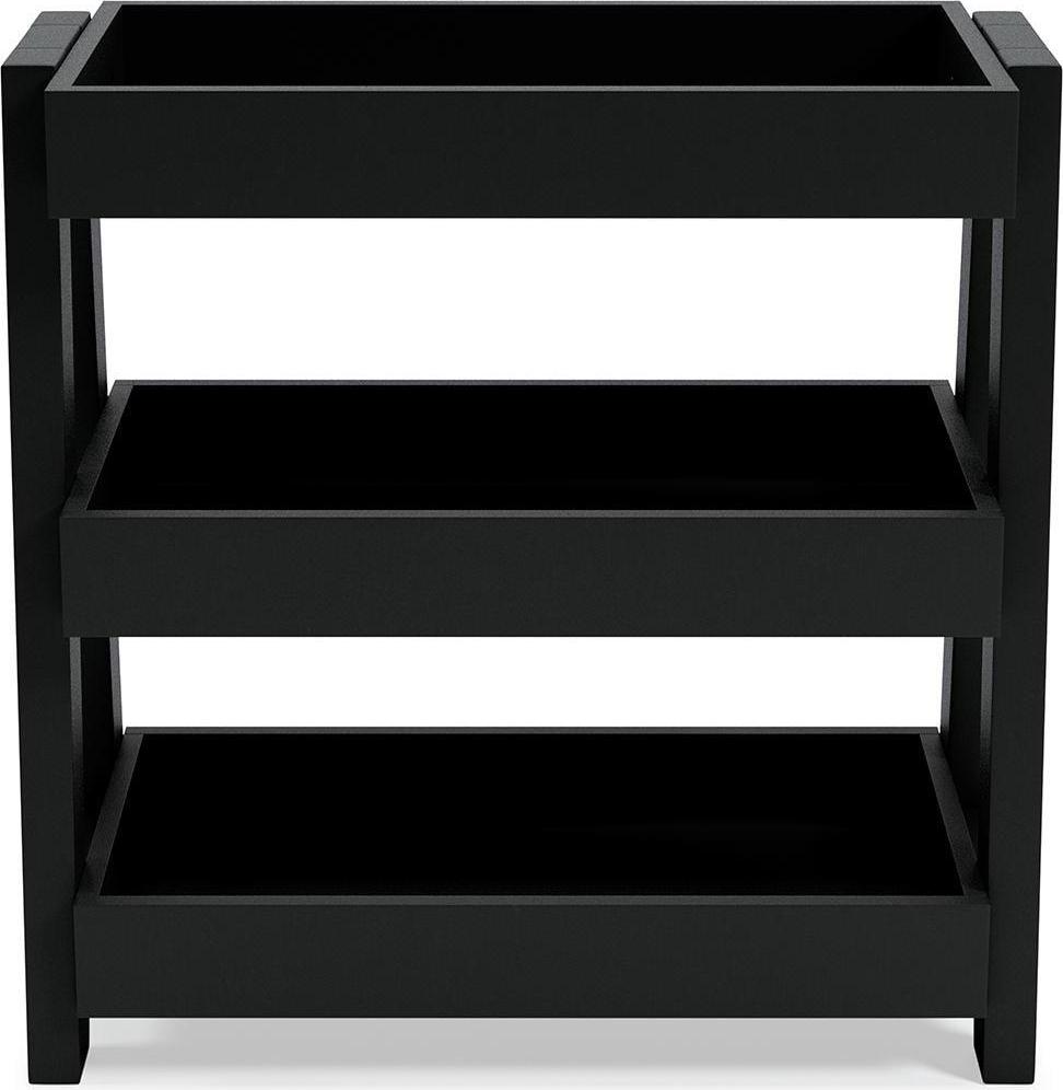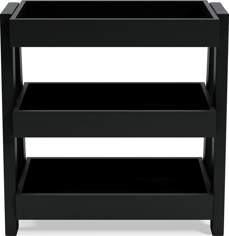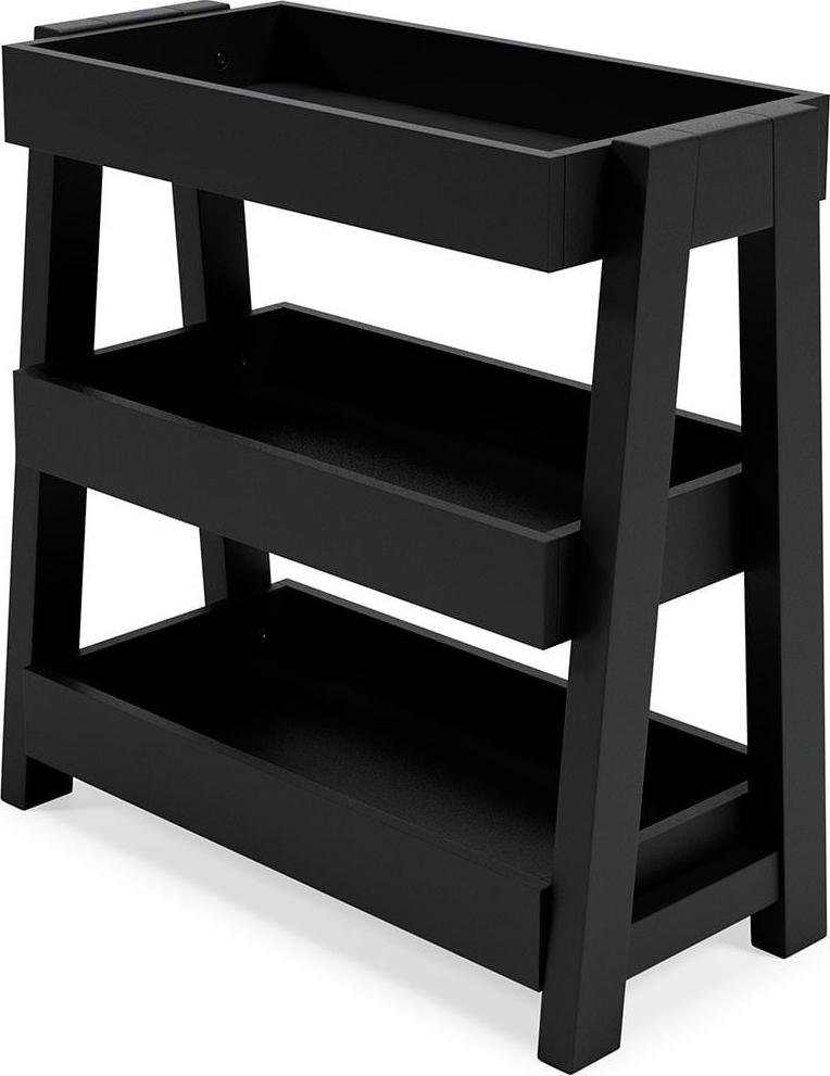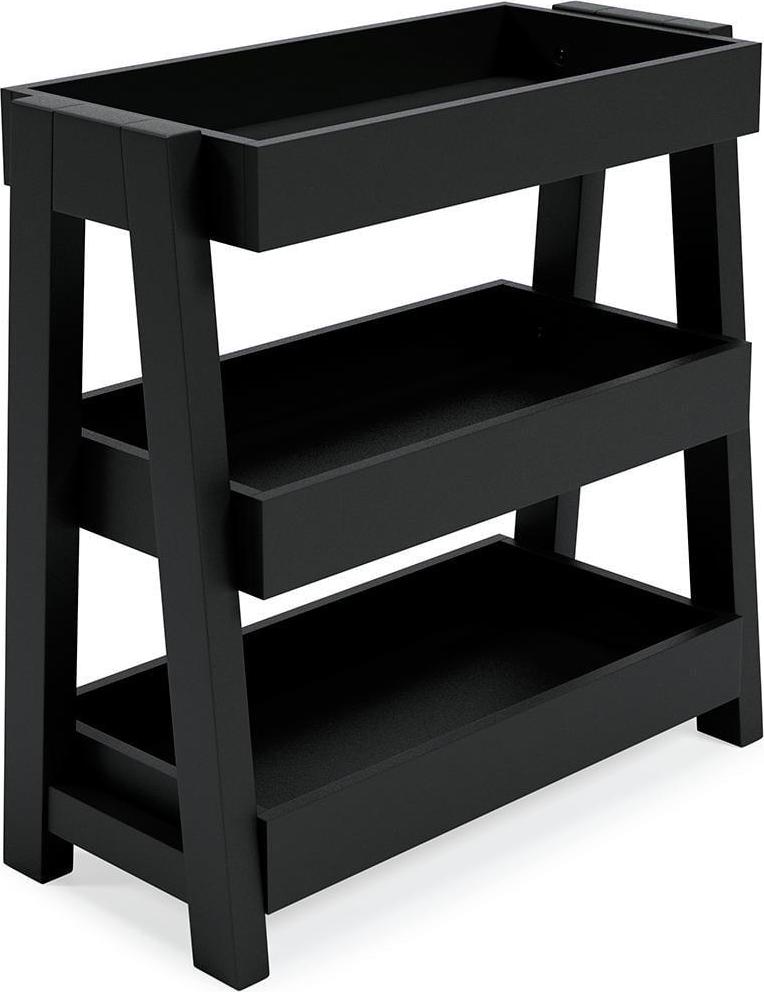 Display your kid’s decor with simple style on the Blariden shelf accent table. Constructed of solid and engineered woods in a dark metallic gray finish, this table blends easily with their existing bedroom or play space decor. Three tray shelves can be used to show off keepsakes and collectibles, or to keep TV remotes handy.
