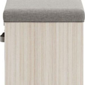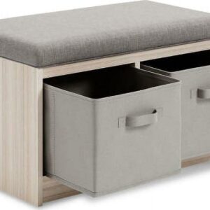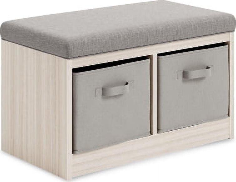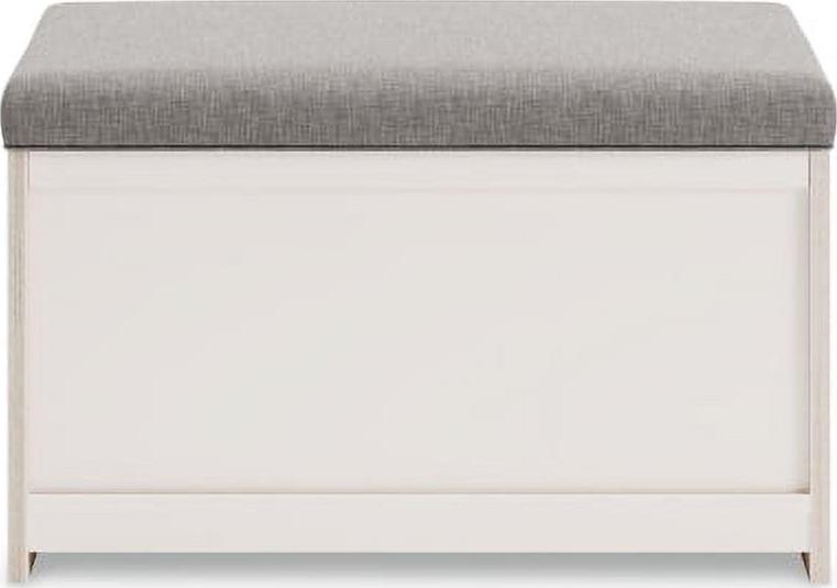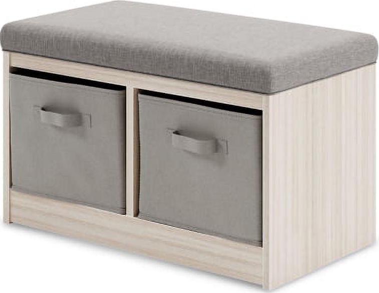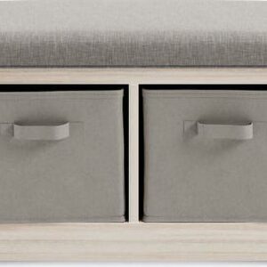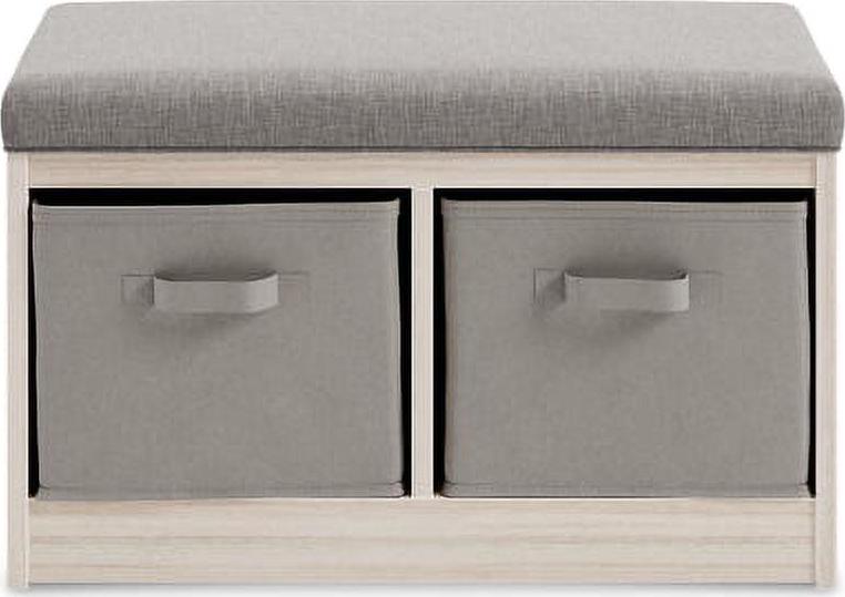 Sit and store in style. Blariden storage bench is topped with a cool gray cushion for a soft touch. Its removable fabric baskets are perfect for storing cold-weather essentials or keeping clutter under wraps. A light tan finish cleanly completes the look. Works wonders in your child’s bedroom or play space.