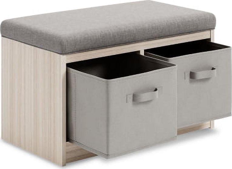 Made with engineered wood and veneer,Gray polyester seat cushion,2 open cubbies, each with fabric basket,Solid wood legs in dark brown finish,Assembly required
