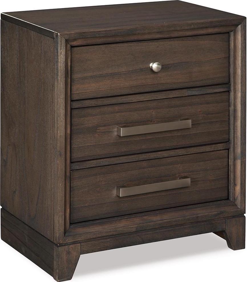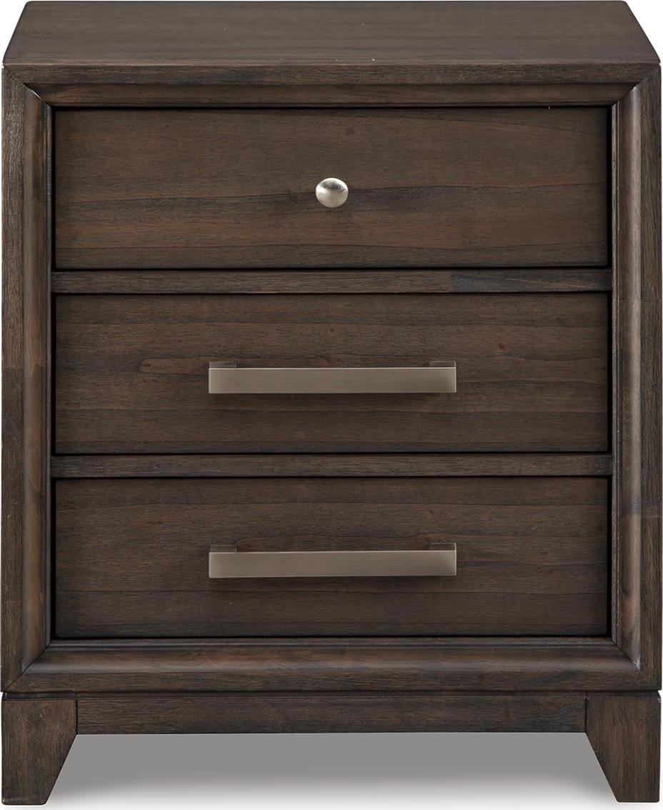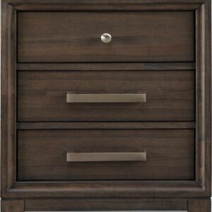 Satisfying your taste for transitional contemporary furniture, the Brueban nightstand sports serene sophistication. A wonderfully clean-lined profile is dramatically enriched with a complex, burnished finish and brushed nickel-tone hardware. Three roomy drawers keep bedside odds and ends within easy reach.