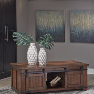 Roll with the ease of a coffee table on casters in farmhouse style. This rectangular Budmore table garners attention with its smooth sliding barn doors, distressed rustic finish and black metal accents. With hidden storage behind its barn doors, you’ll love the extra space for stashing items you want to keep within reach. If you need to move this table, its casters make it simple what a value for adding down-home style with functionality to your living space.