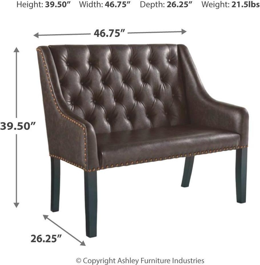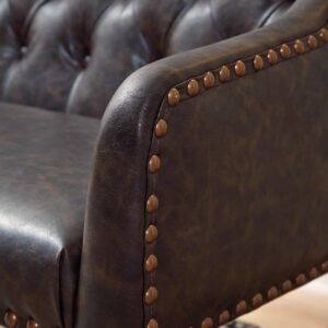 Distressed faux leather upholstery,Button-tufted back cushion,Brass-tone nailhead accents,Wood legs with a dark brown finish,Assembly required