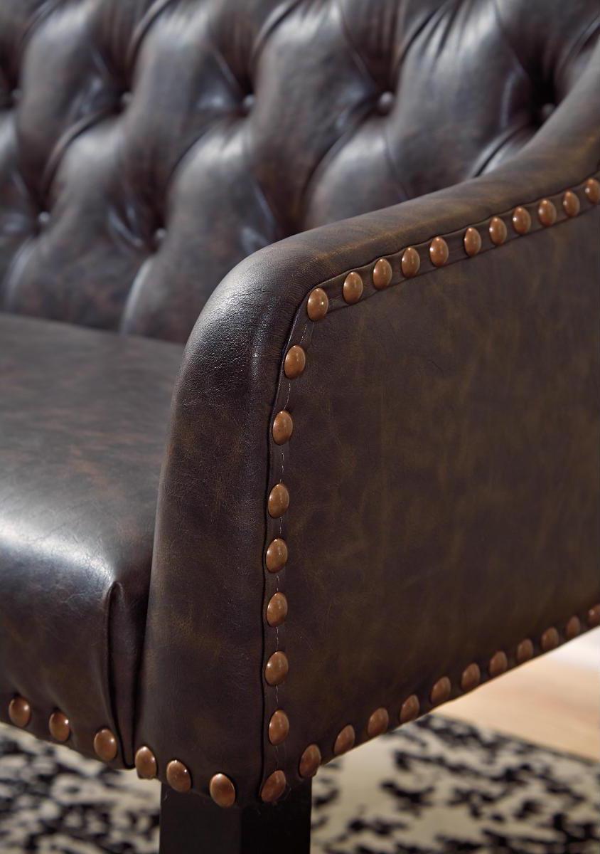 Today s casual lifestyles call for updates to familiar profiles. The Carondelet settee is a refreshing take on traditional seating. Upholstered in a distressed faux leather with button-tufting and nailhead accents, this clean-lined bench is ready to supply extra seating in the dining room, den or entry.